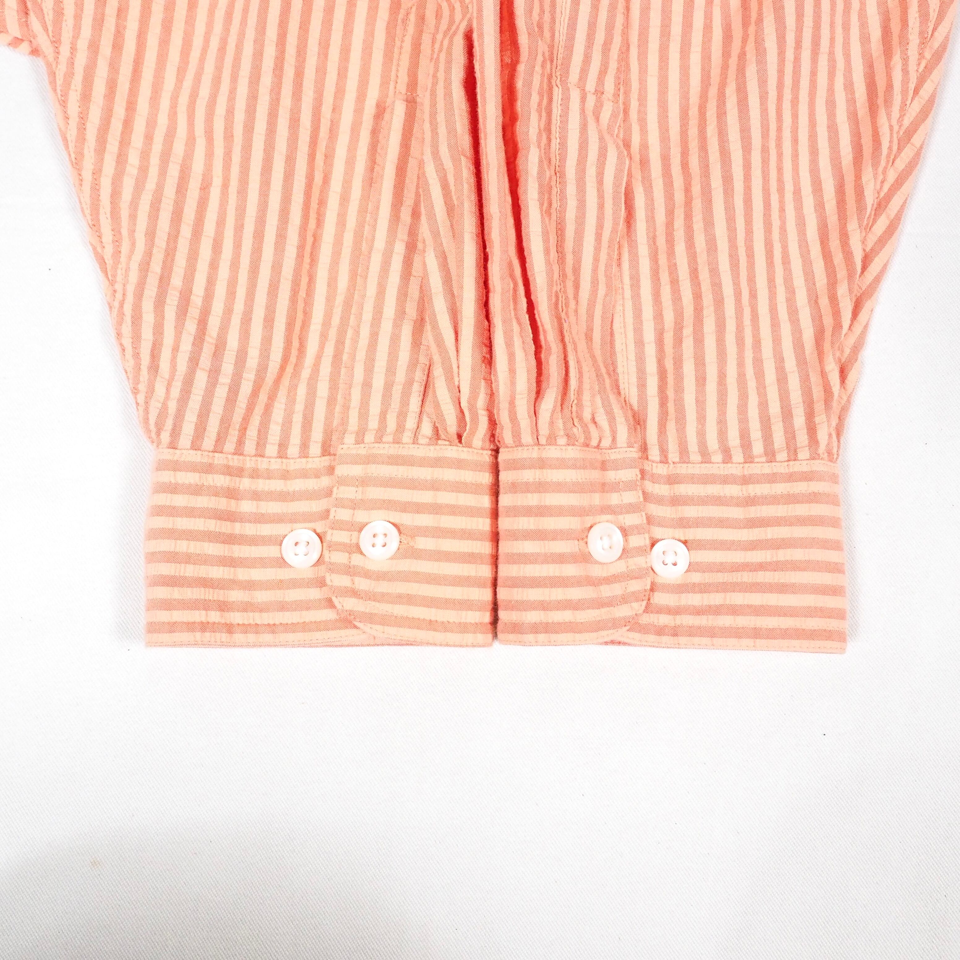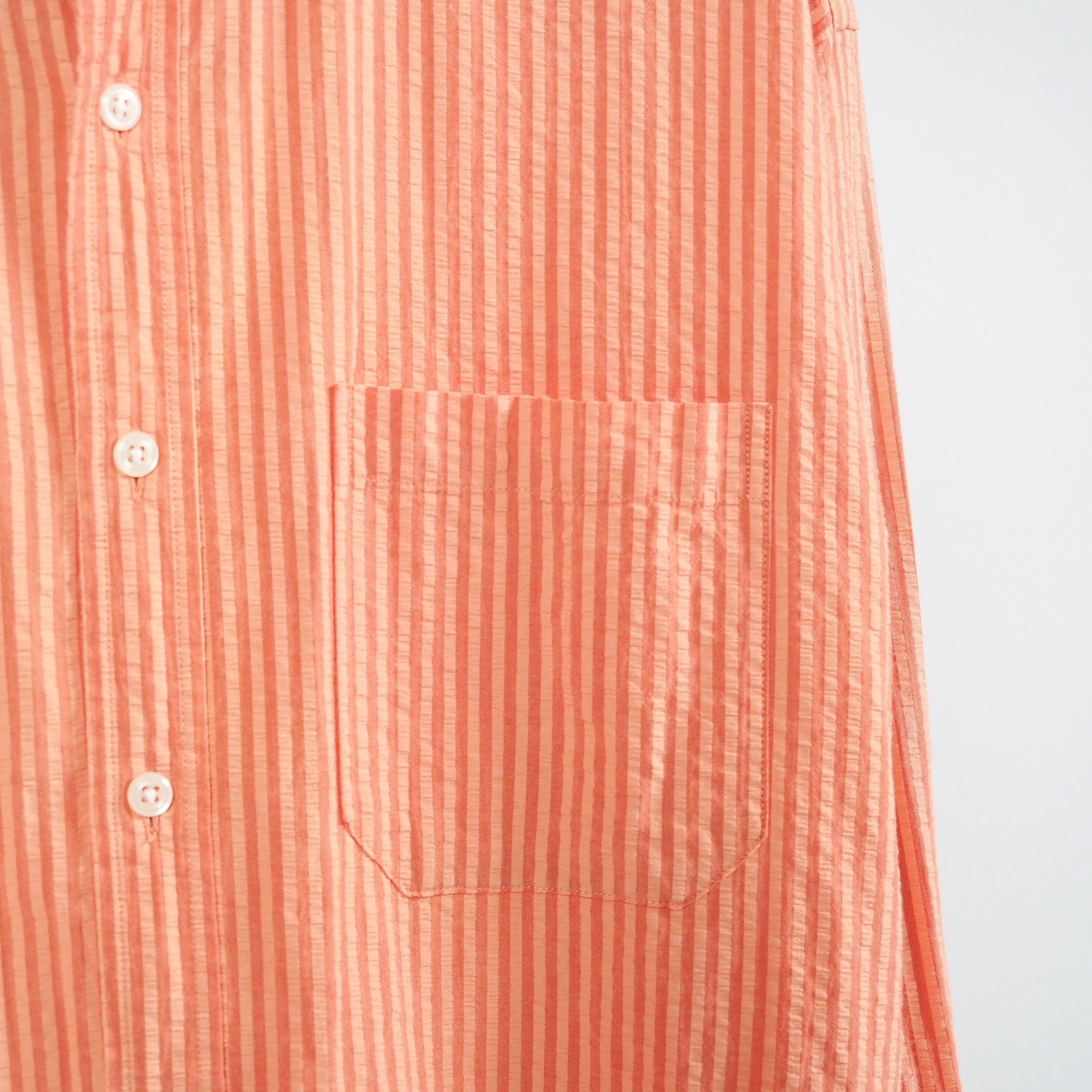 シアサッカー生地の長袖ボタンダウンシャツ。