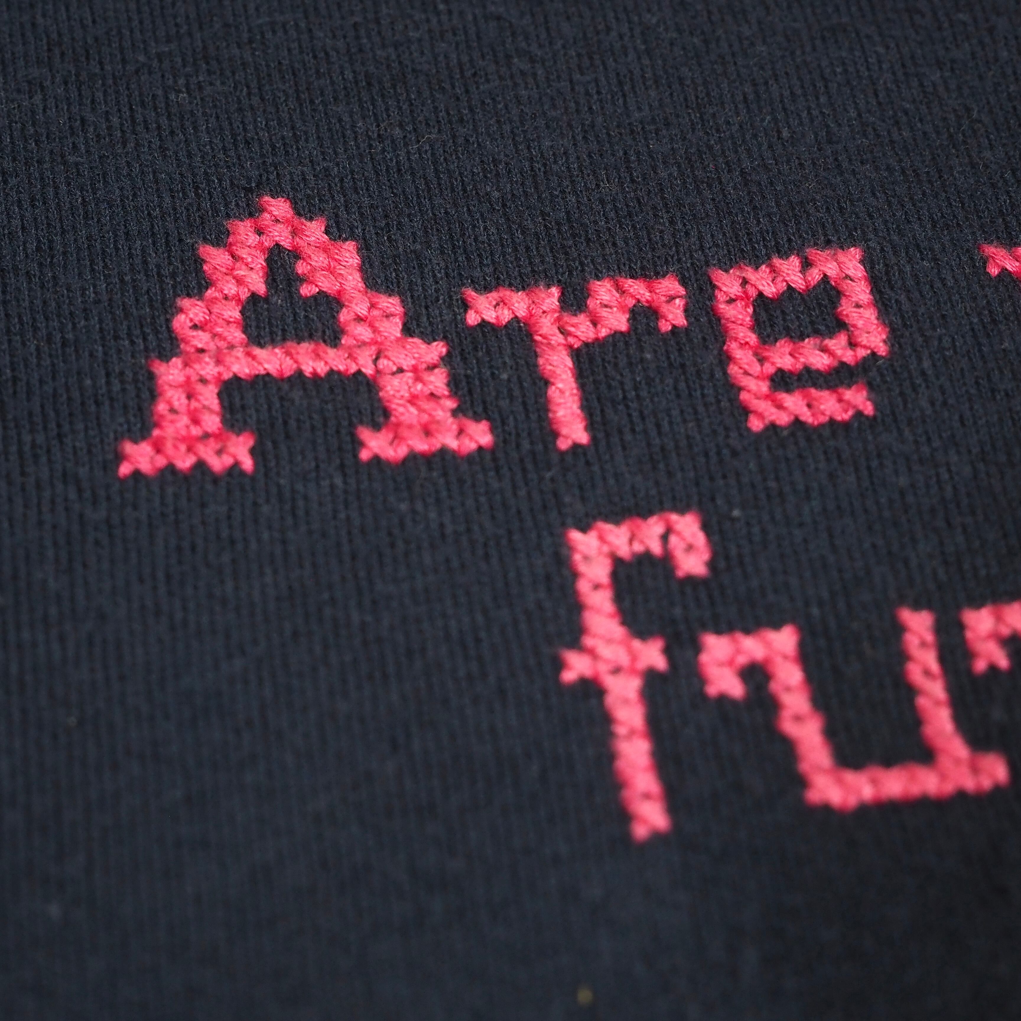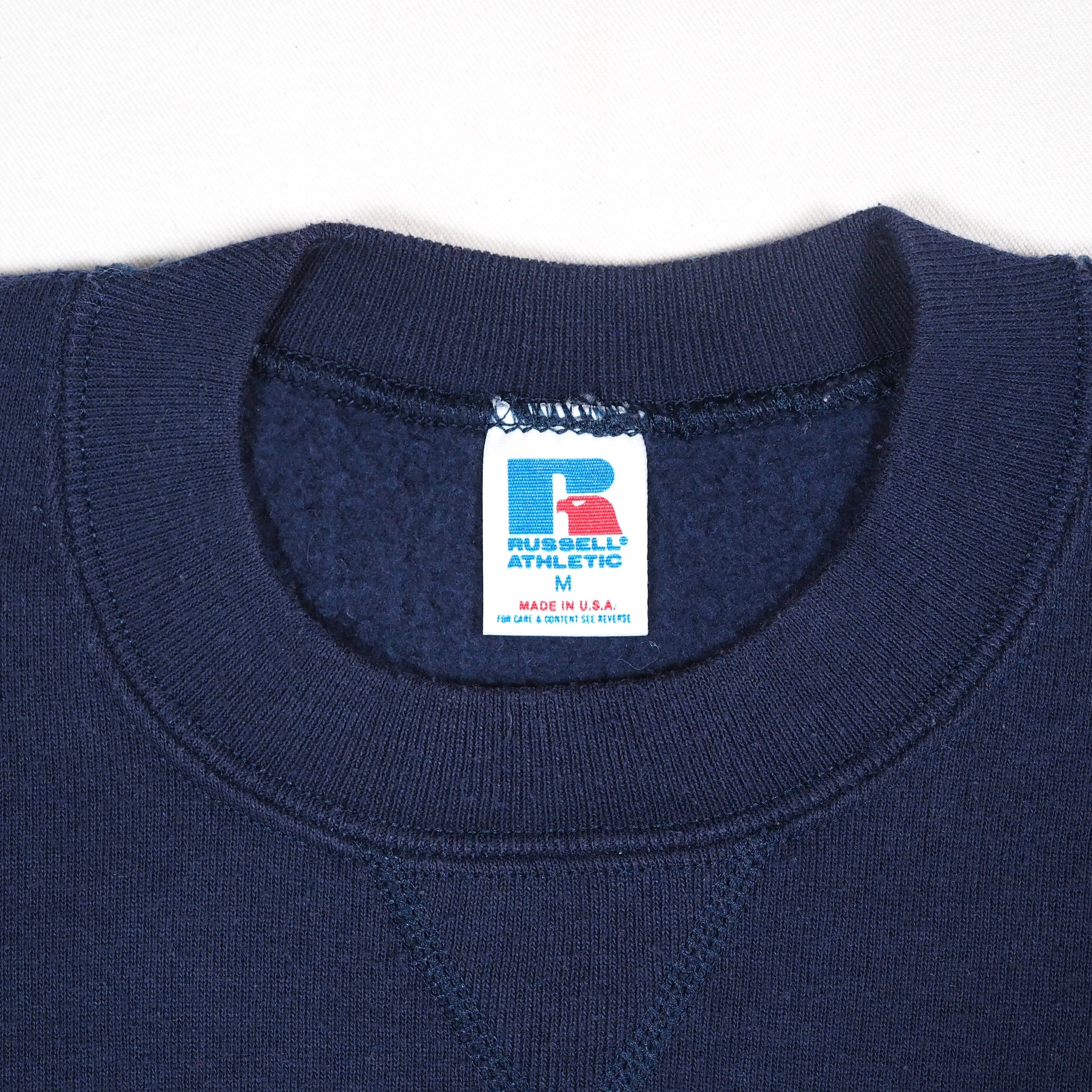 Cross stitch Front V sweat【Are we having fun yet】M RUSSELL 80's USA製 刺繍 前Vスウェット ネイビー