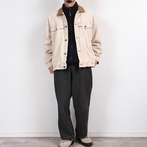 襟レザー、コーデュロイ生地のトラッカージャケット。