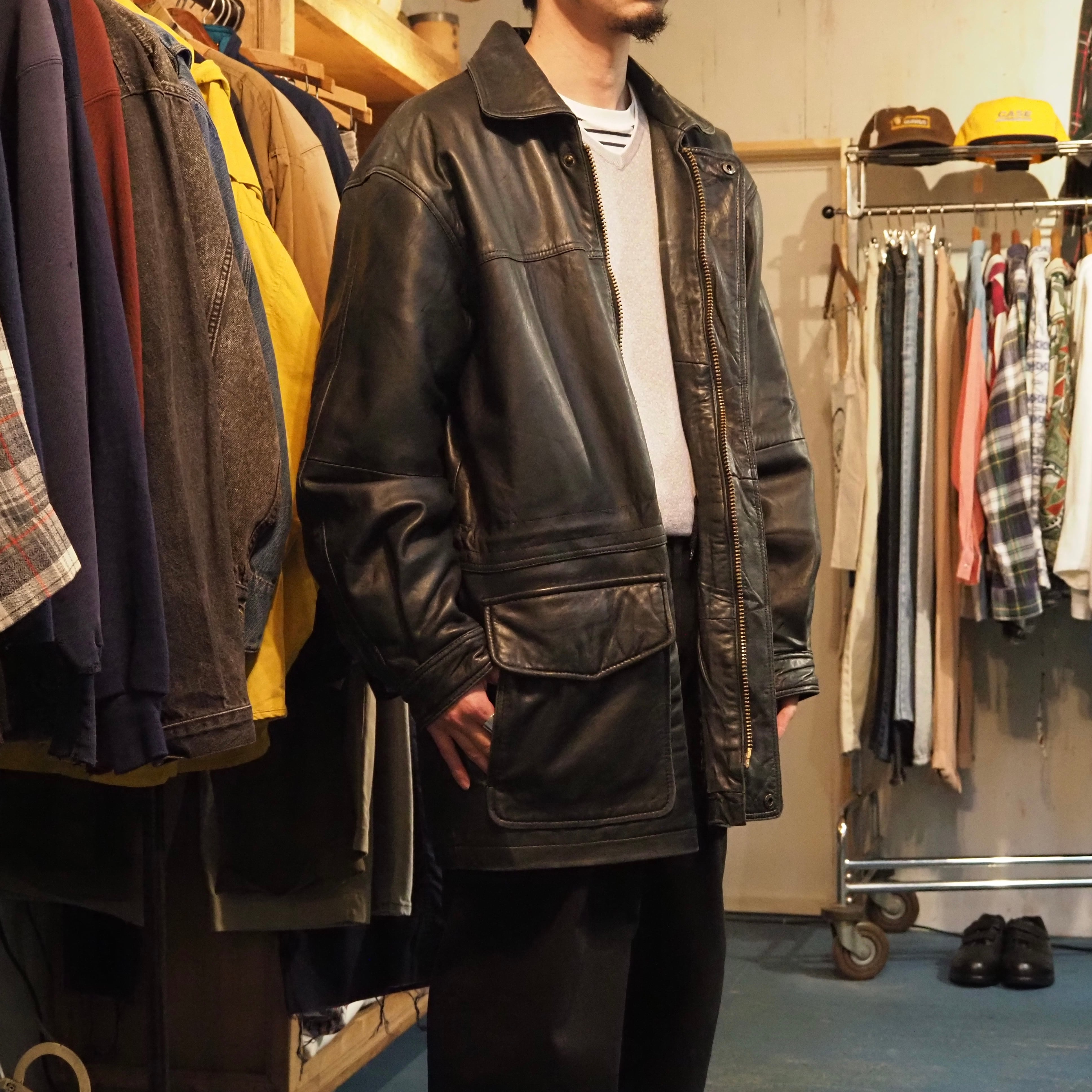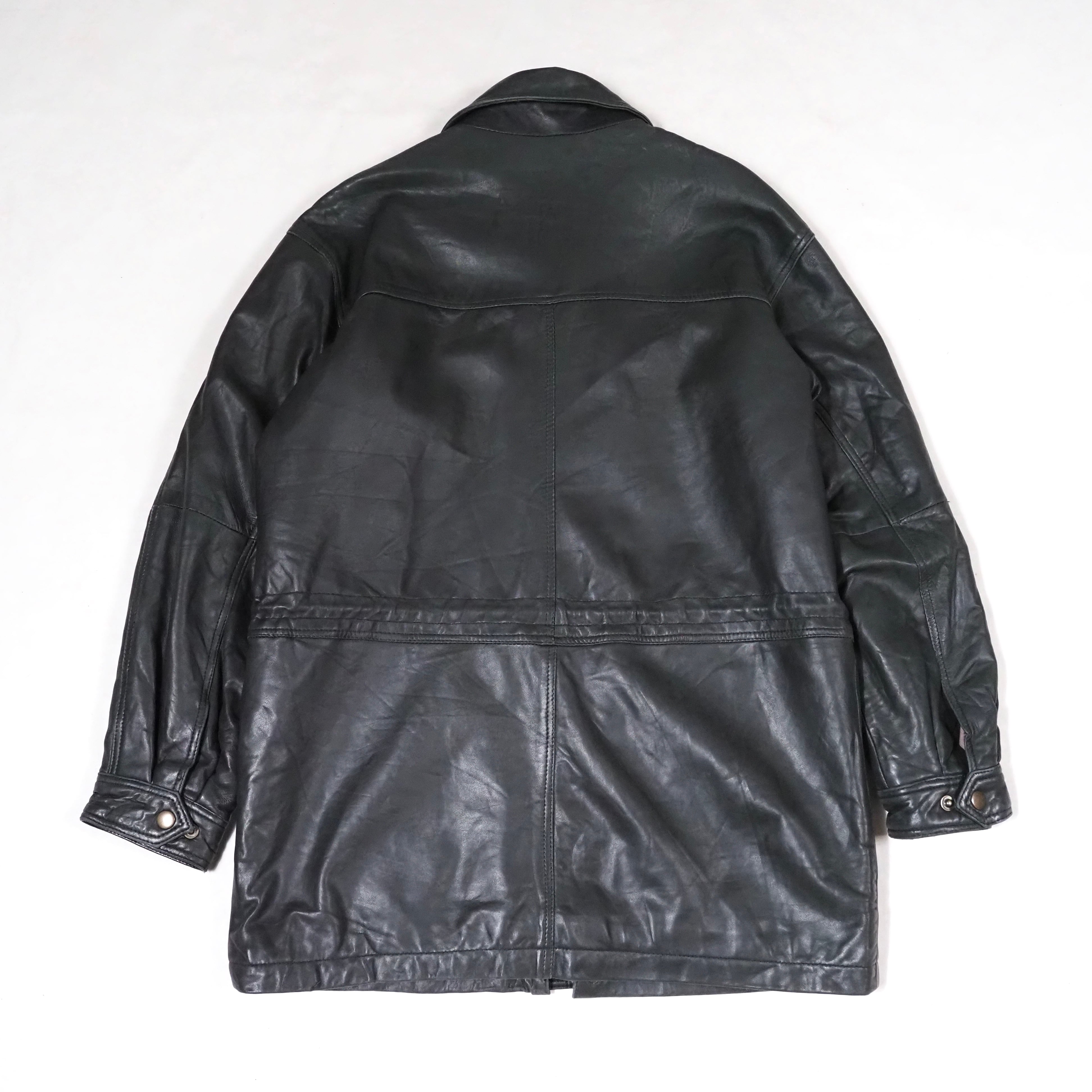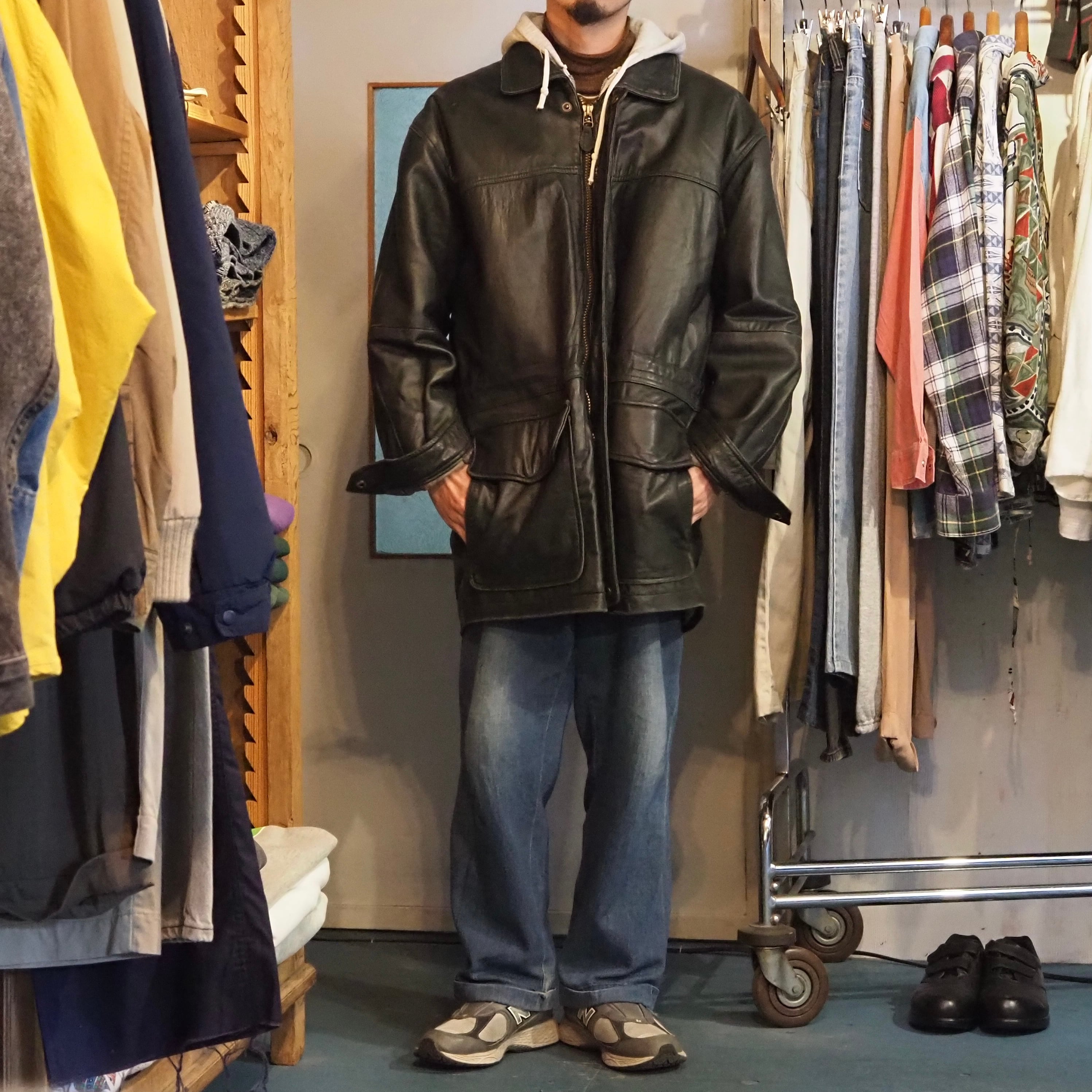 ロング丈ブラックのレザージャケット。