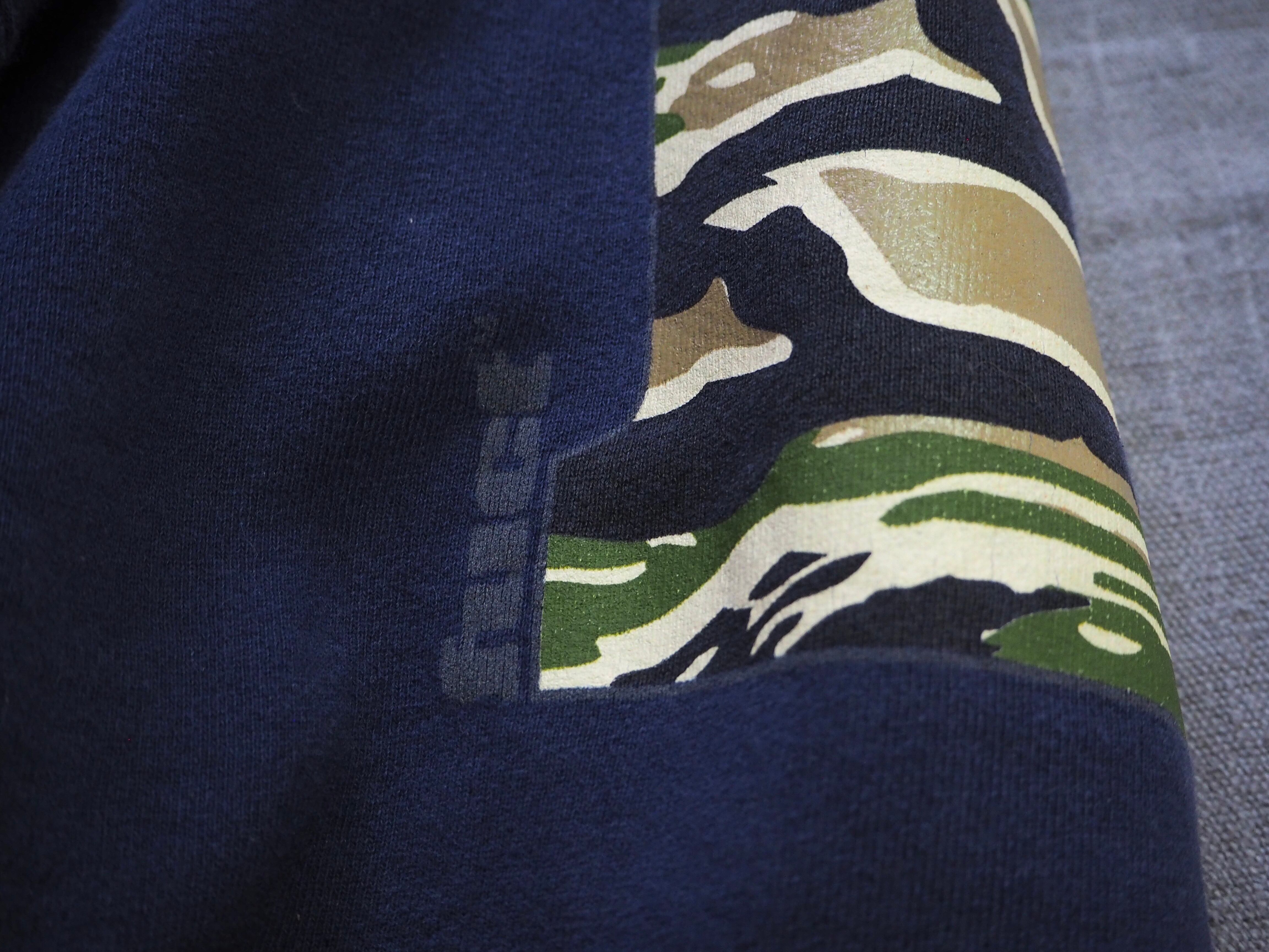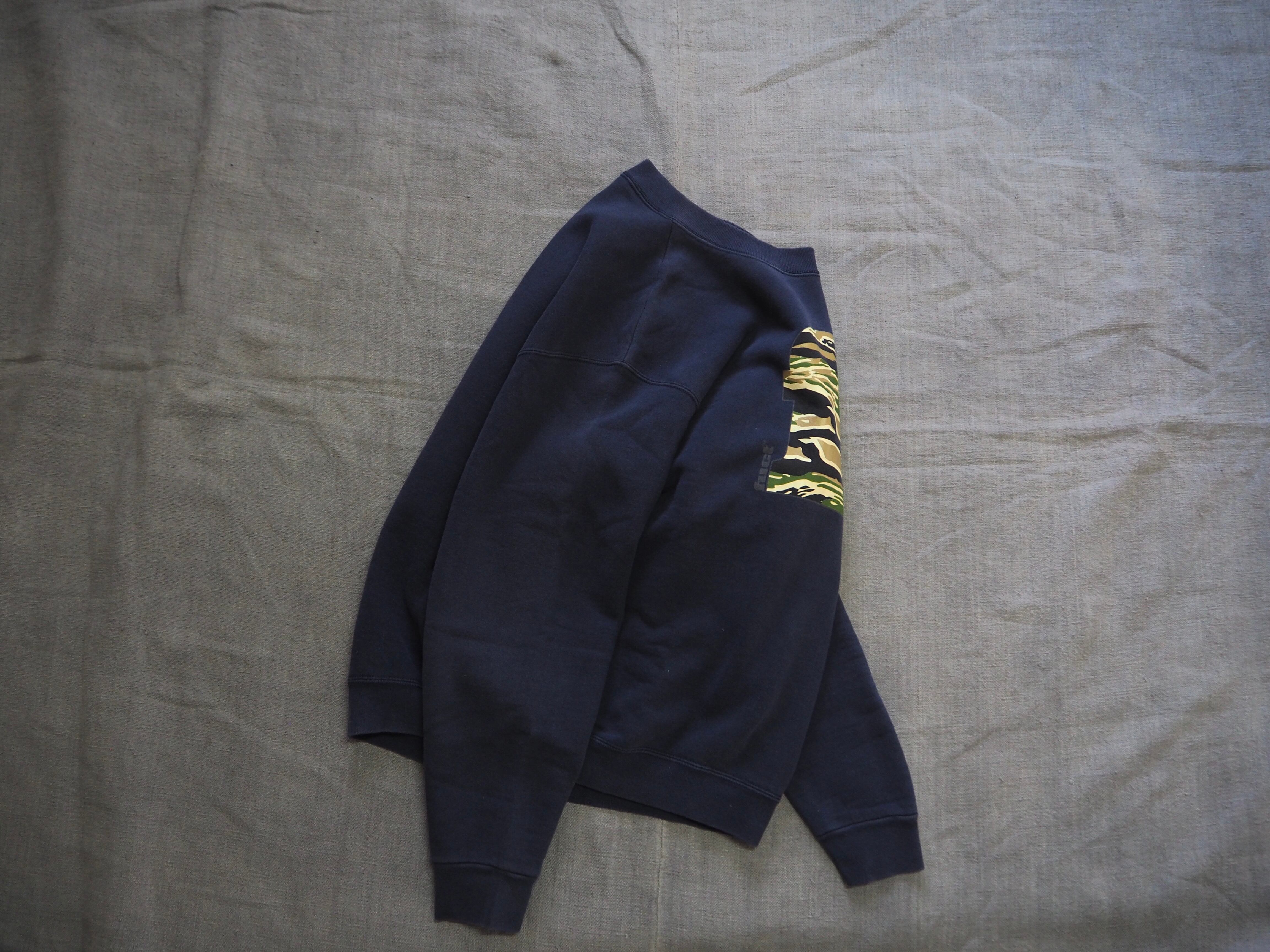 コットン90%の裏起毛のふっくらとした生地感の社外ボディー、ネイビーカラーにタイガーストライプのfロゴがクールな1着です。