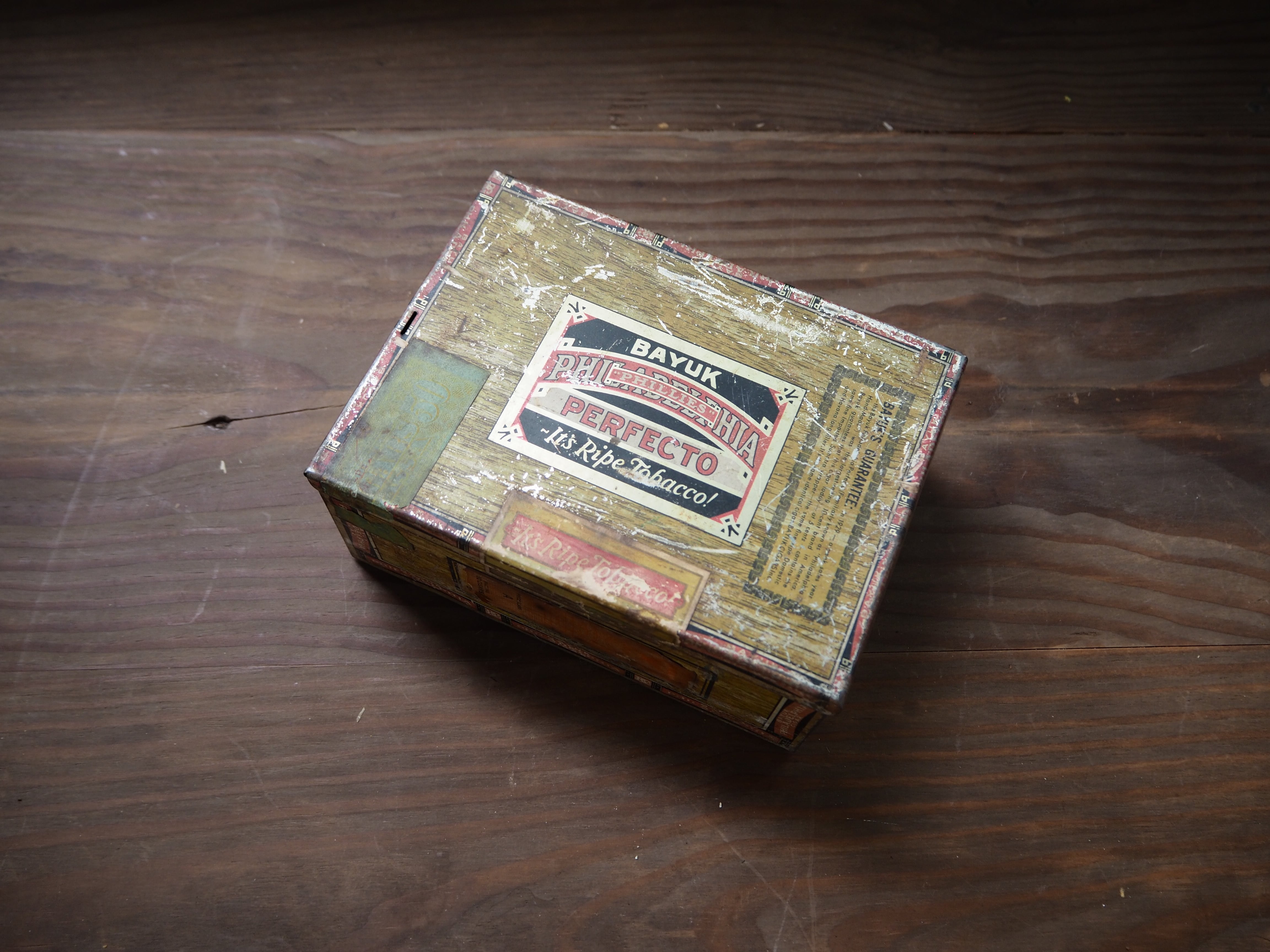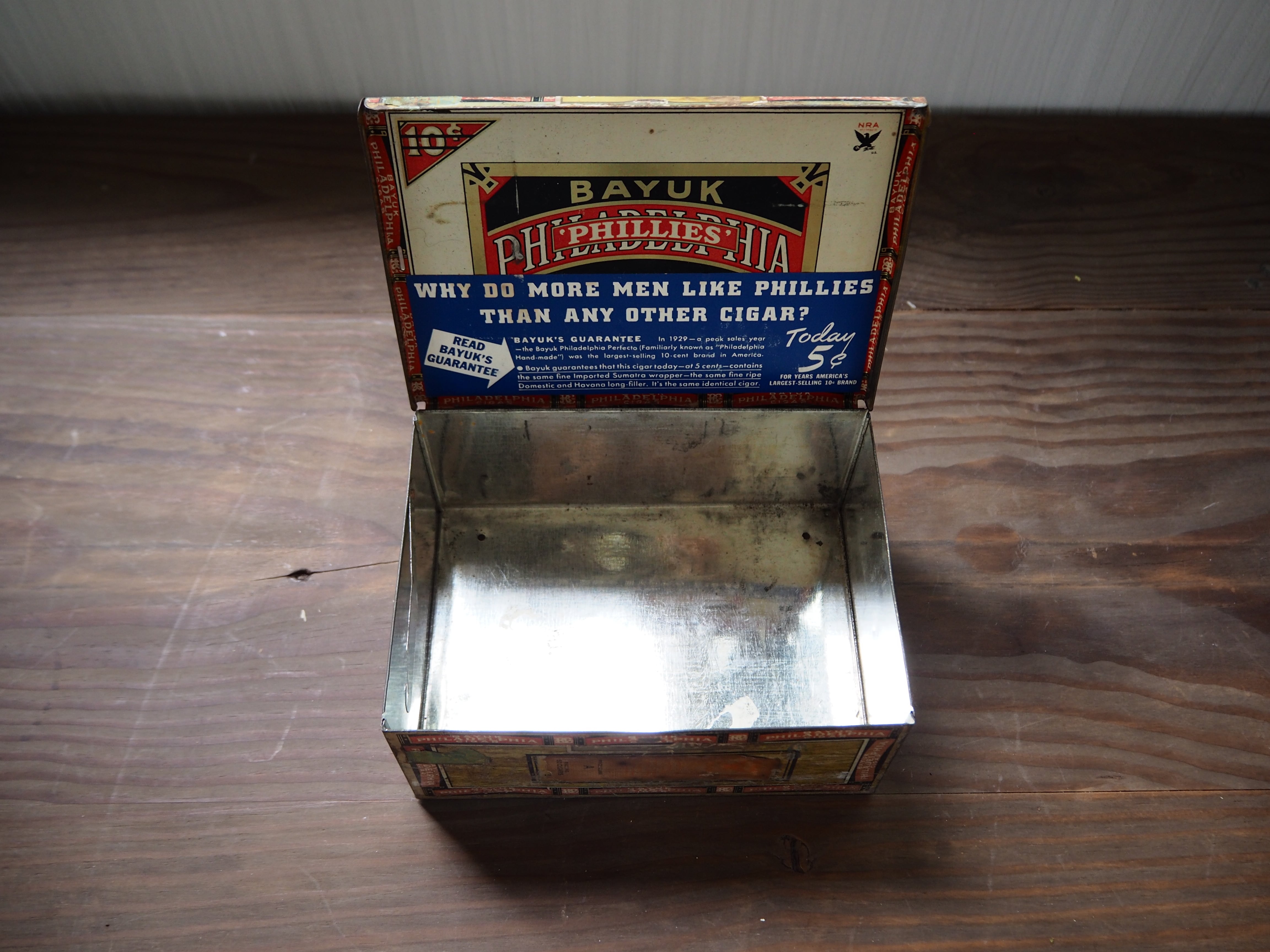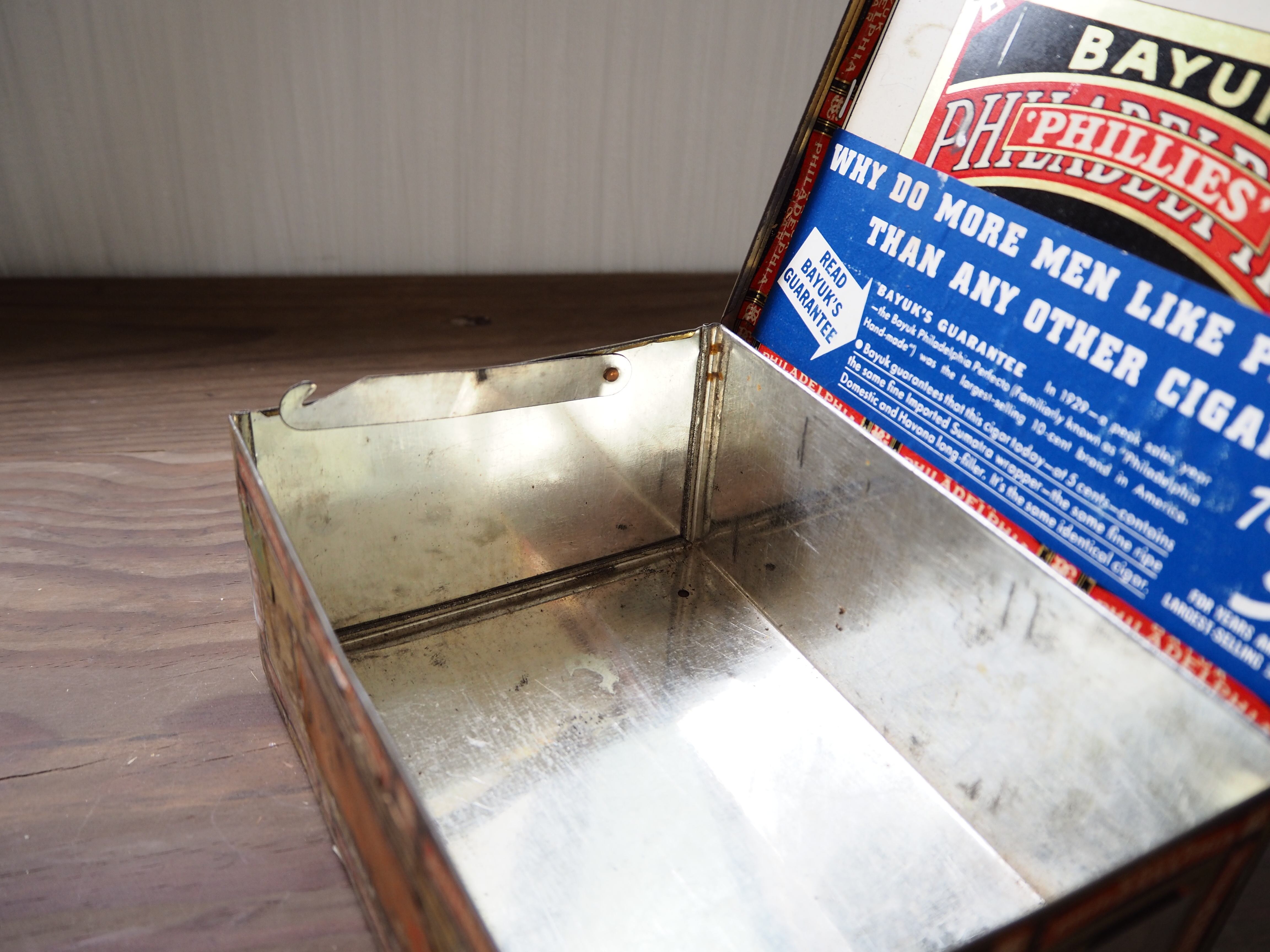 1920’s〜1930’s頃のボックス型のシガー缶です。ボックス型で深さがあり、画像のように開いた状態でのディスプレイも可能。