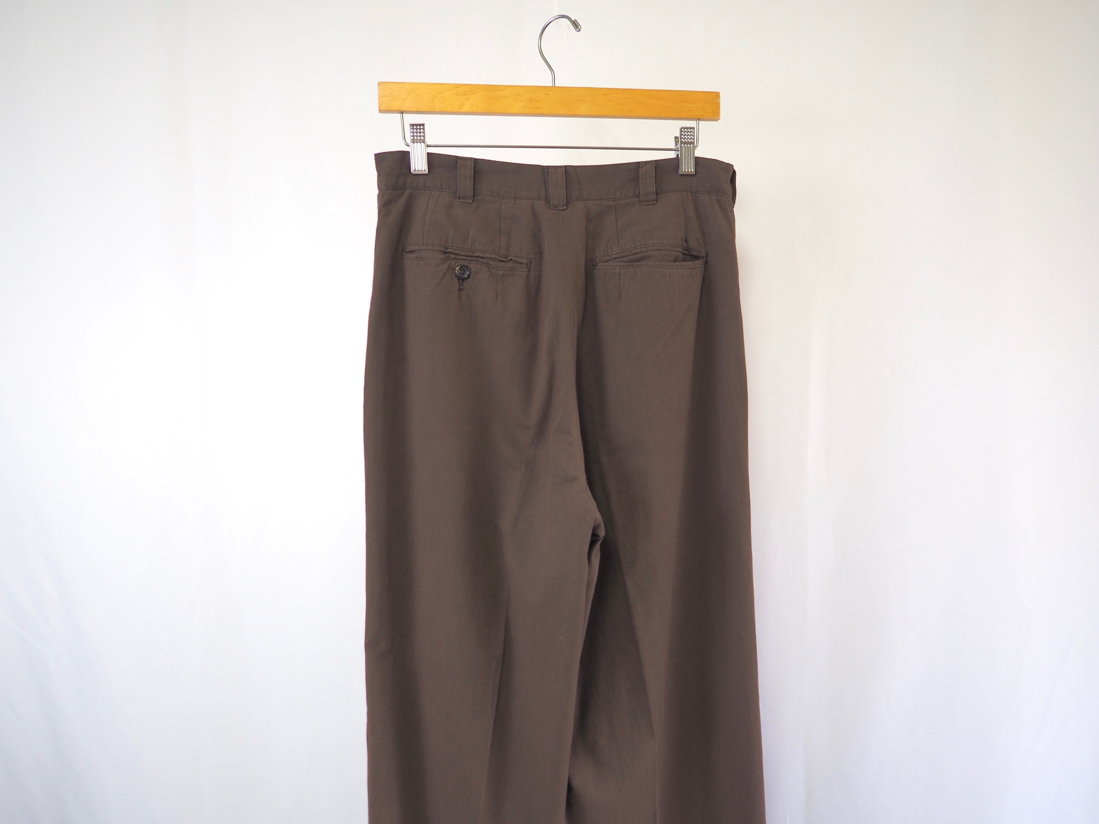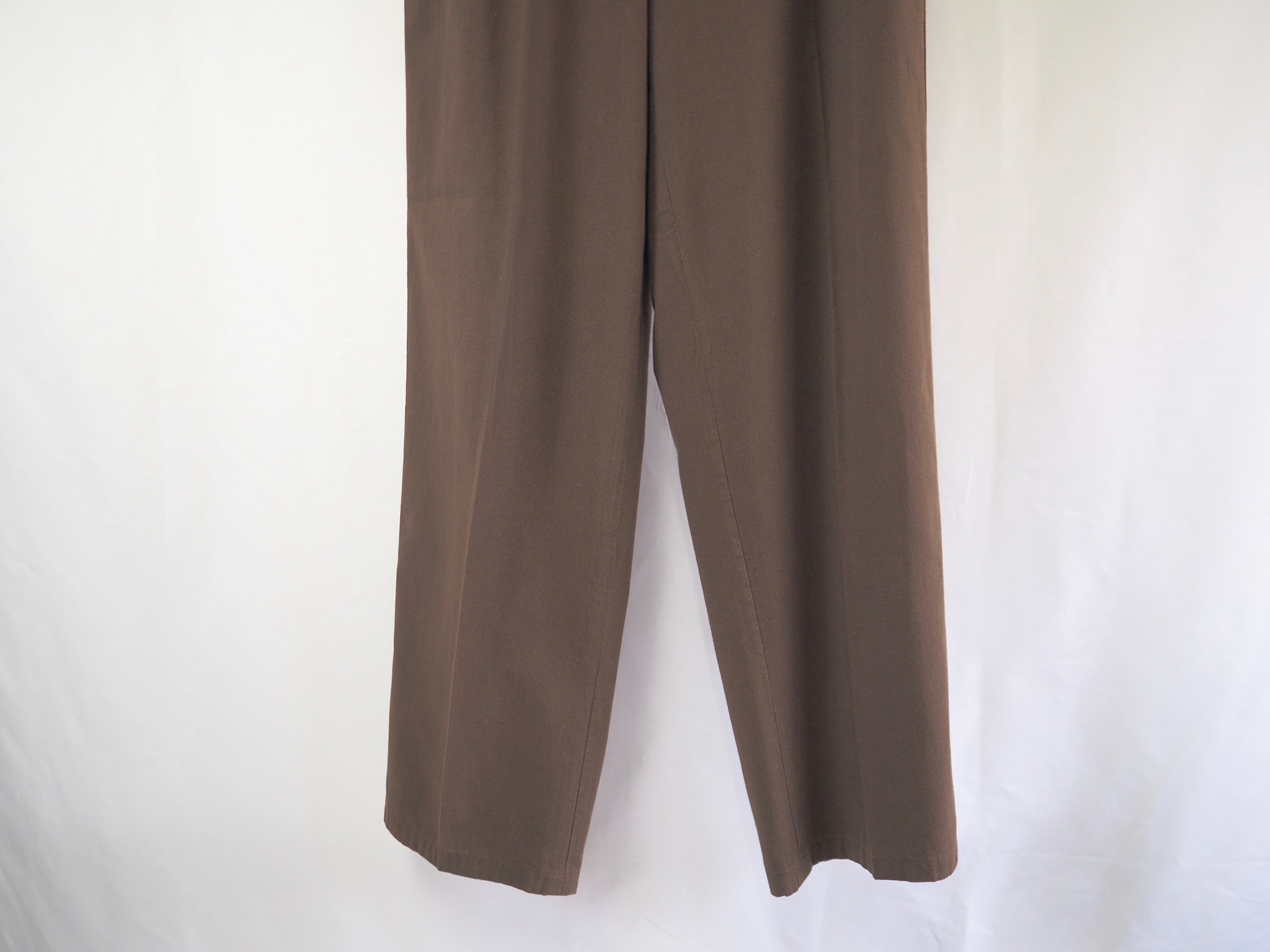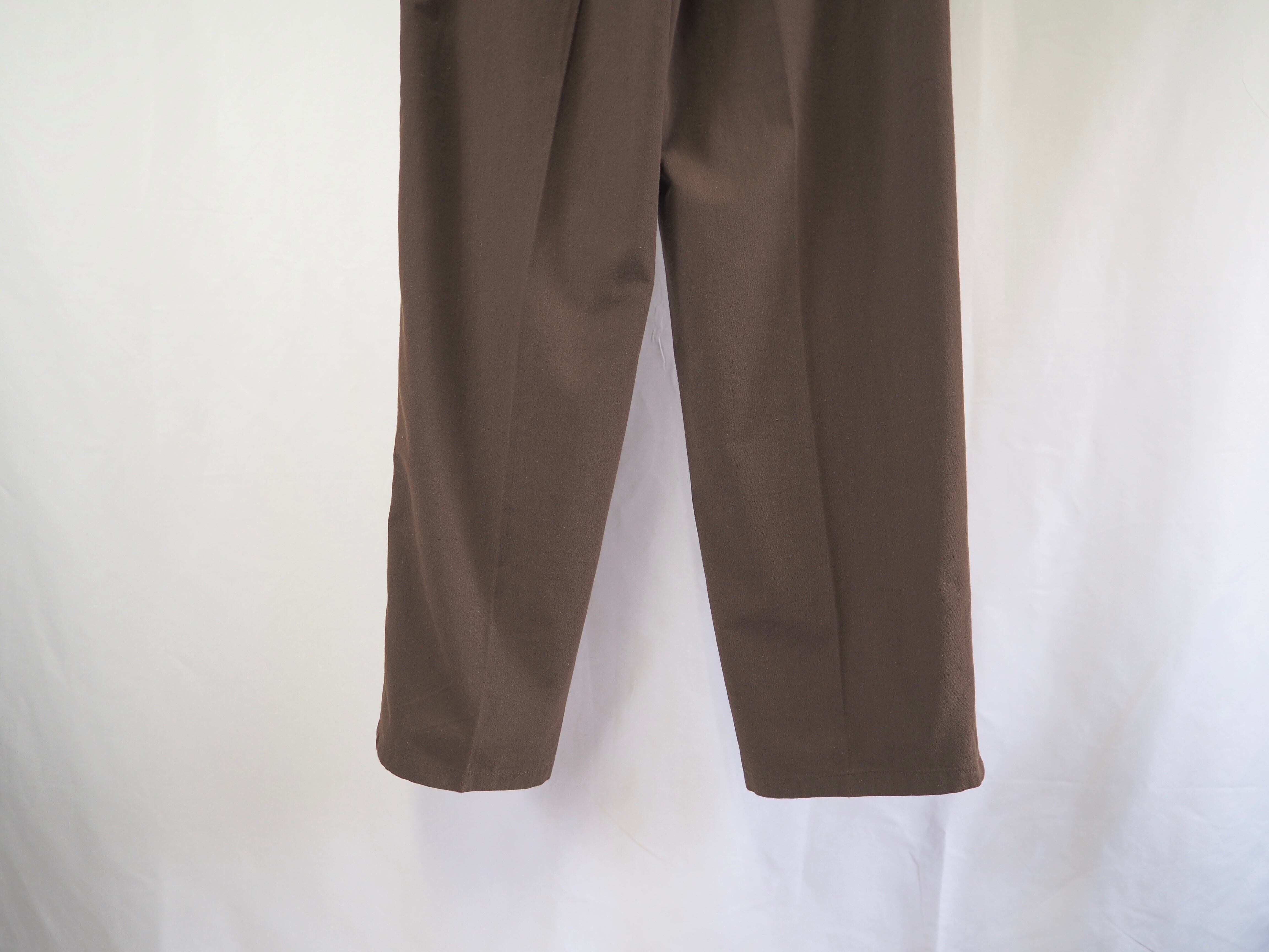 コインポケットの付いたクラシックなデザインのテーパドスラックスです。色味は言語化しずらくカーキとブラウンの中間のようなブラウン系の色味です。