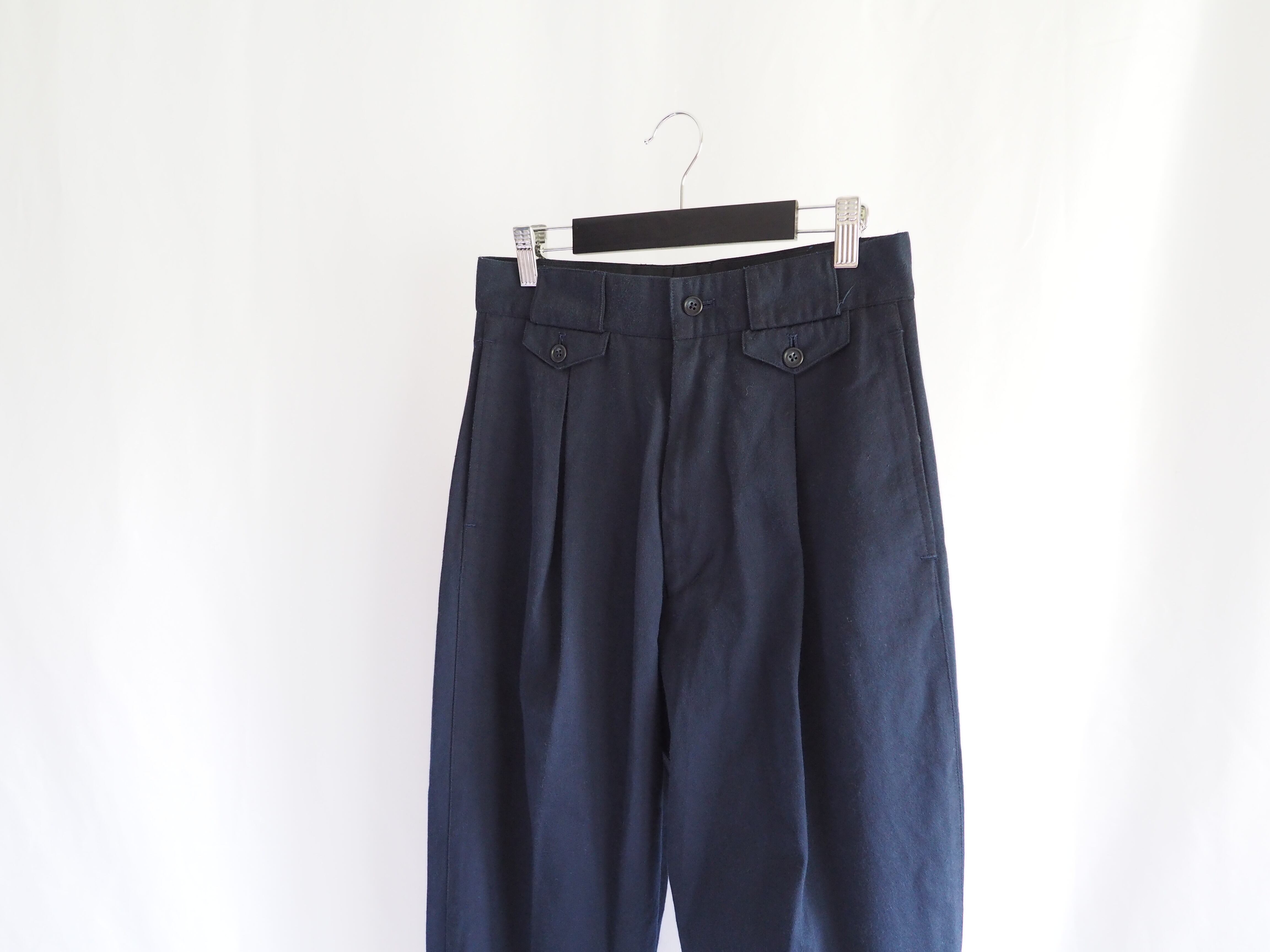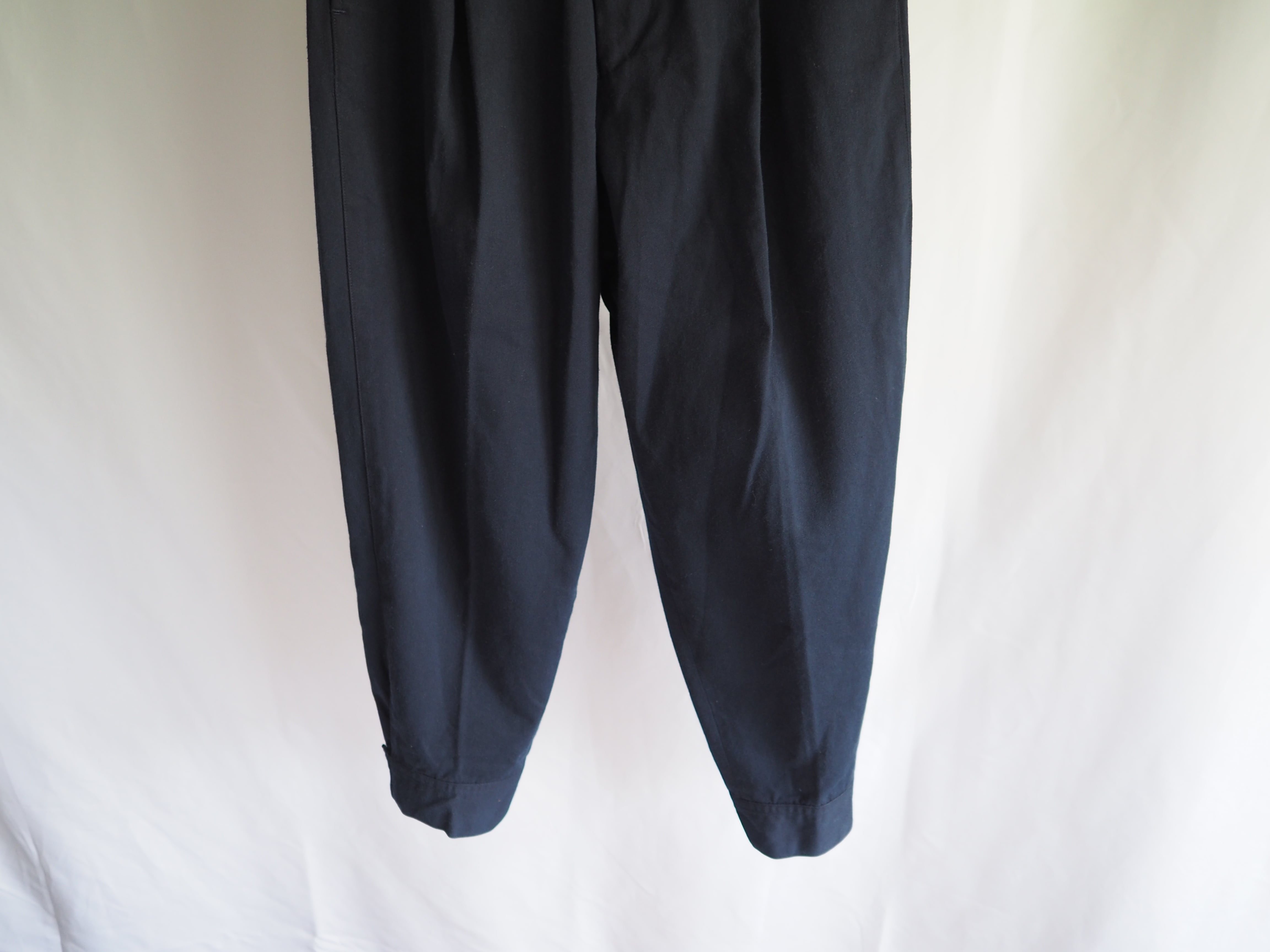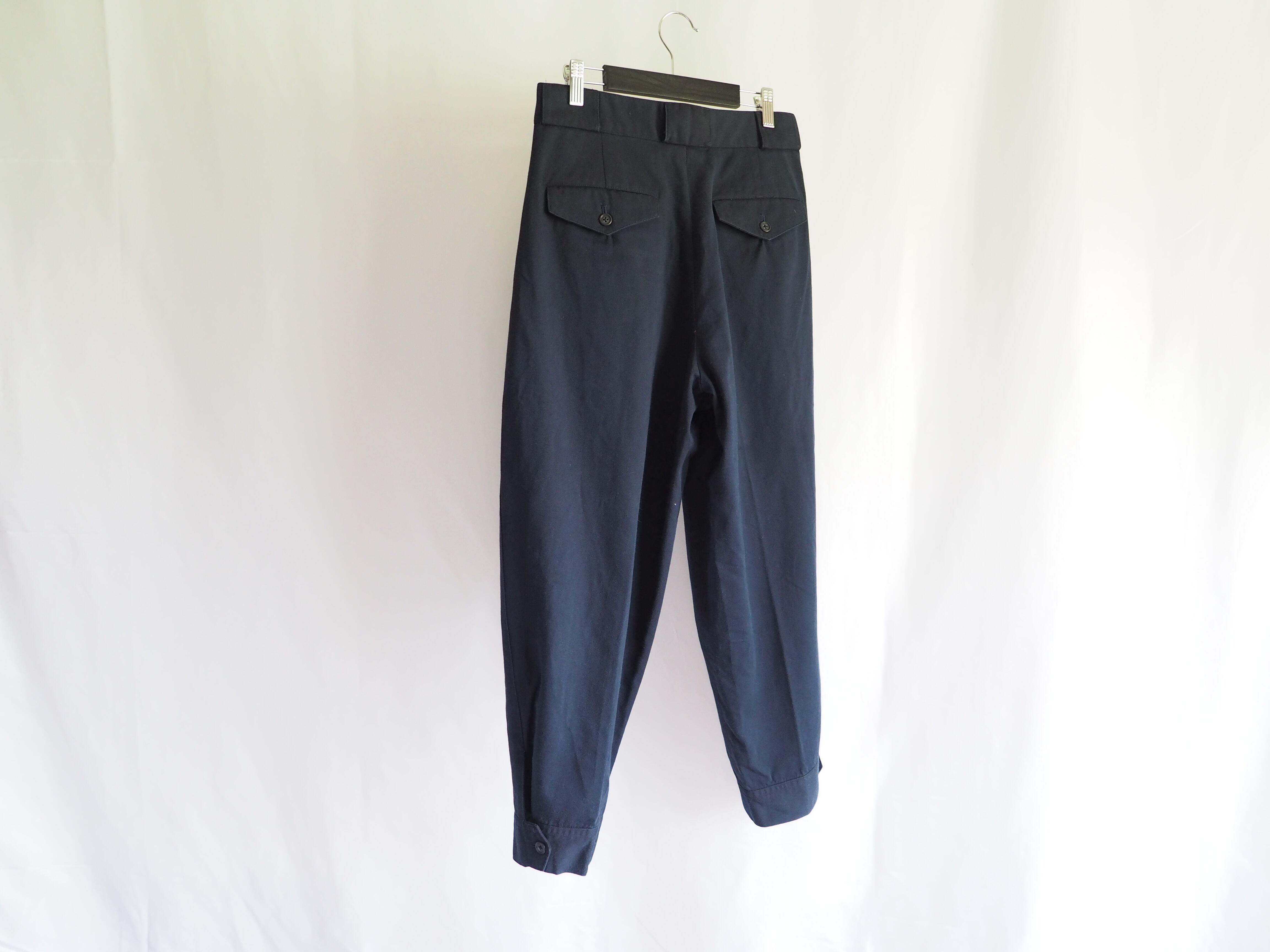裾にかけてきつめにテーパードするバルーンシルエット、裾はアジャスターのつくデザインです。レングスは8-9部丈で80年代頃の貴重な1着です。