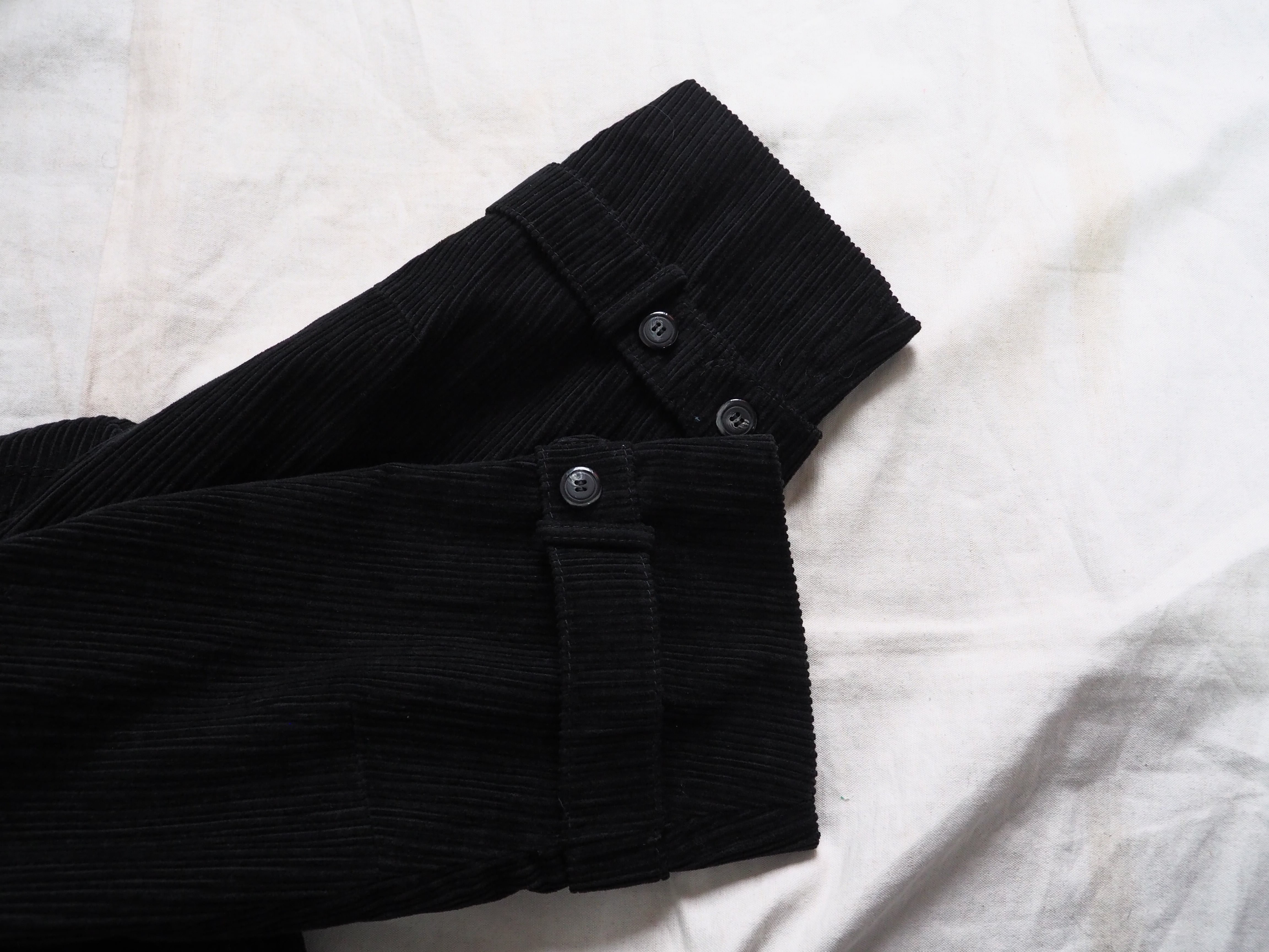 カラーはブラックで太畝のコーデュロイ素材、ヴィスコースの総裏地付きです。