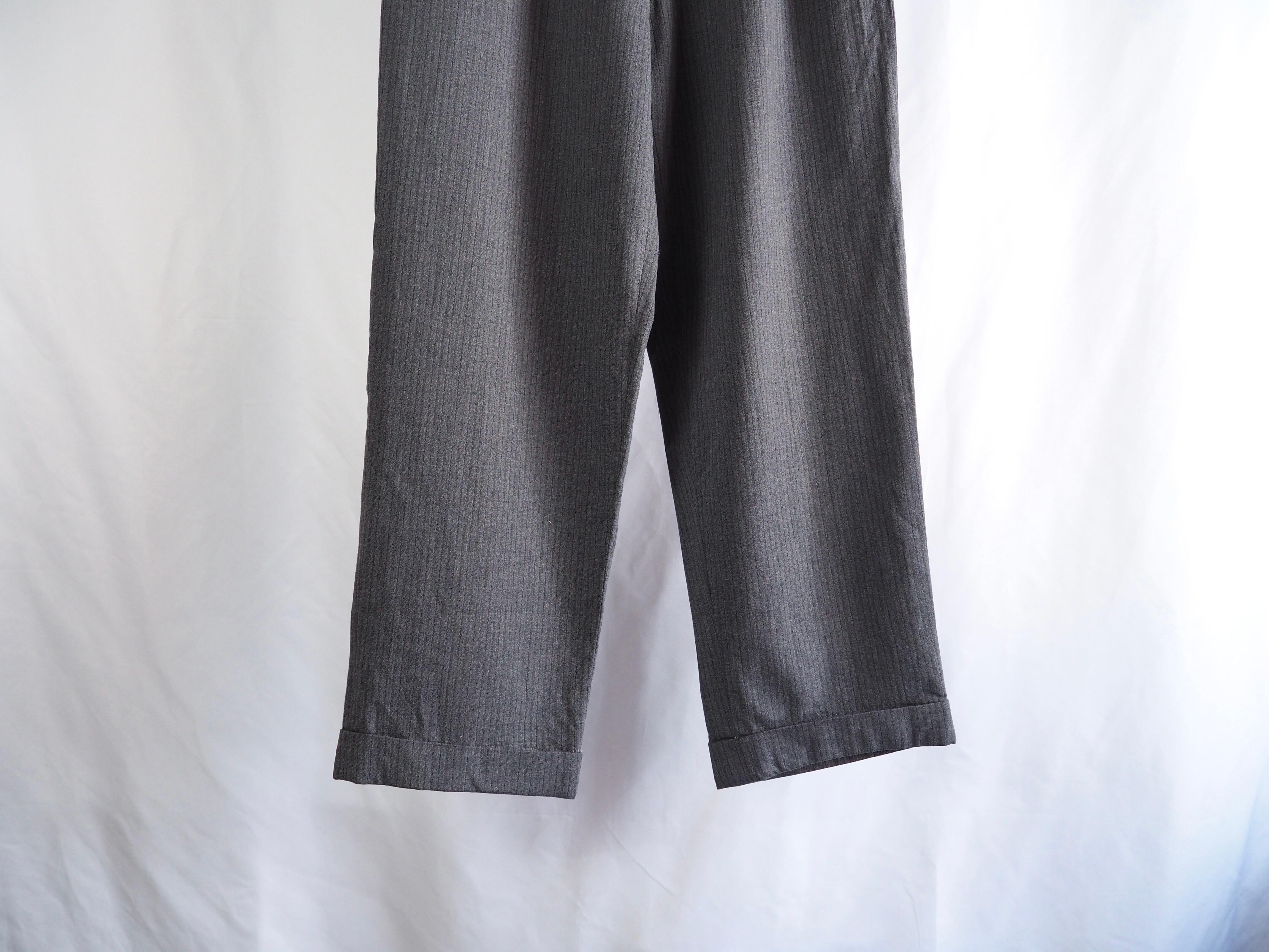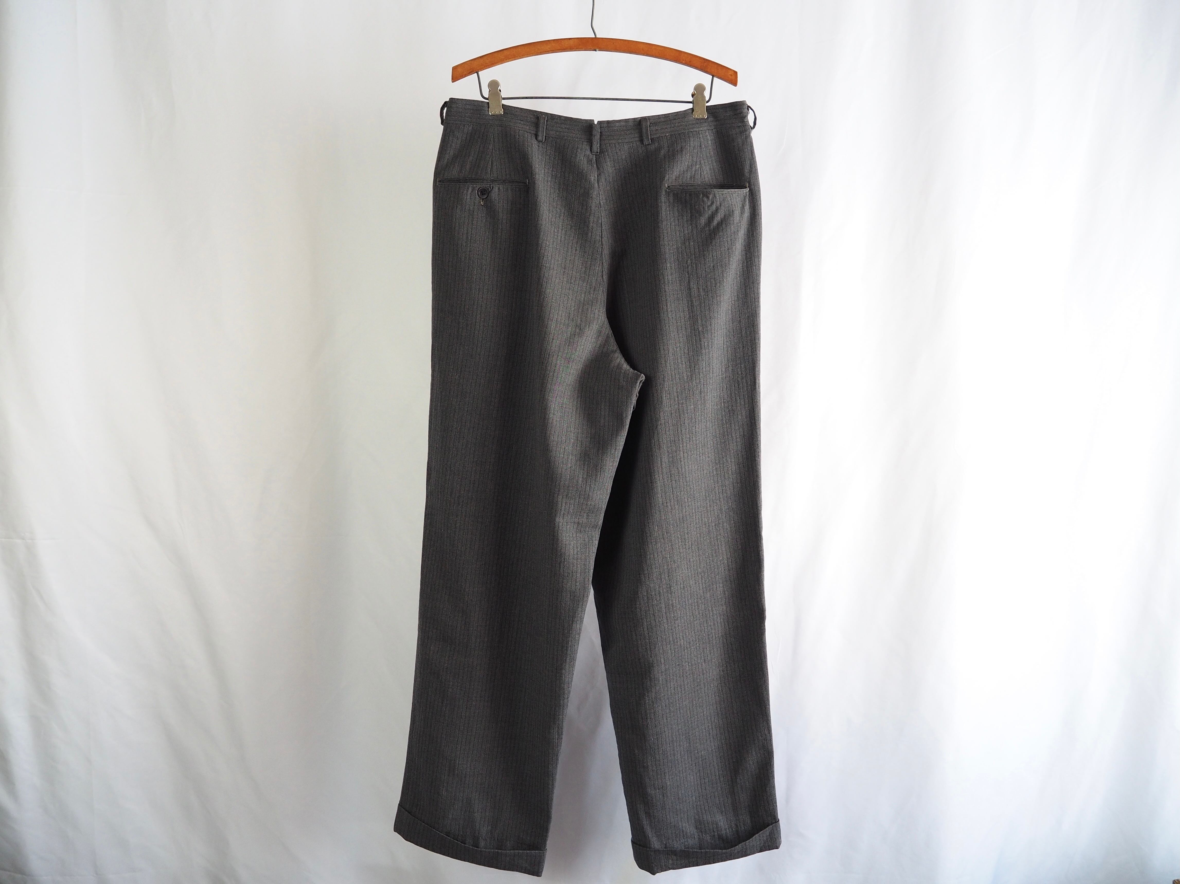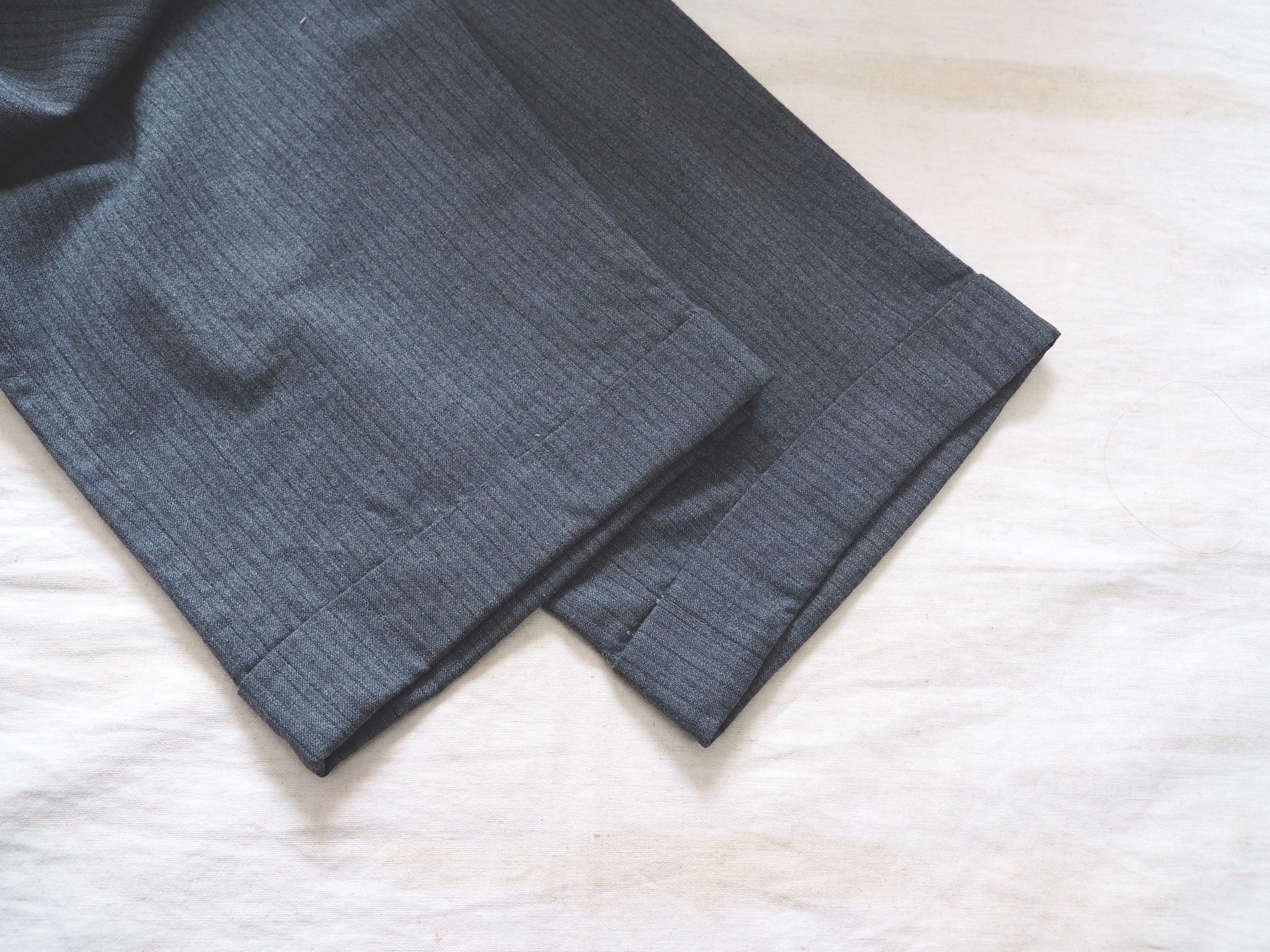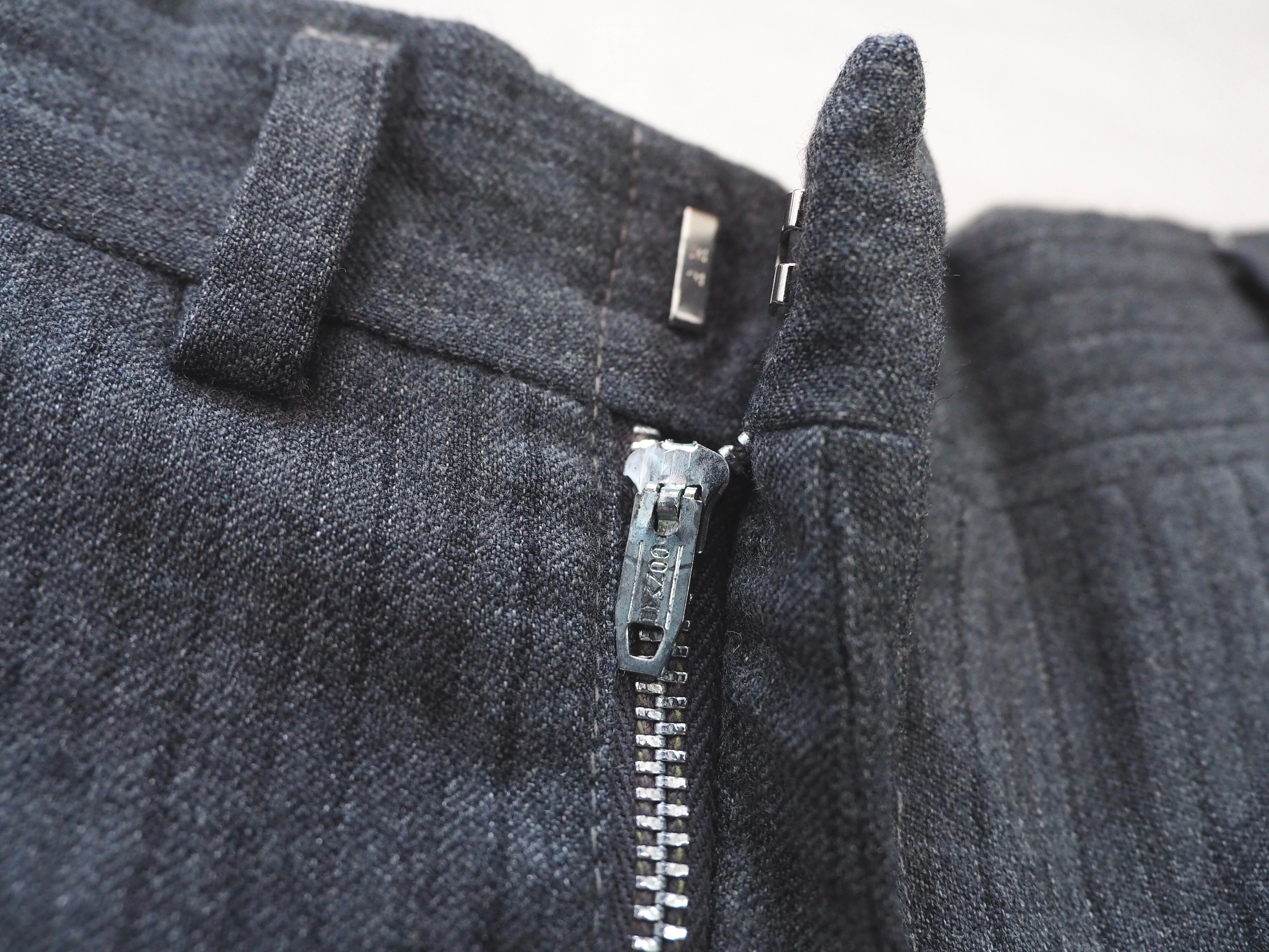 グレーのストライプで密度の高い上質なウール素材、ズドンと太いストレートシルエットです。