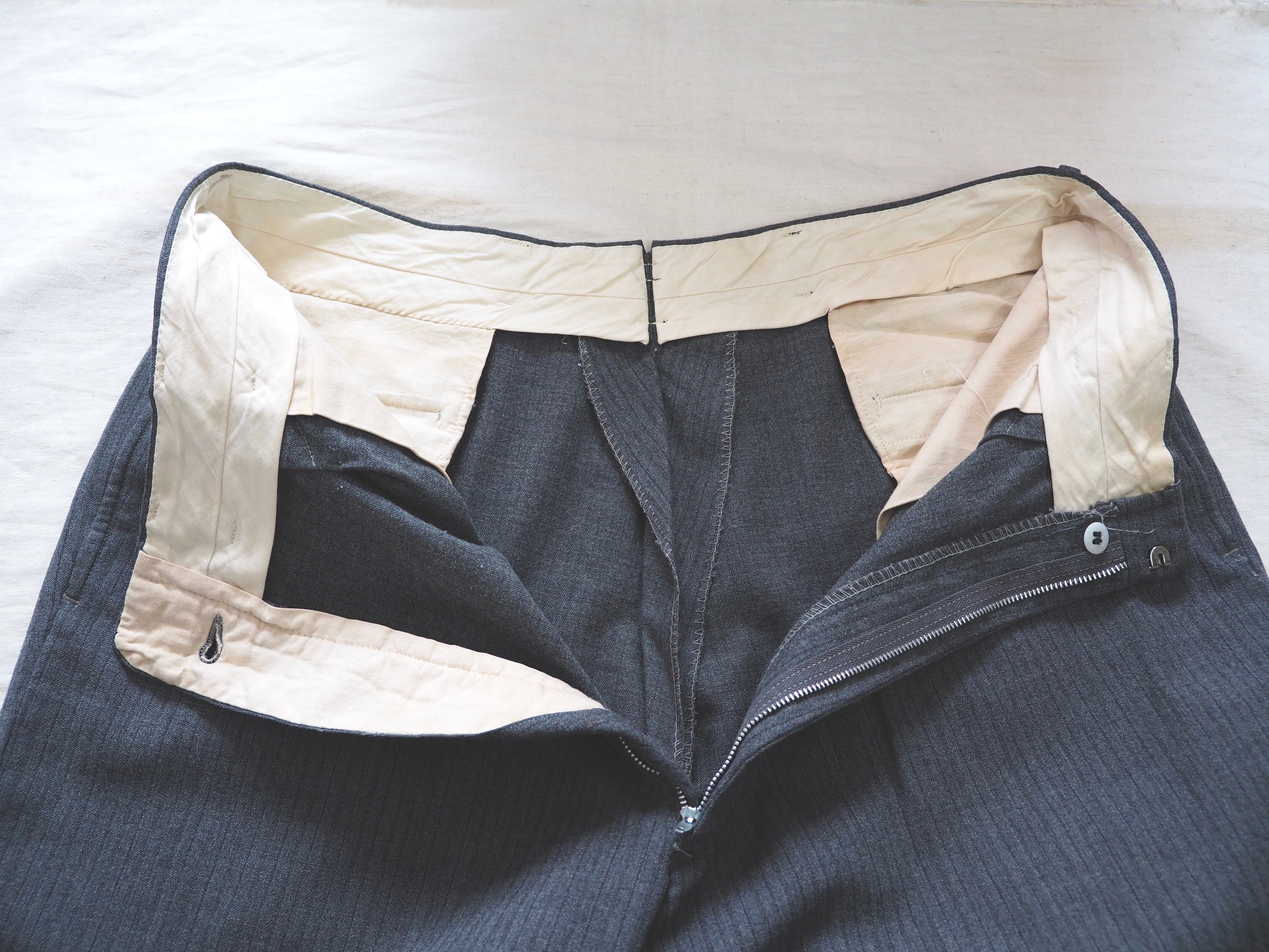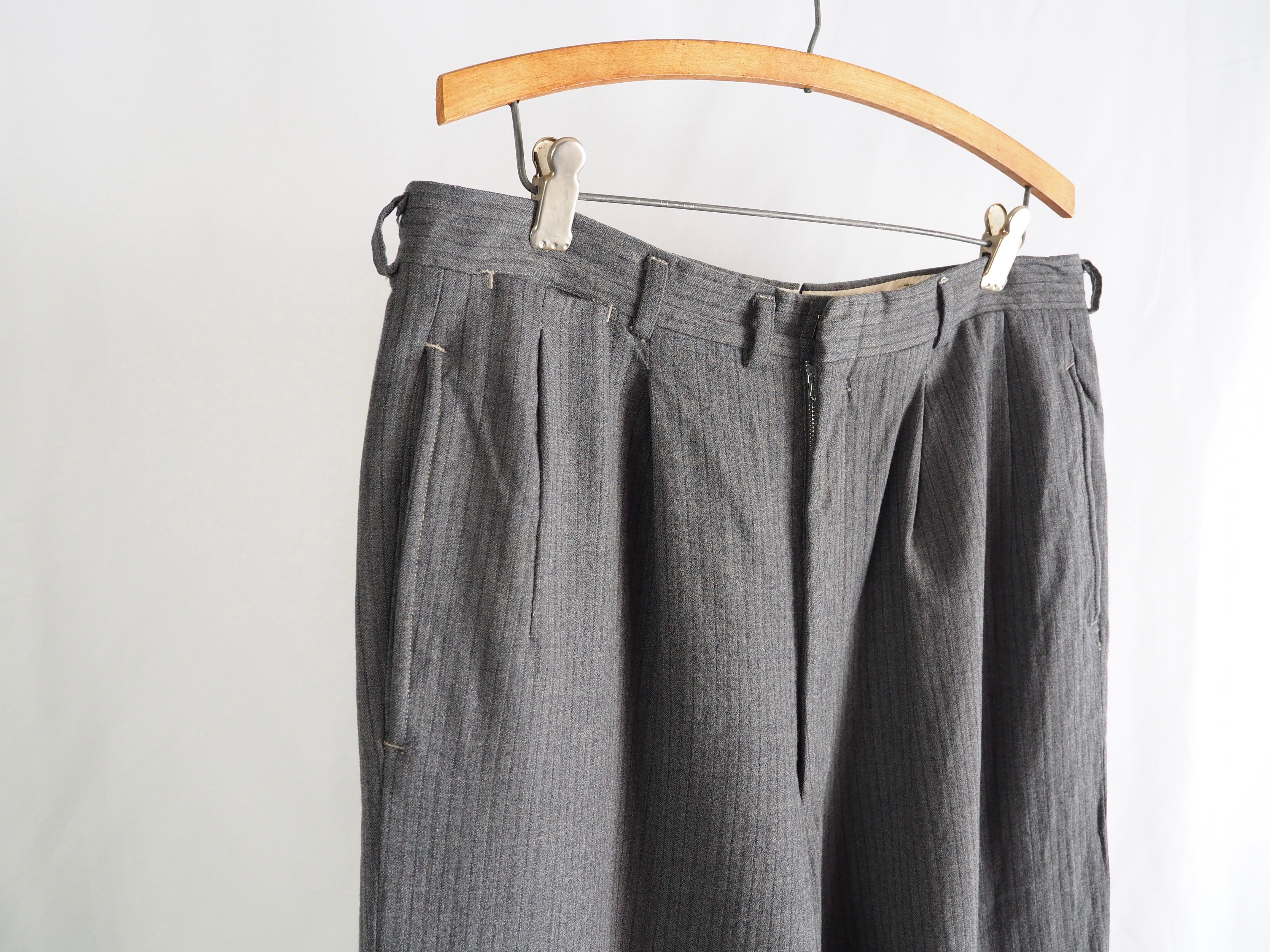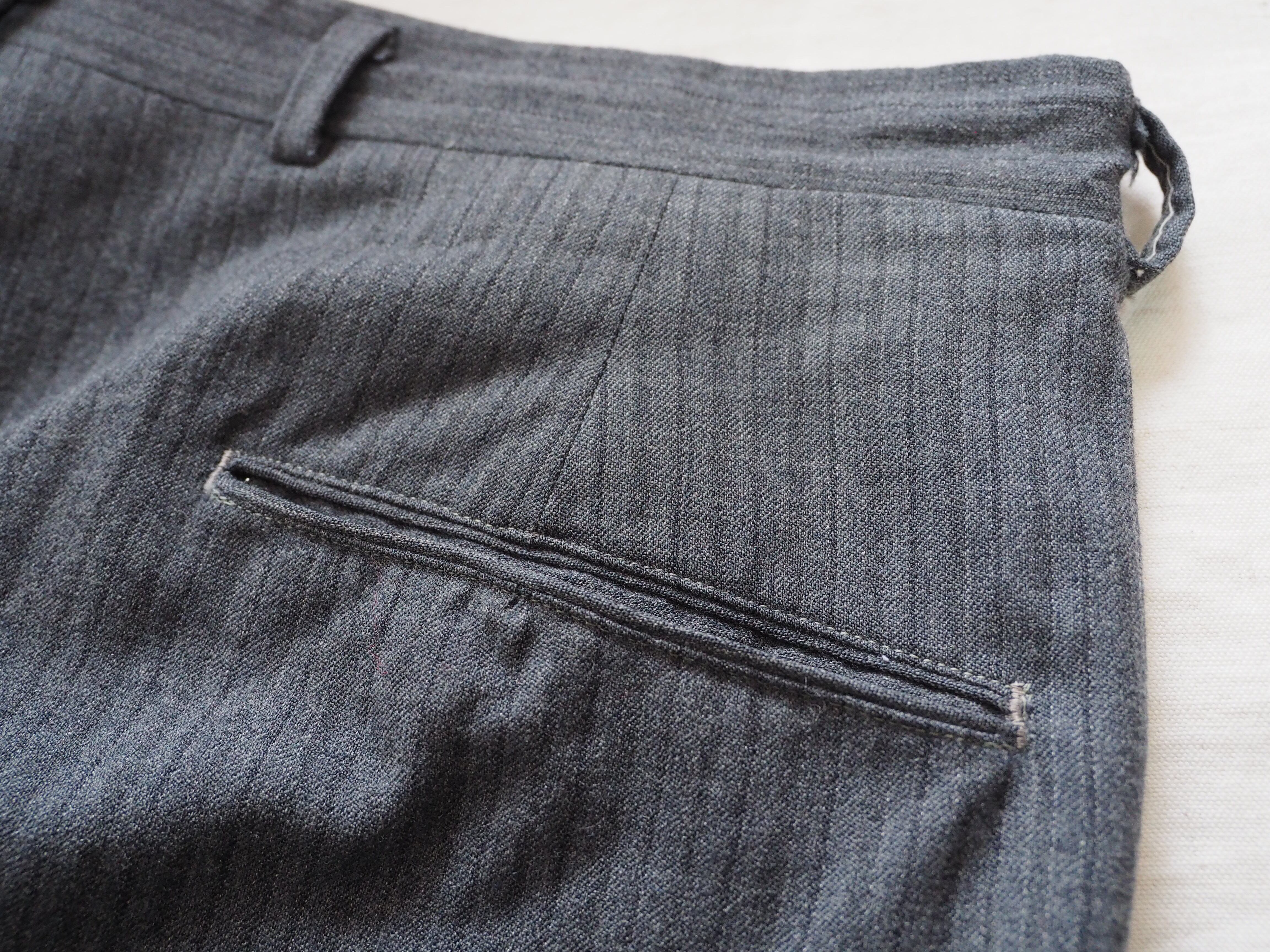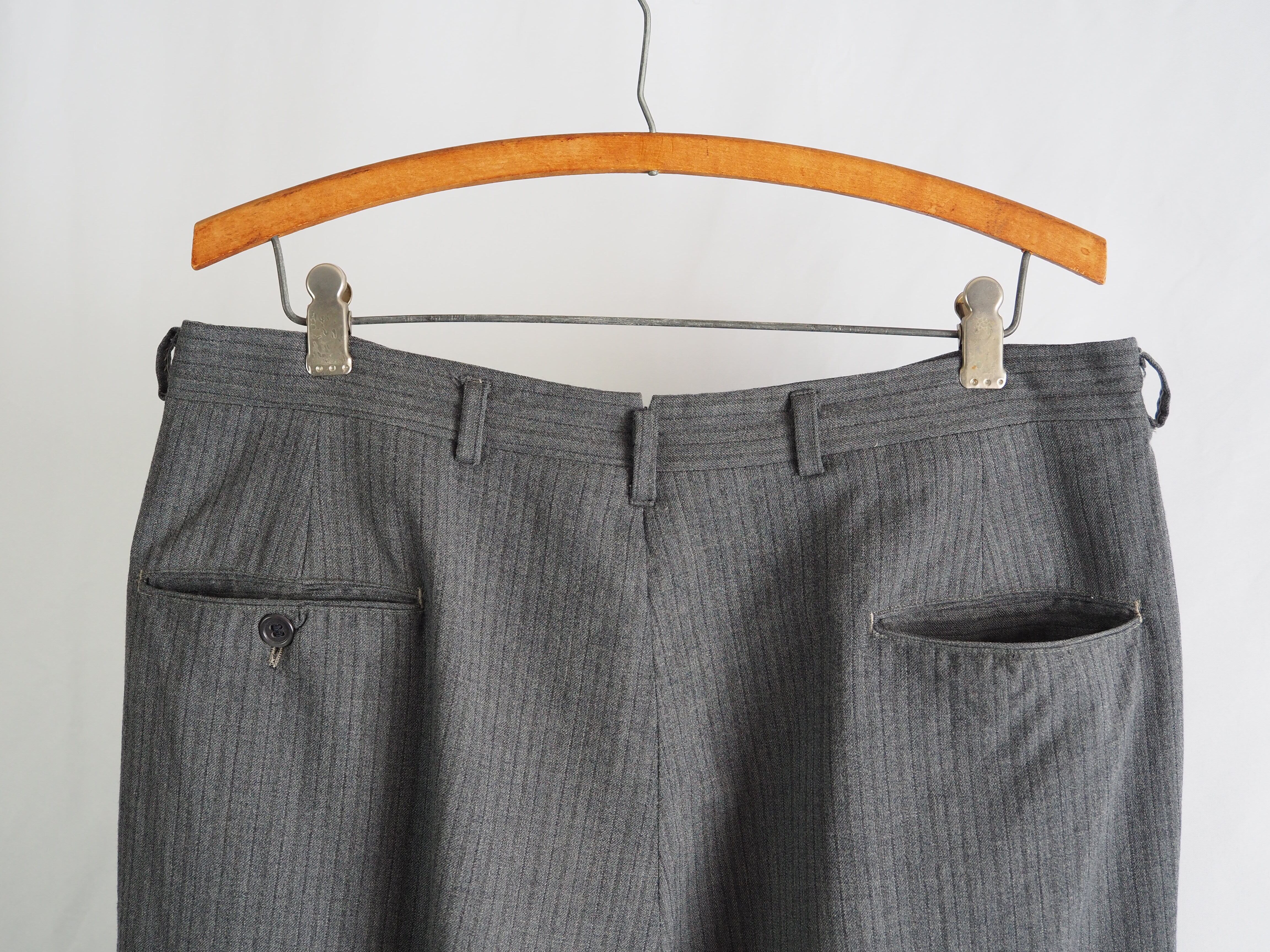 グレーのストライプで密度の高い上質なウール素材、ズドンと太いストレートシルエットです。