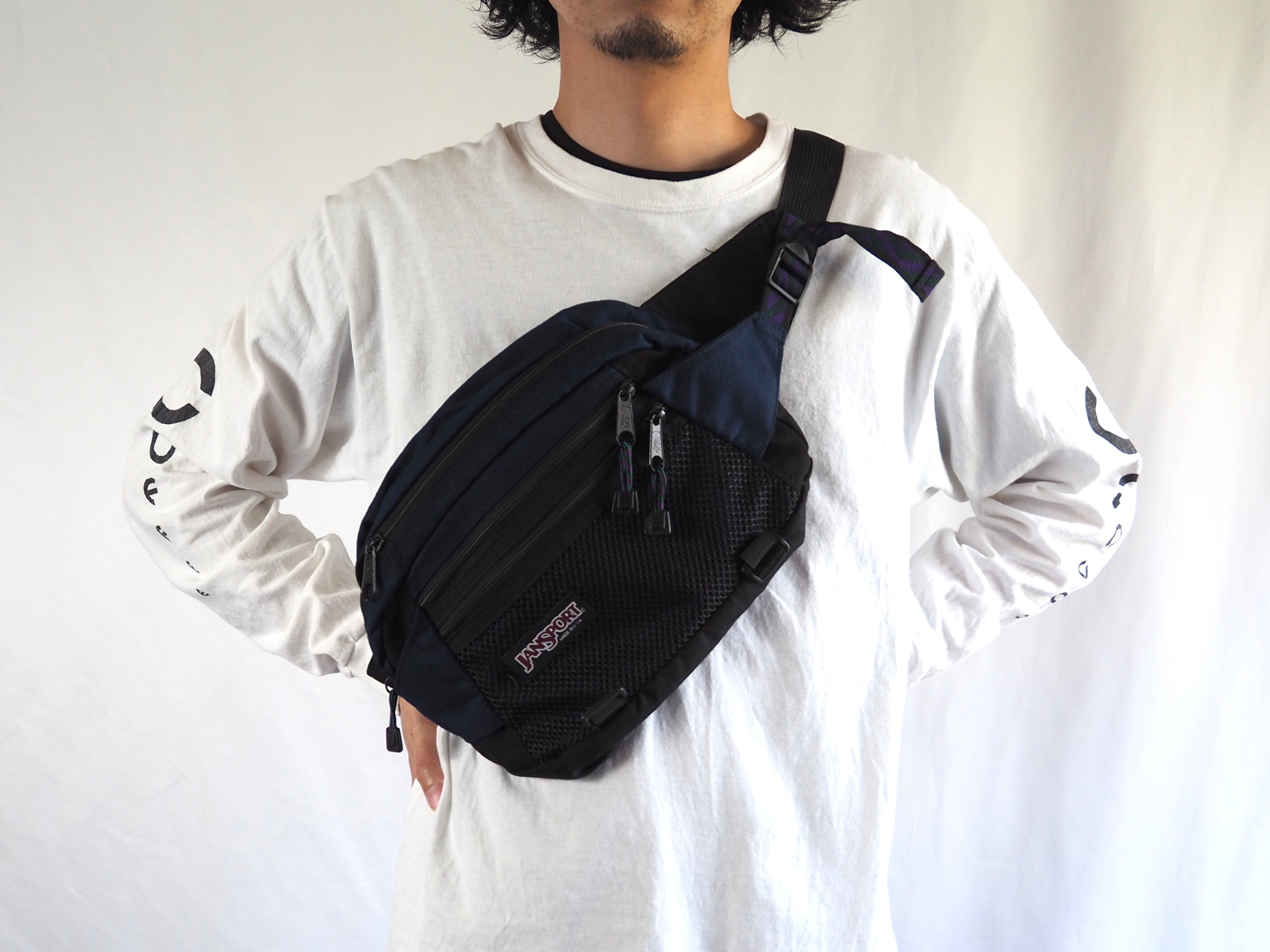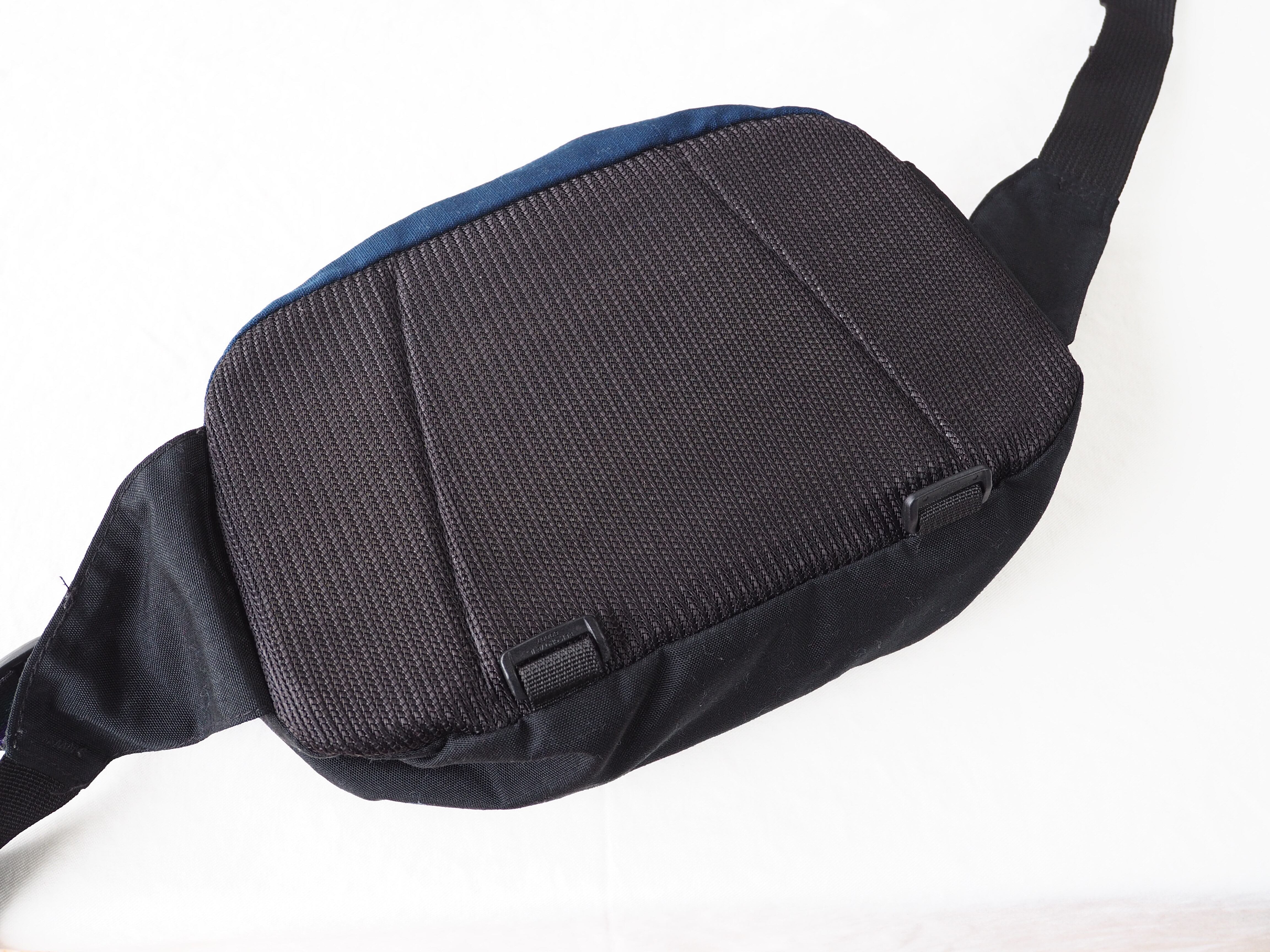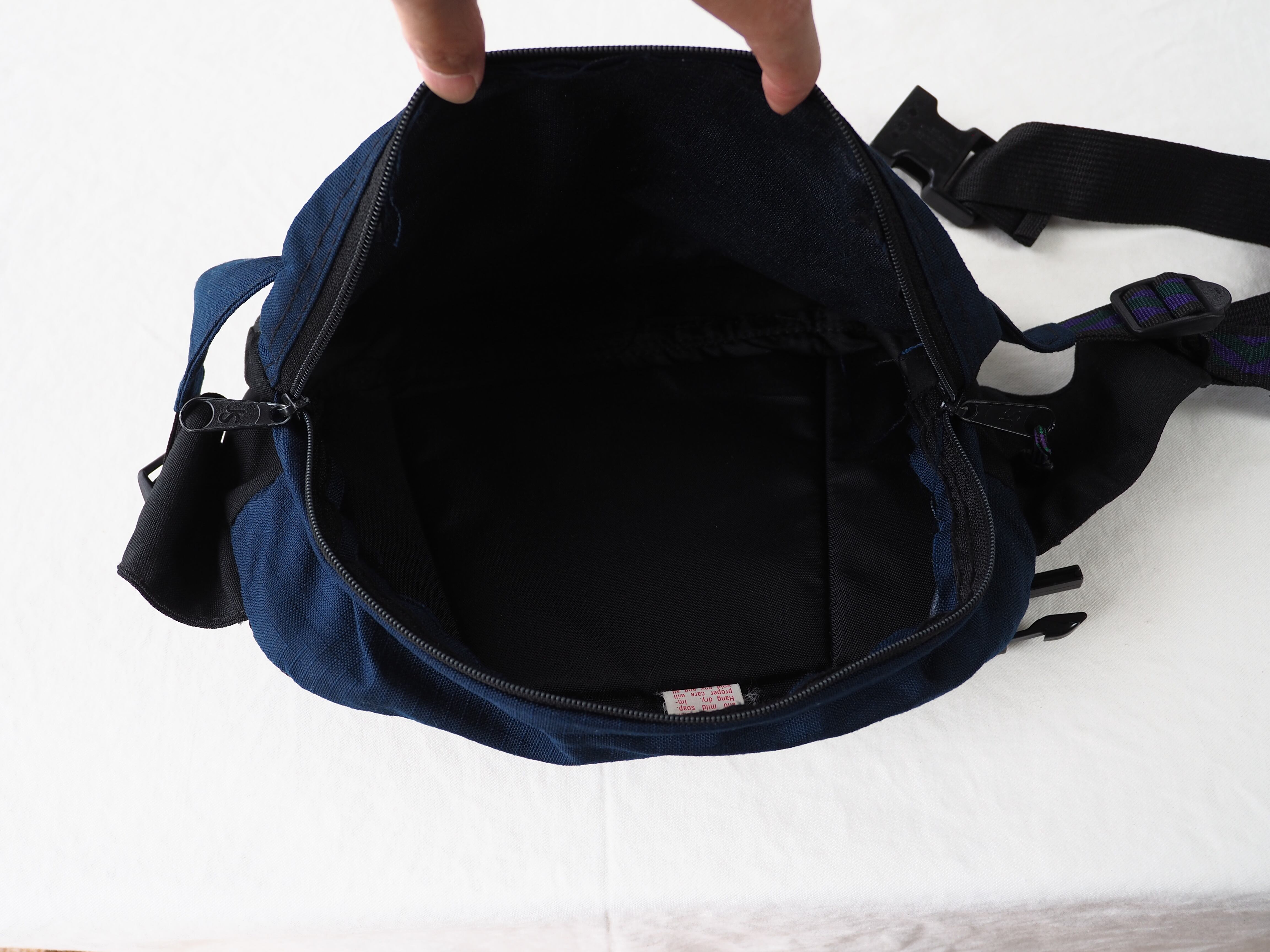 斜めがけでもゆとりを持って着用できるサイズ感、ネイティブ柄のストラップ。