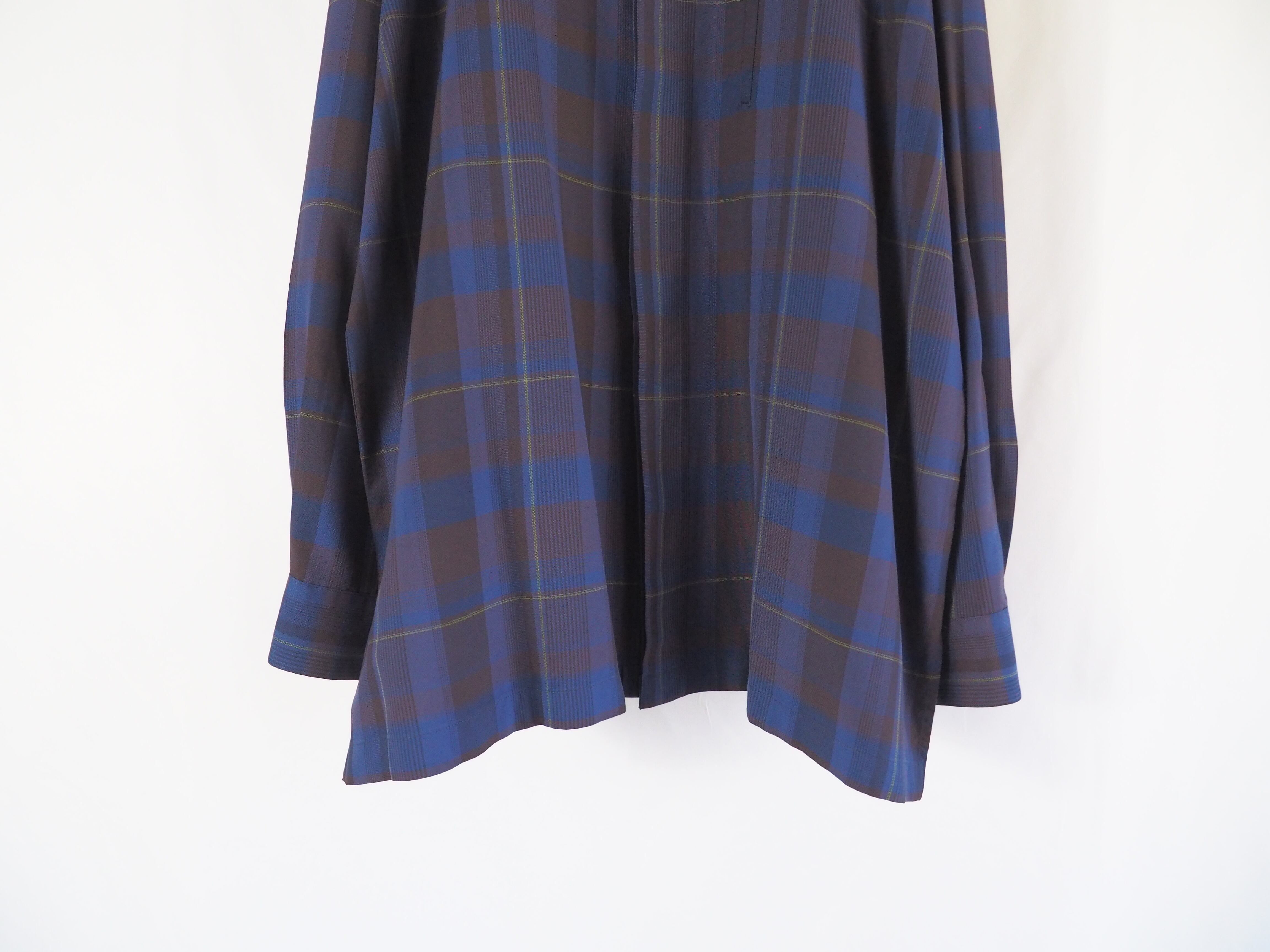ブルー系のチェック柄、比翼フロント、サイドベンツの入ったボックスシルエットです。