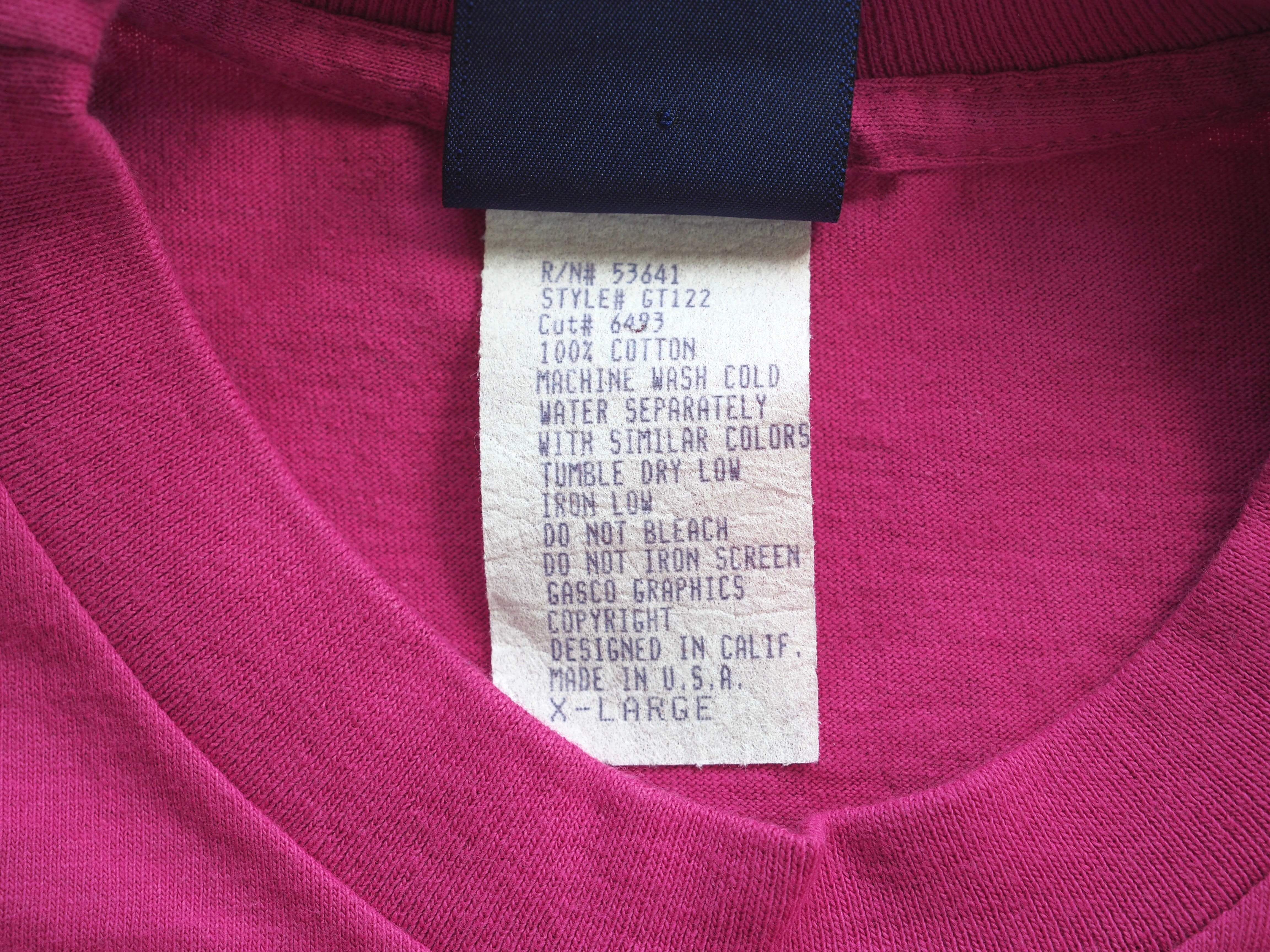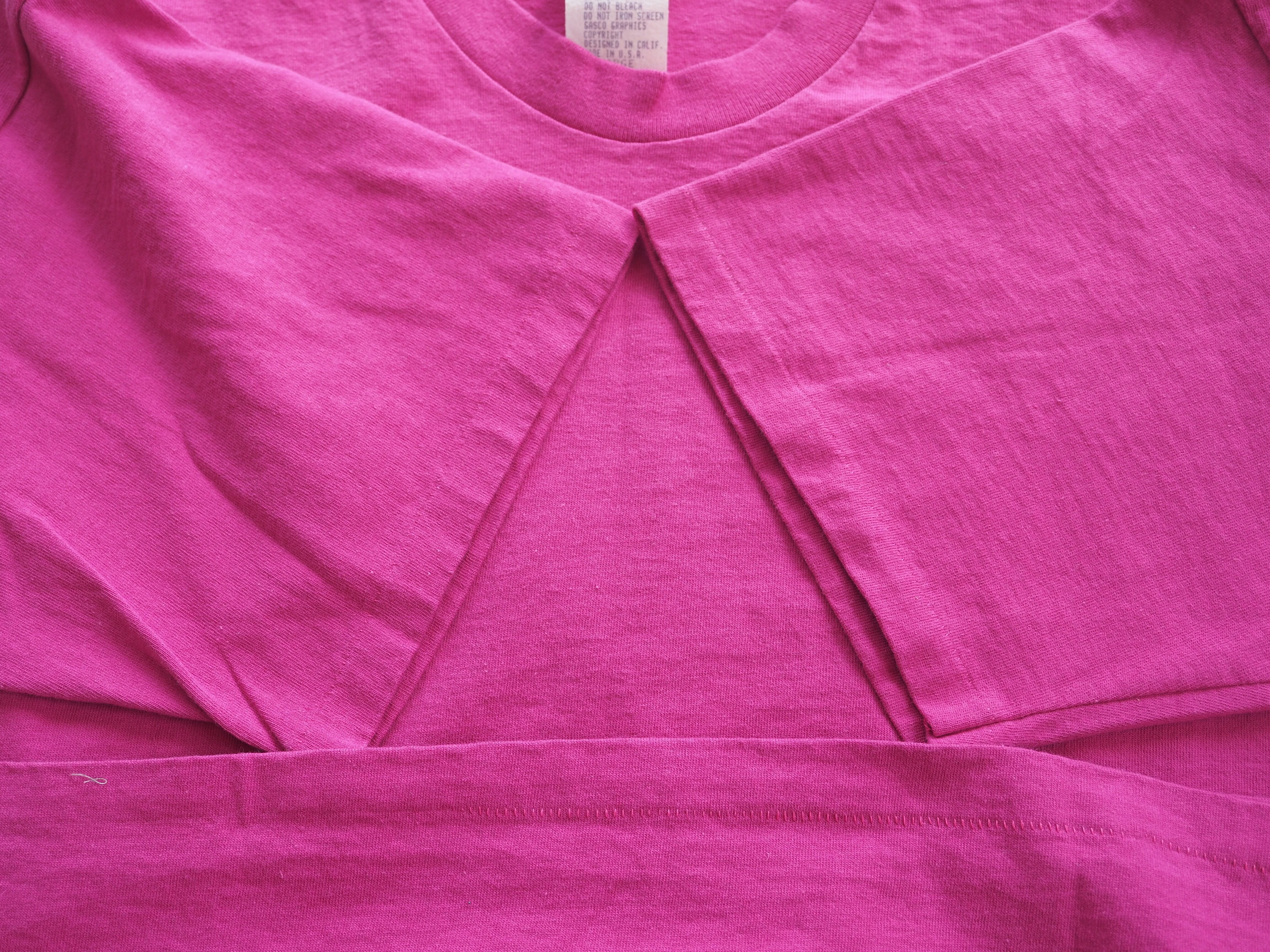 ボディーはヴィヴィッドなピンクのコットン100%、丸銅のシングルステッチです。