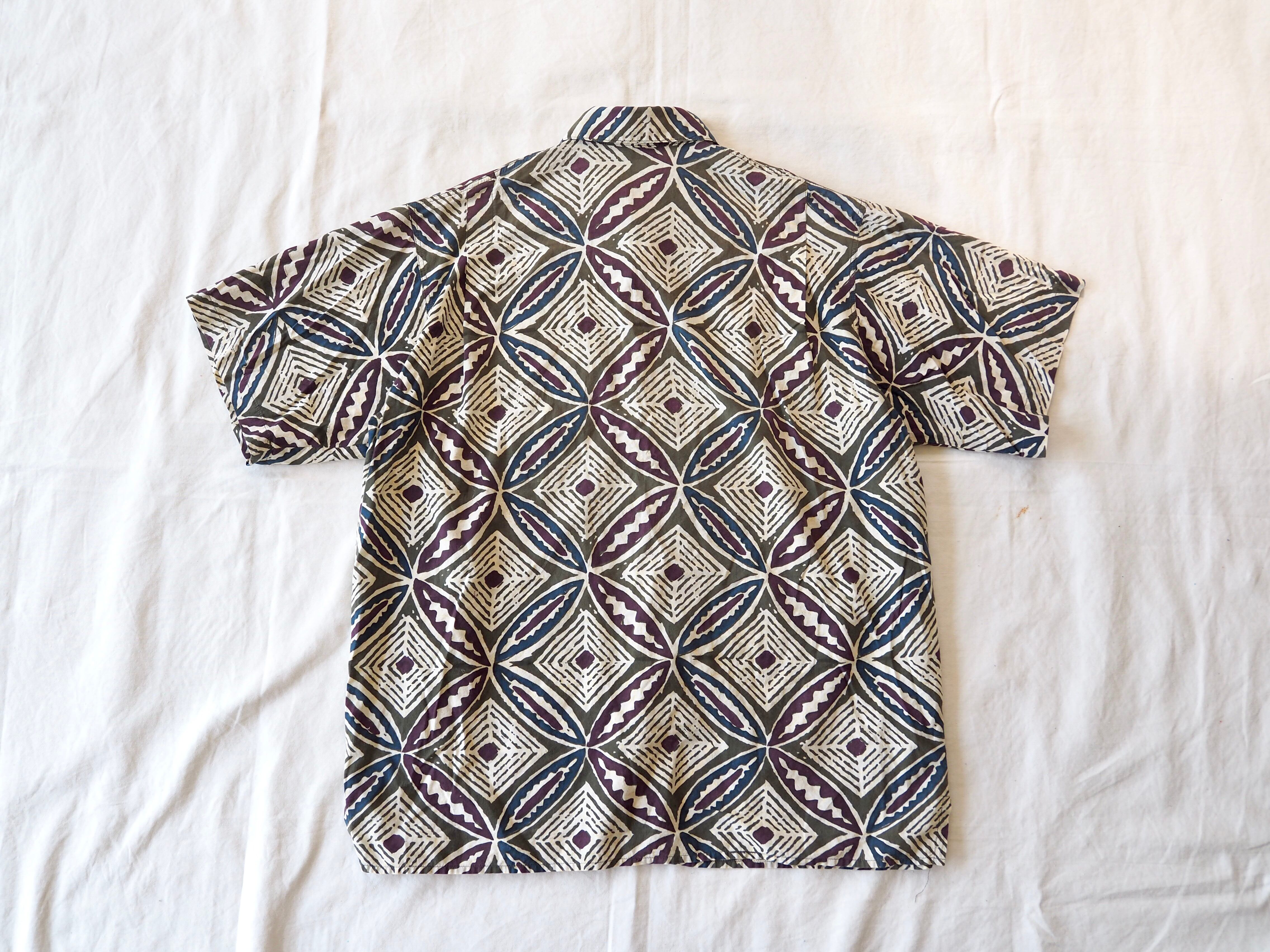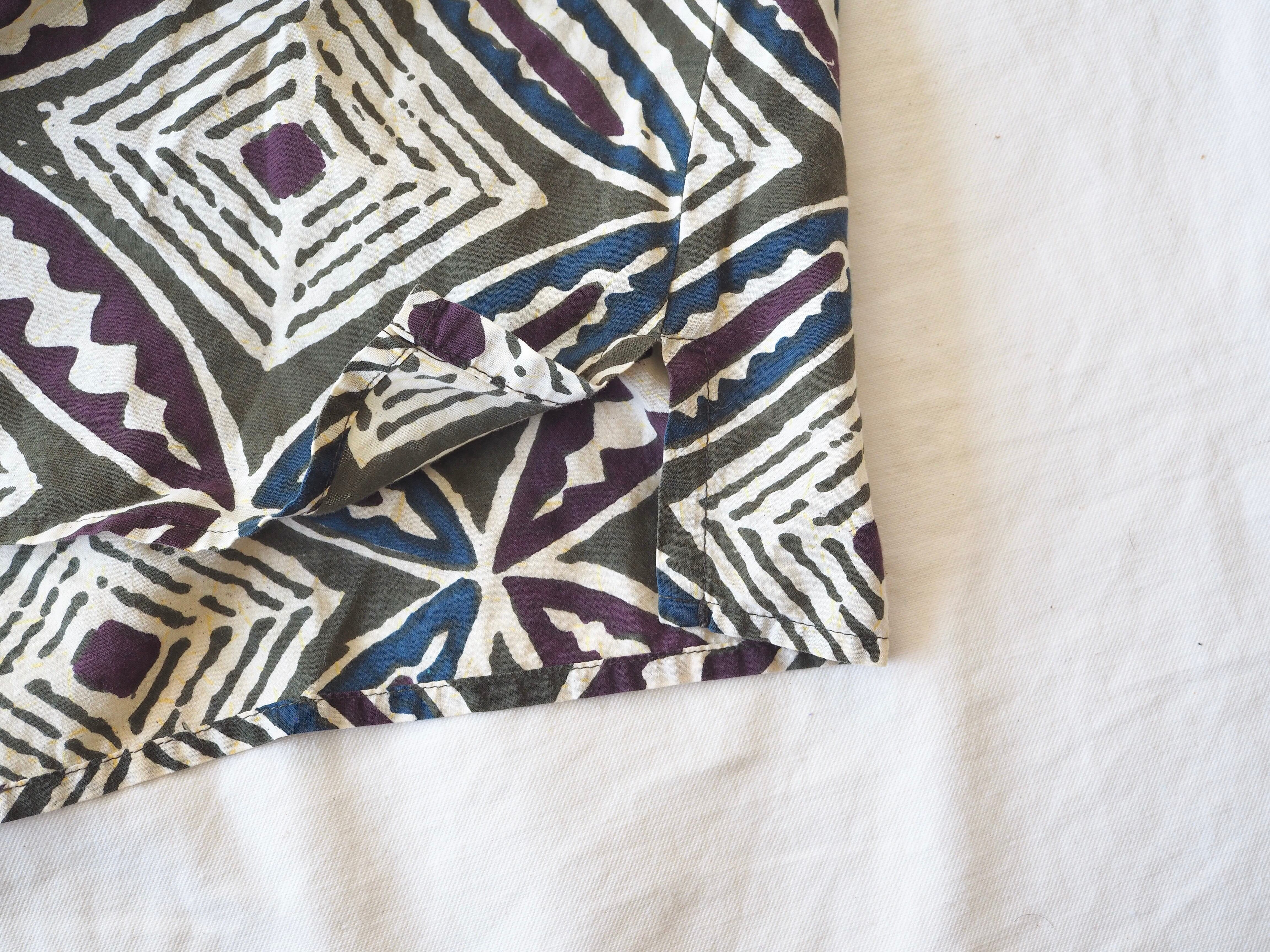 サイドベンツ入りのボックスシルエット、ココナッツボタン仕様の総柄シャツ。