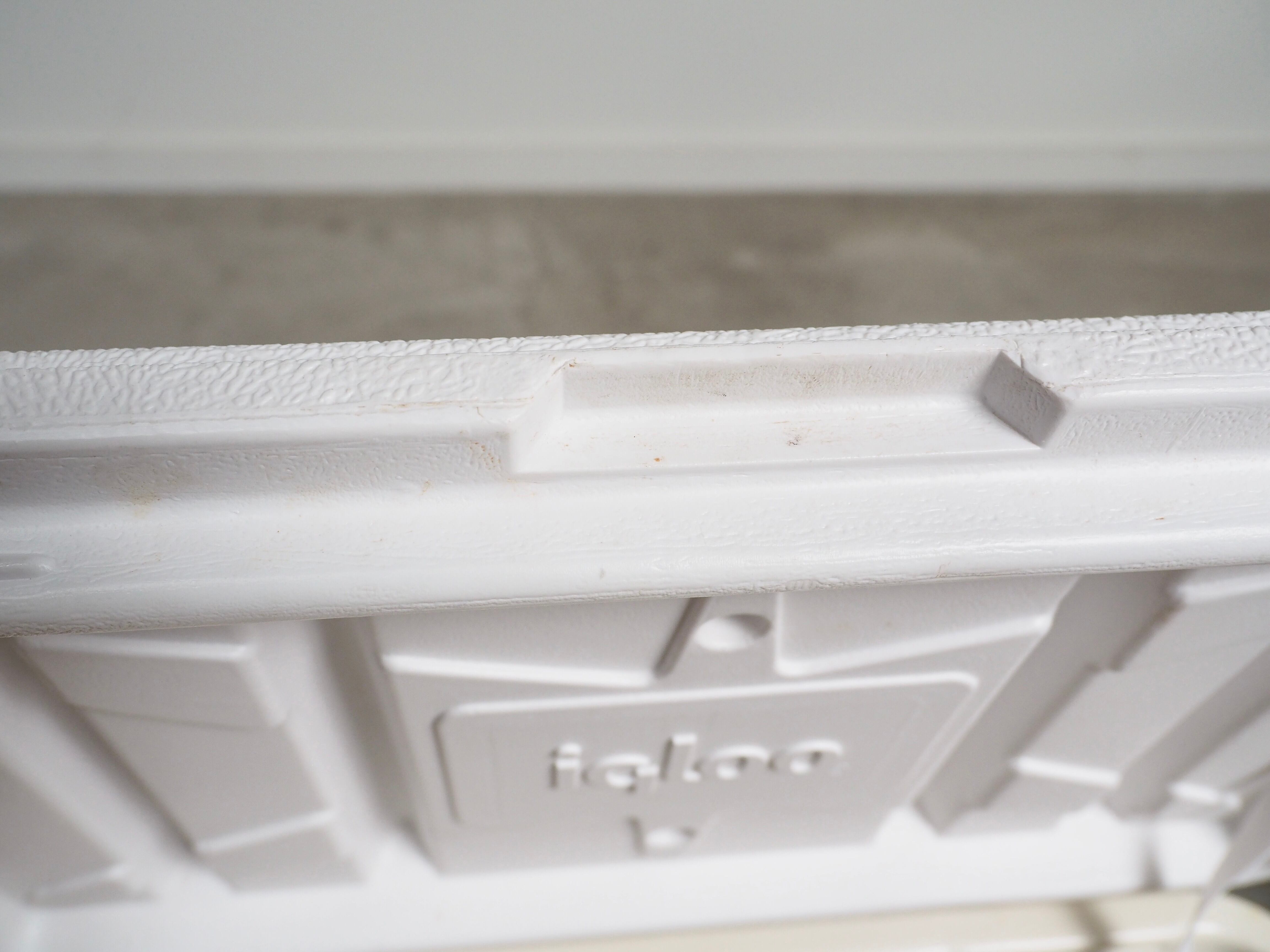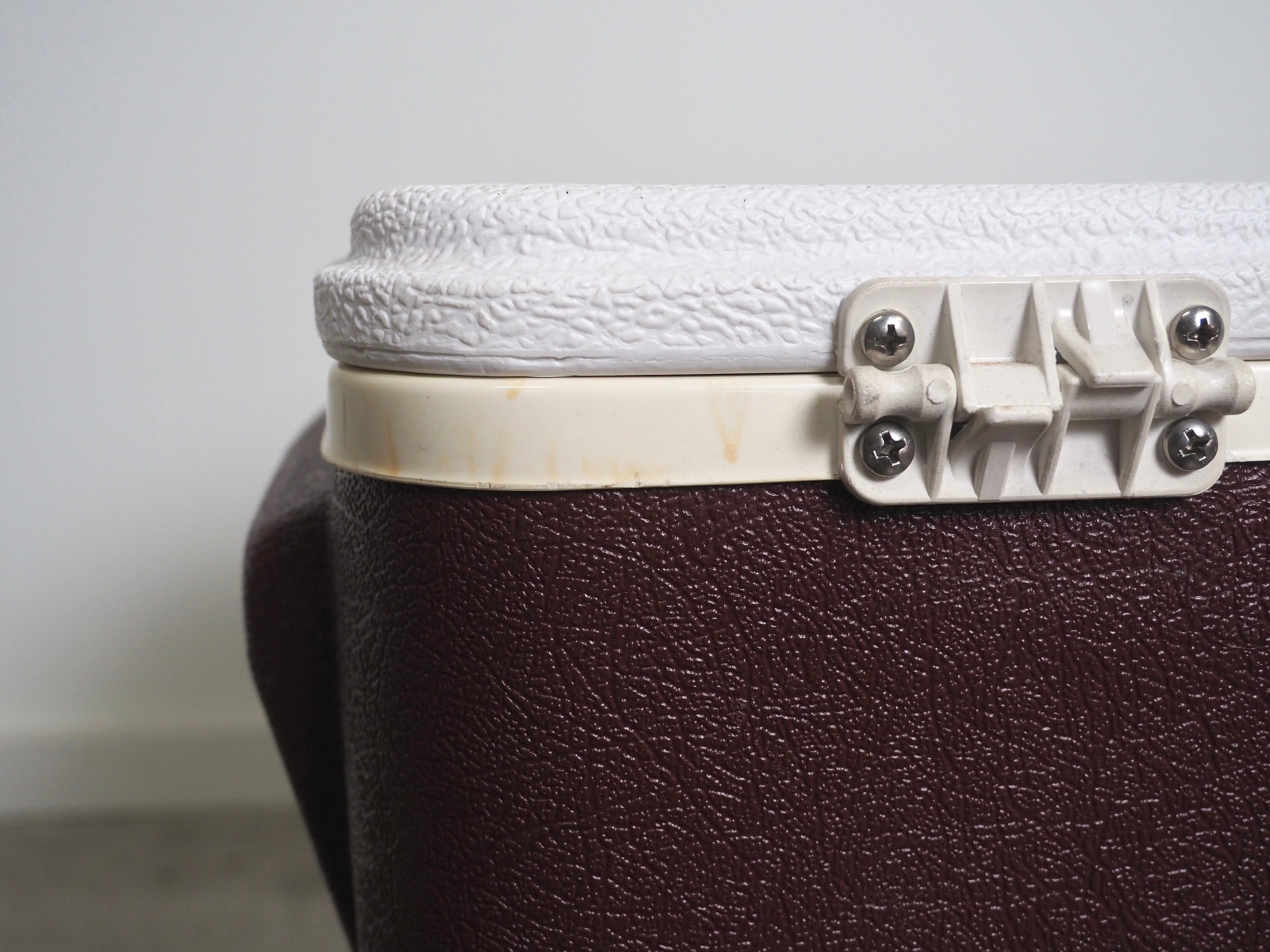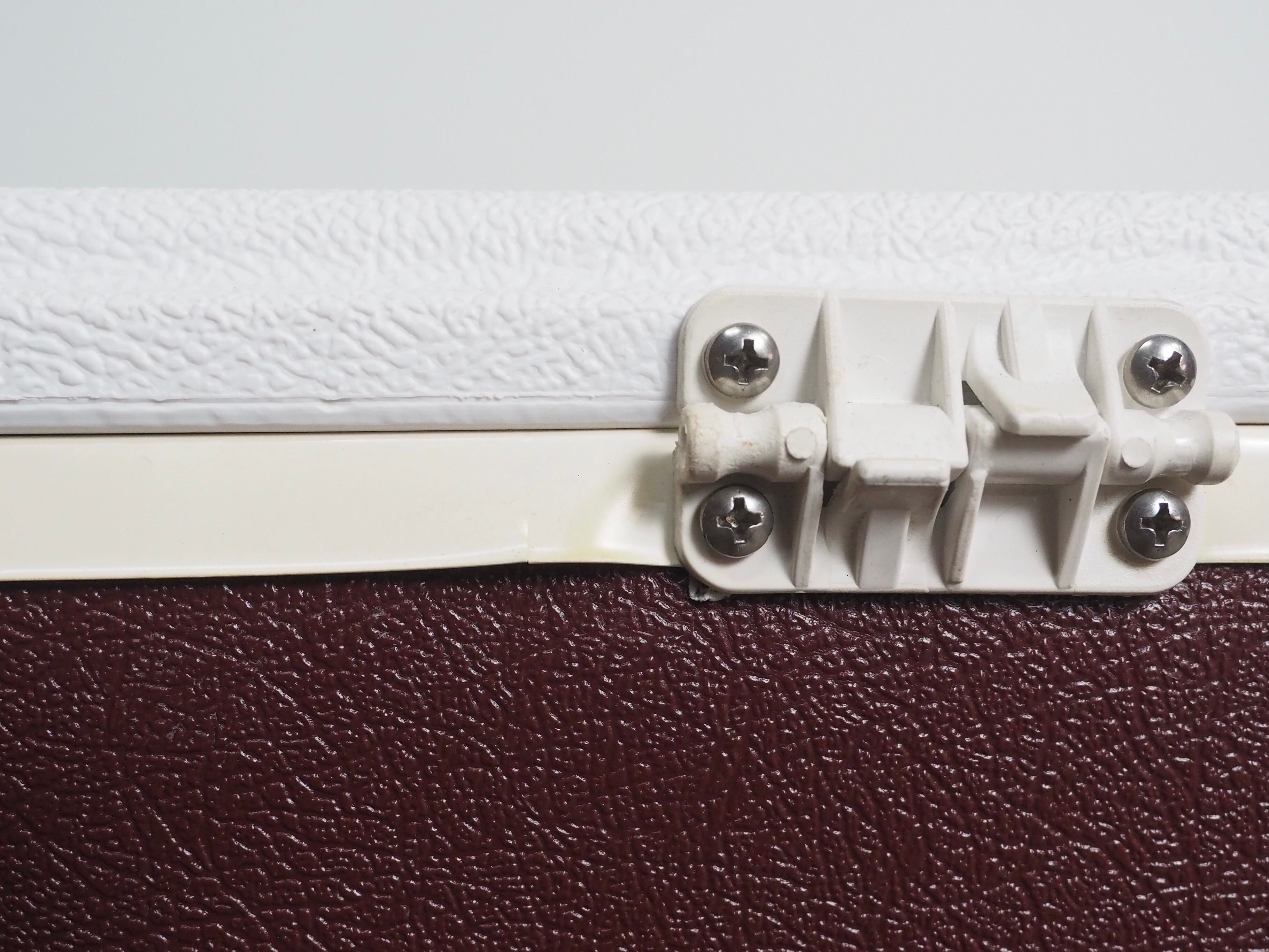 ボディー側のプラスチックパイピング部分に変色と歪み、上蓋留め具の横に5mm程度の亀裂箇所有り。内部はクリーニング済ですが薄い汚れ程度はございます。開閉時に少しキィーと音がします。