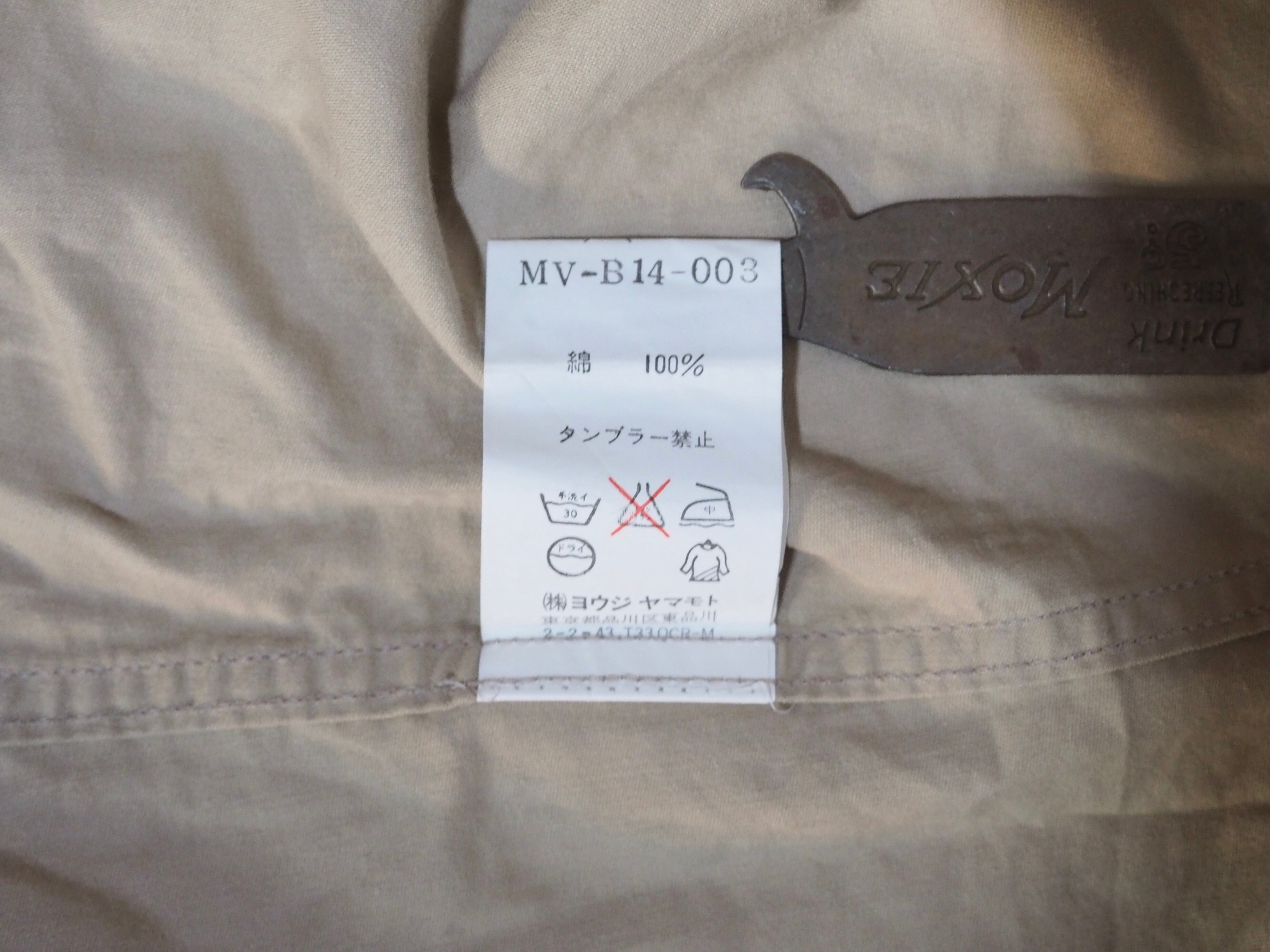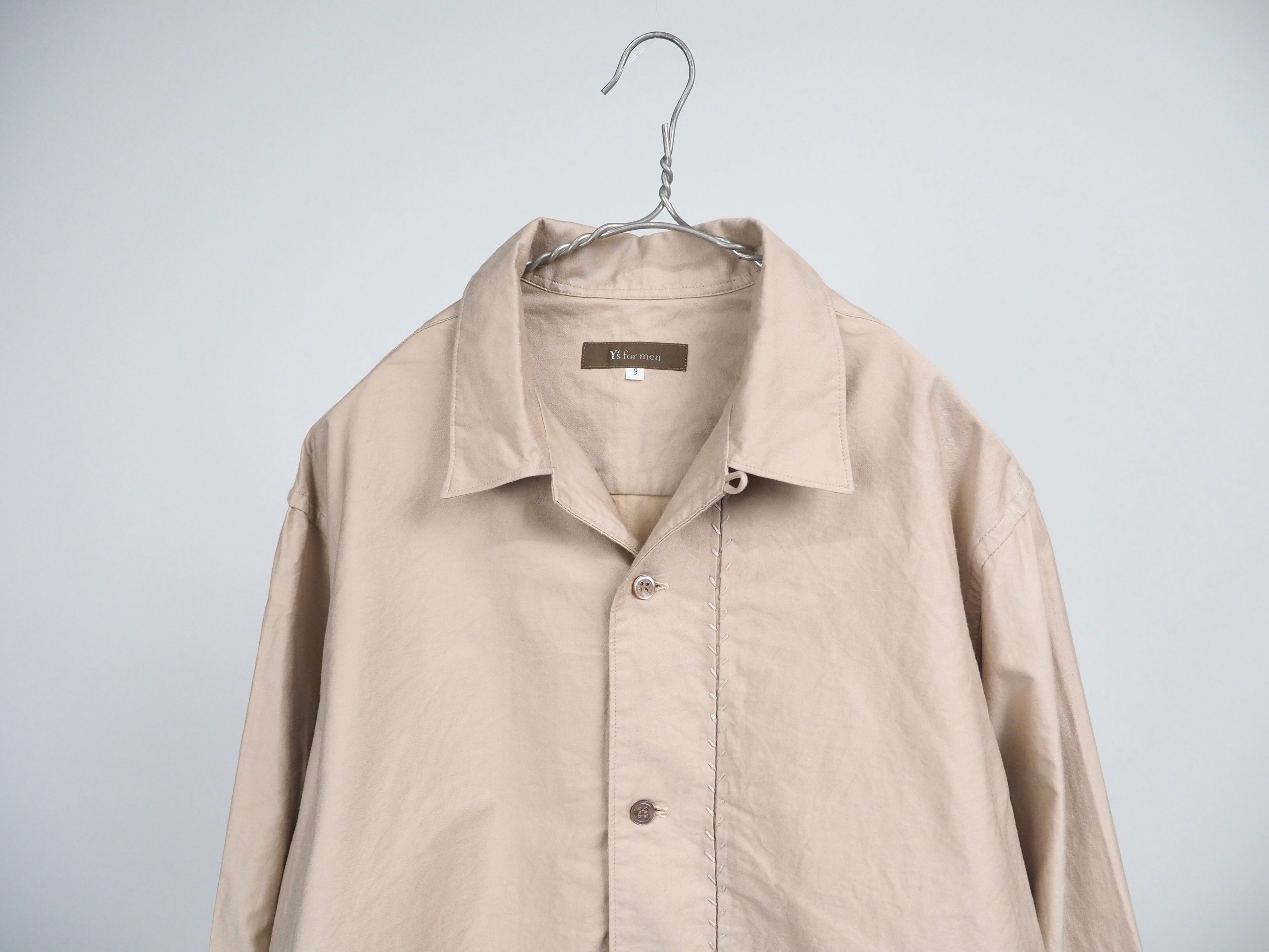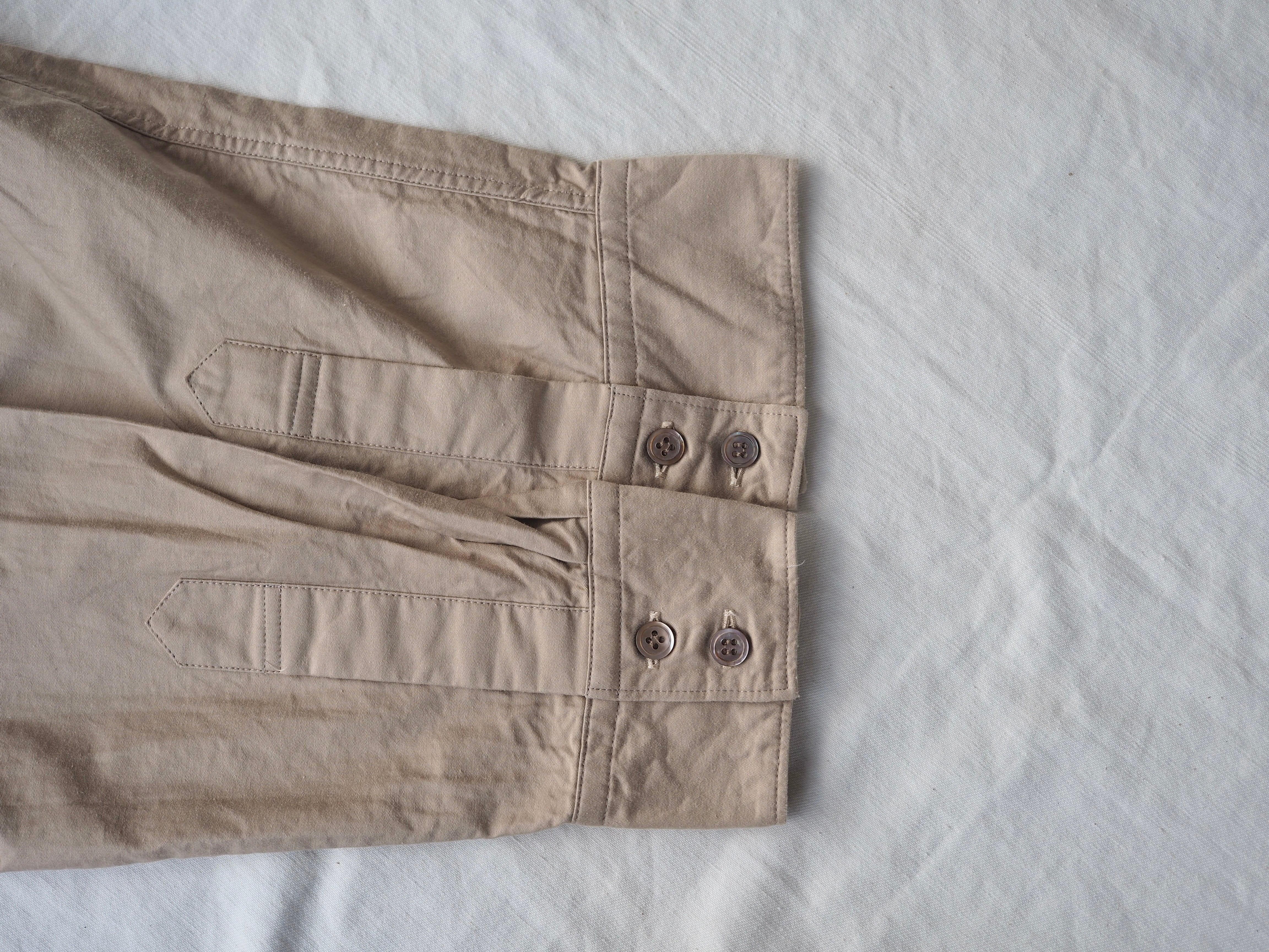 オープンカラーで裾は緩やかなラウンドテール、100%コットン、ライトベージュカラーです。