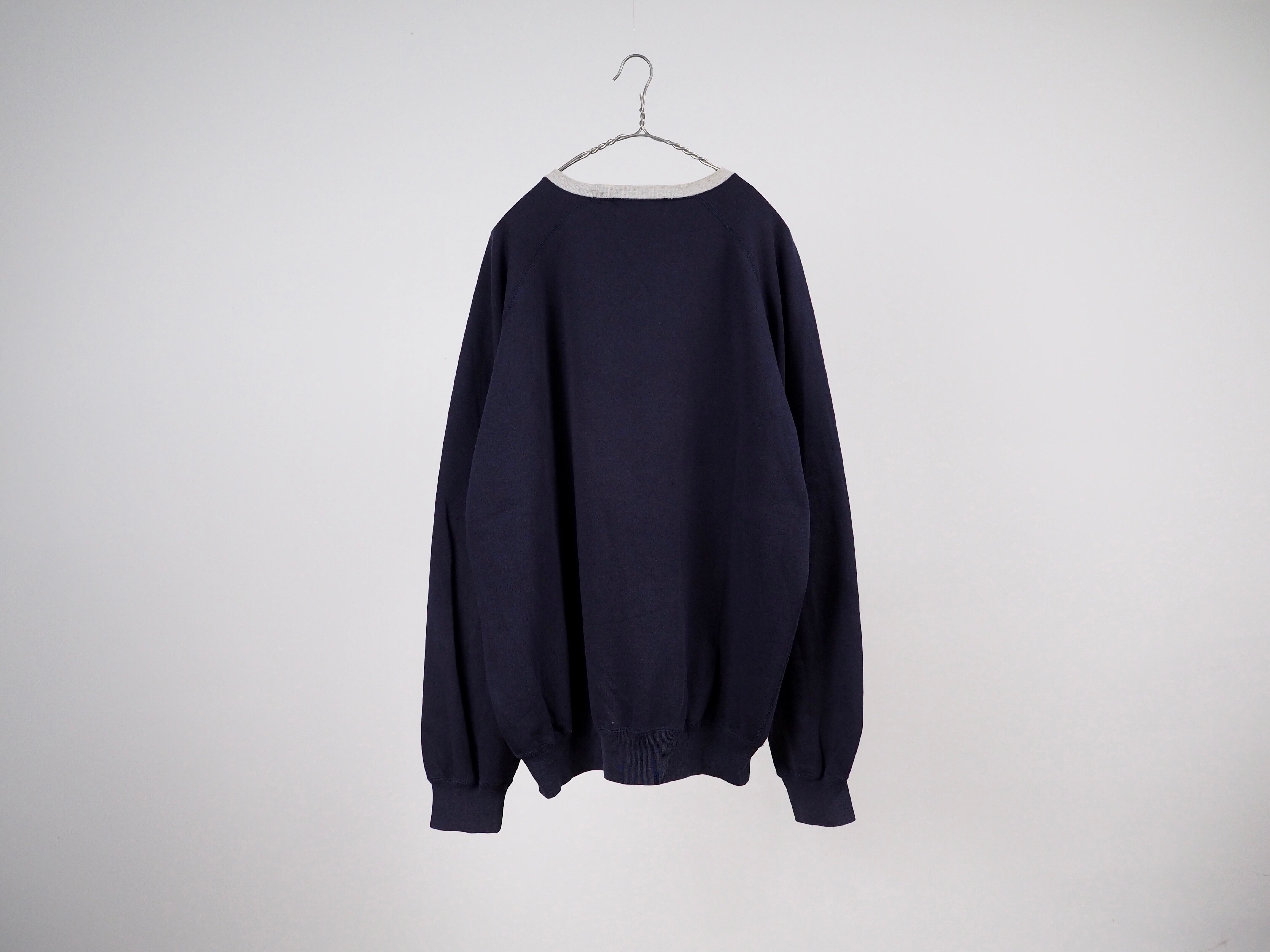 コットン/アクリルのやや薄手のスウェット生地。ネイビー×グレー、ビッグシルエットのラグランスウェットです。