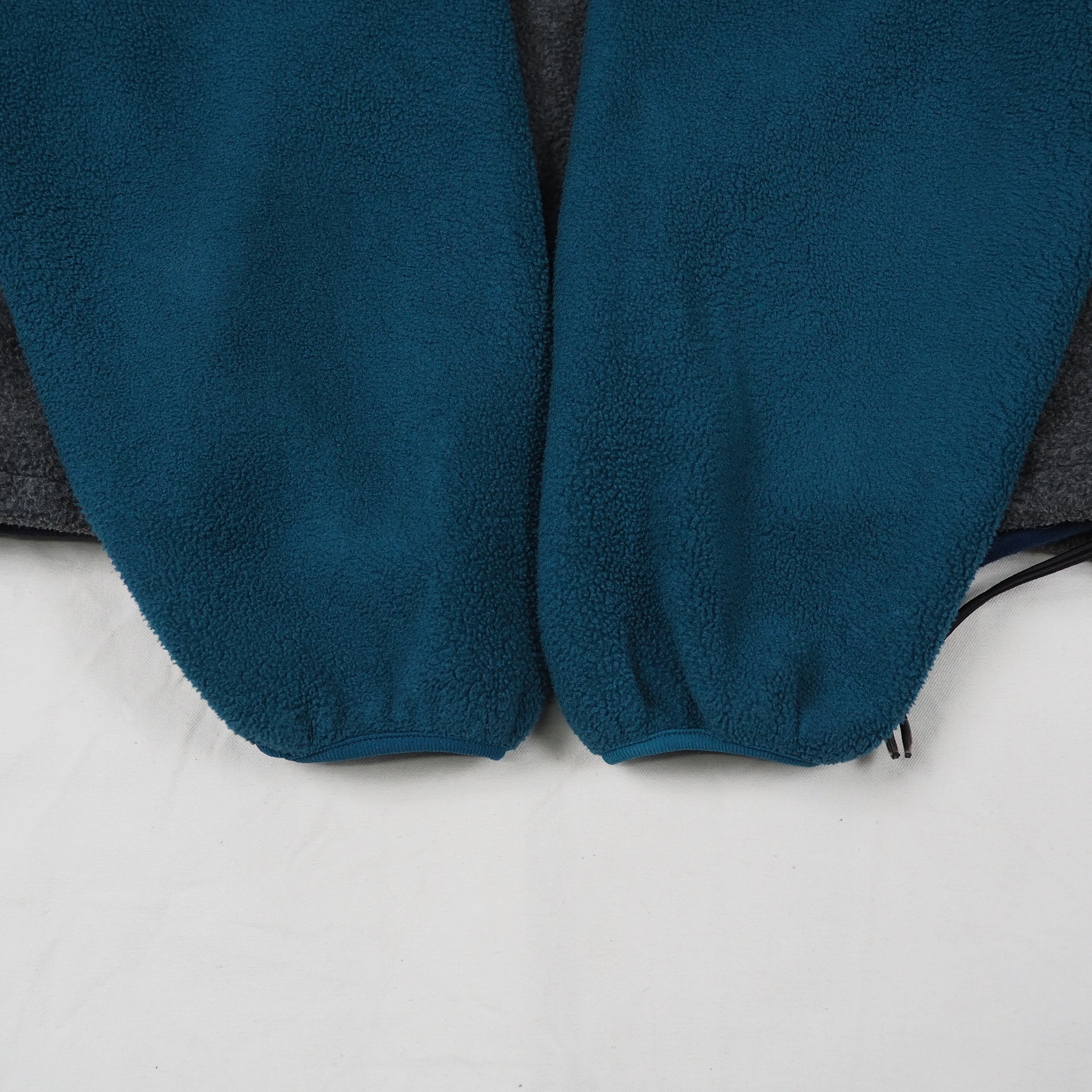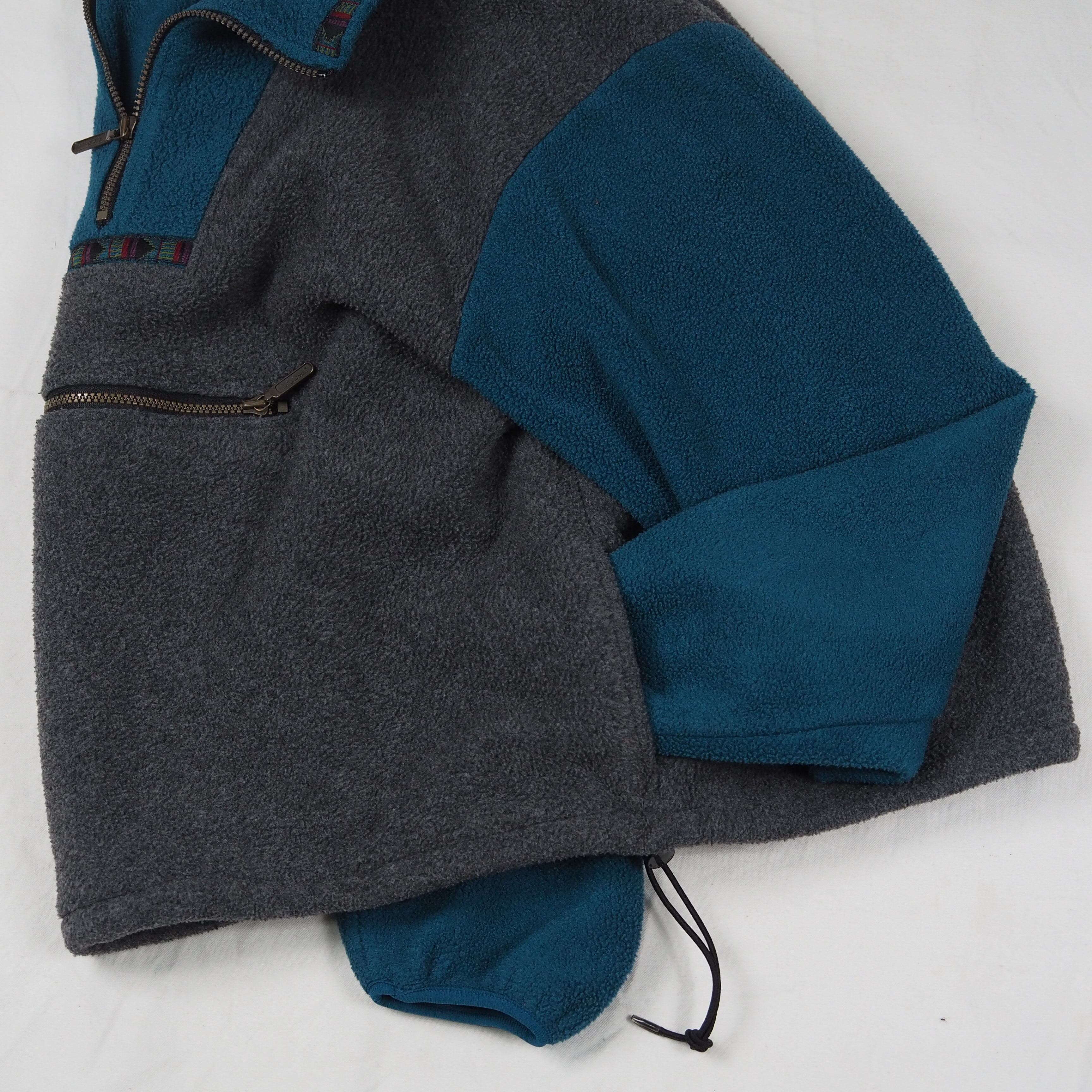 シンチラフリースのような厚手のフリース素材、裾にドローコードのついたプルオーバデザインのフリースジャケット。