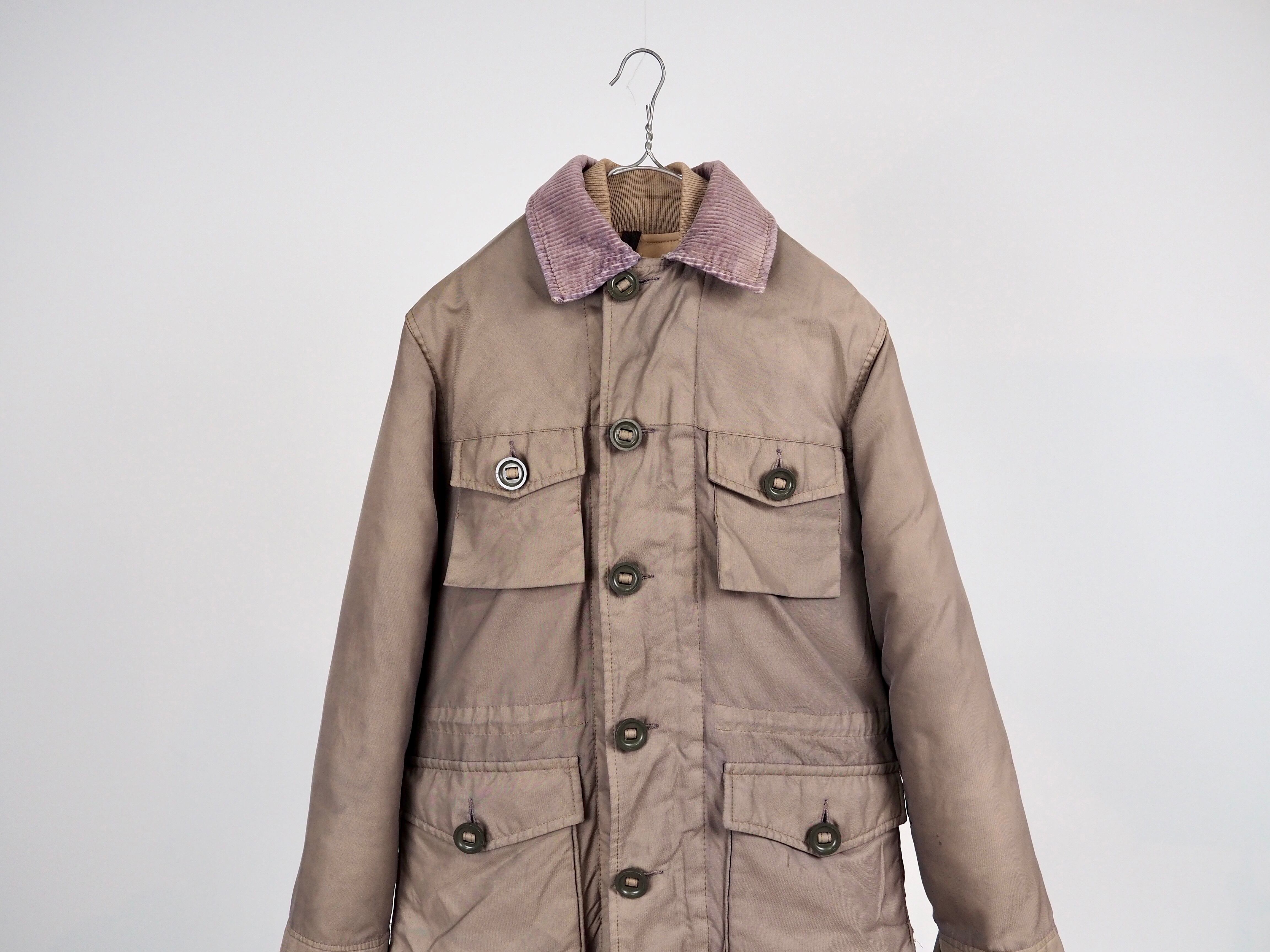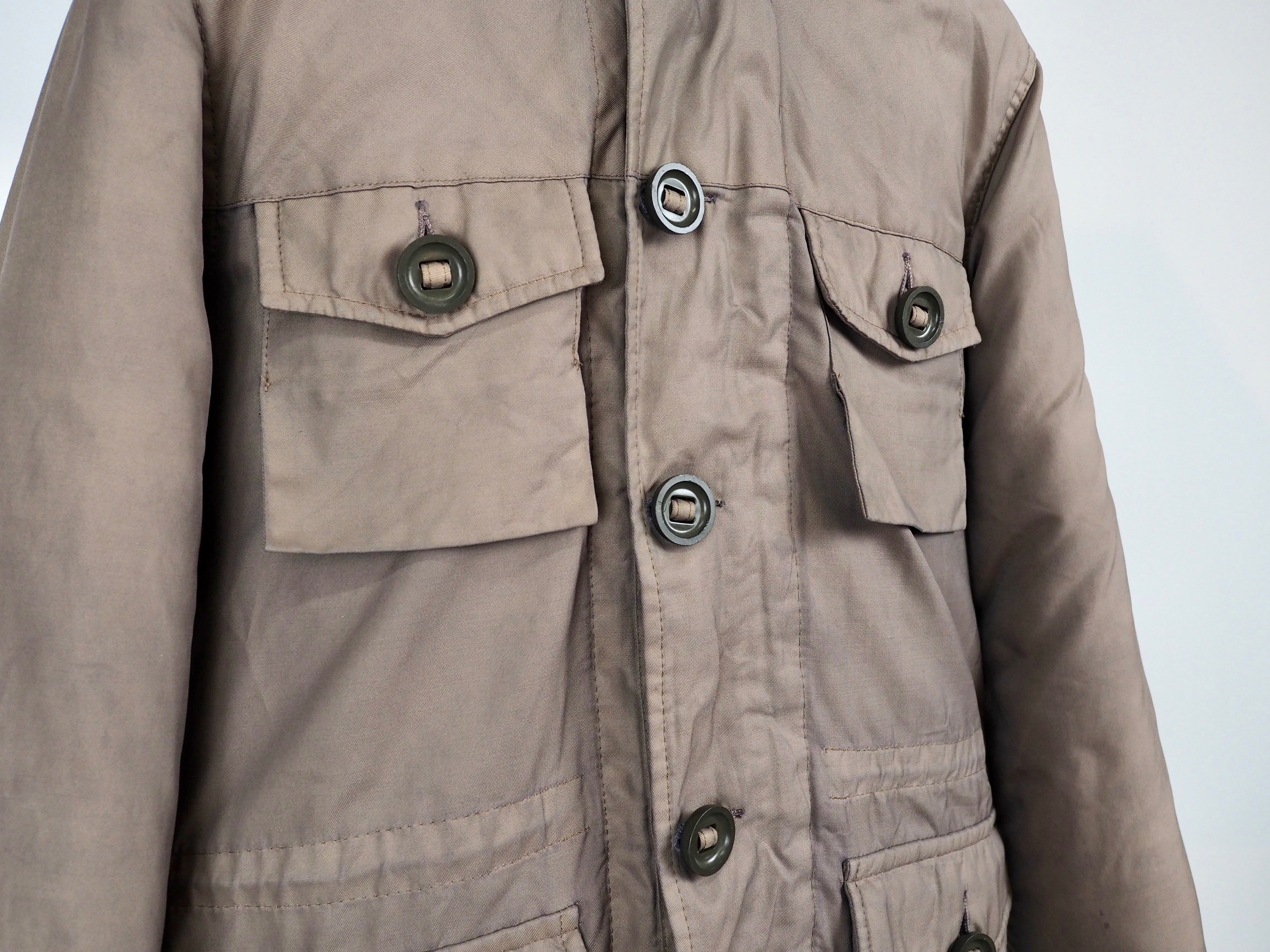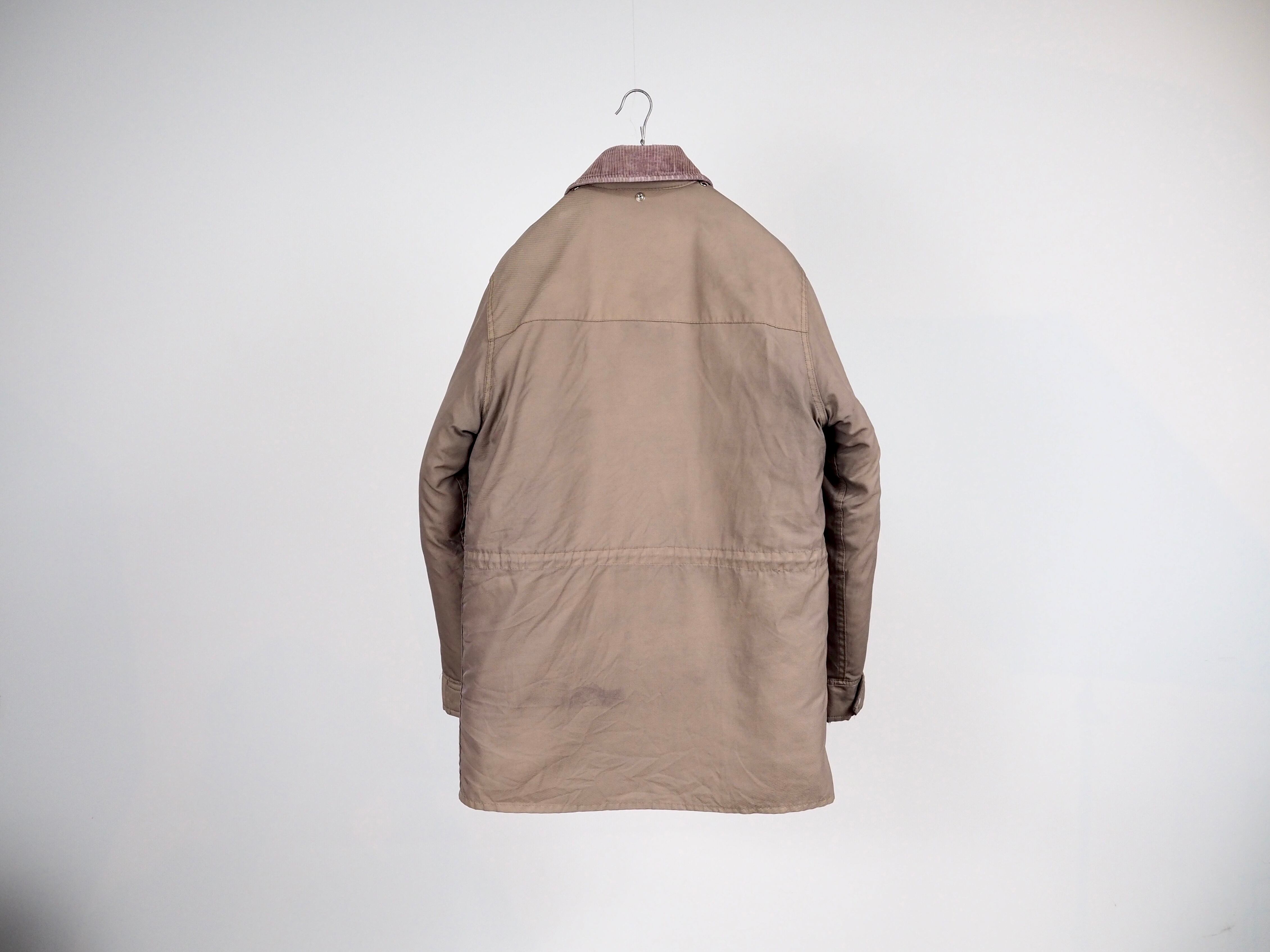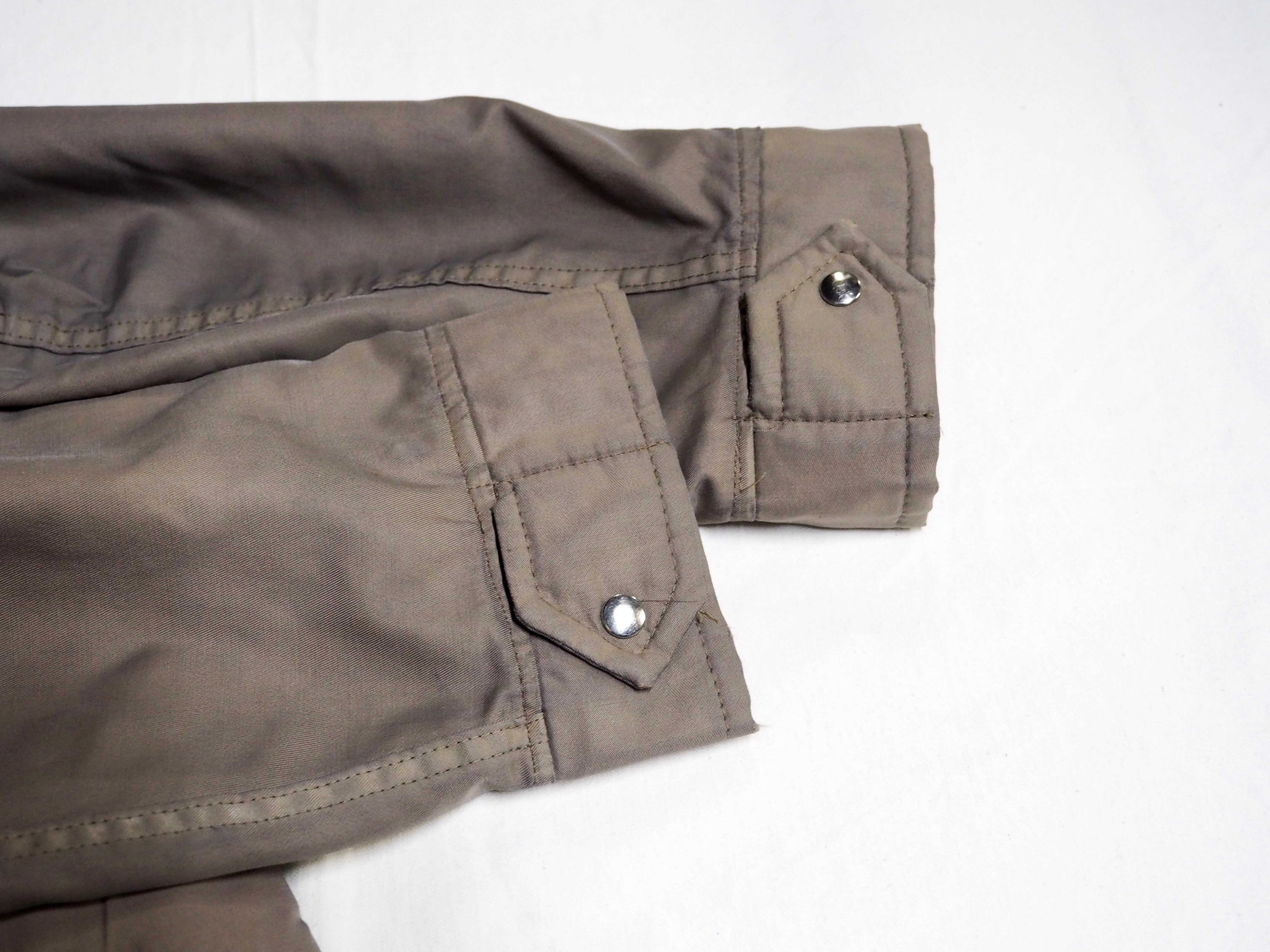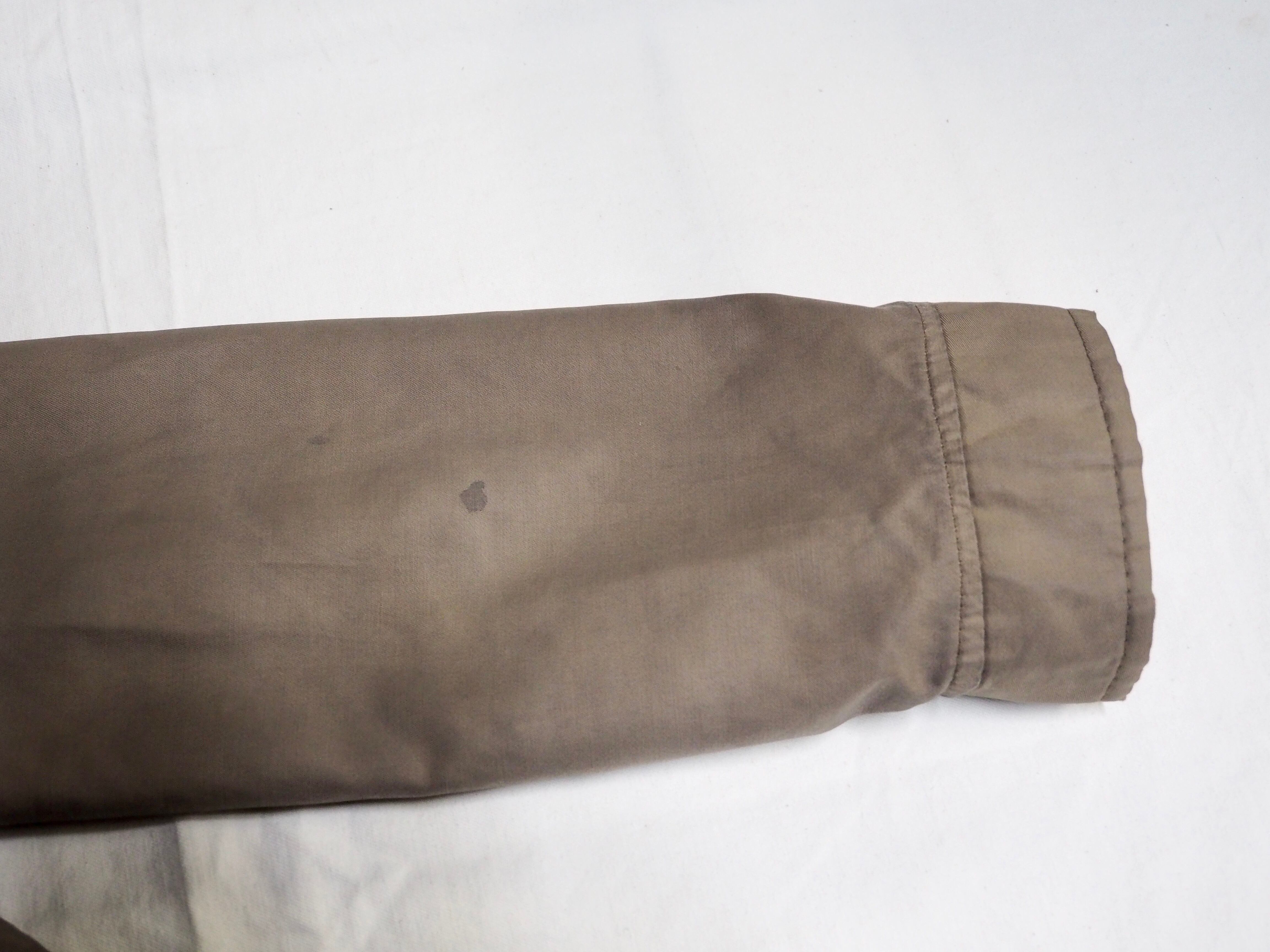 シェルの背面裾付近、袖付近にシミがございます。ナイロンシェルは着用感のあるコンディションですがポリエステルライニングのコンディションは良好です。