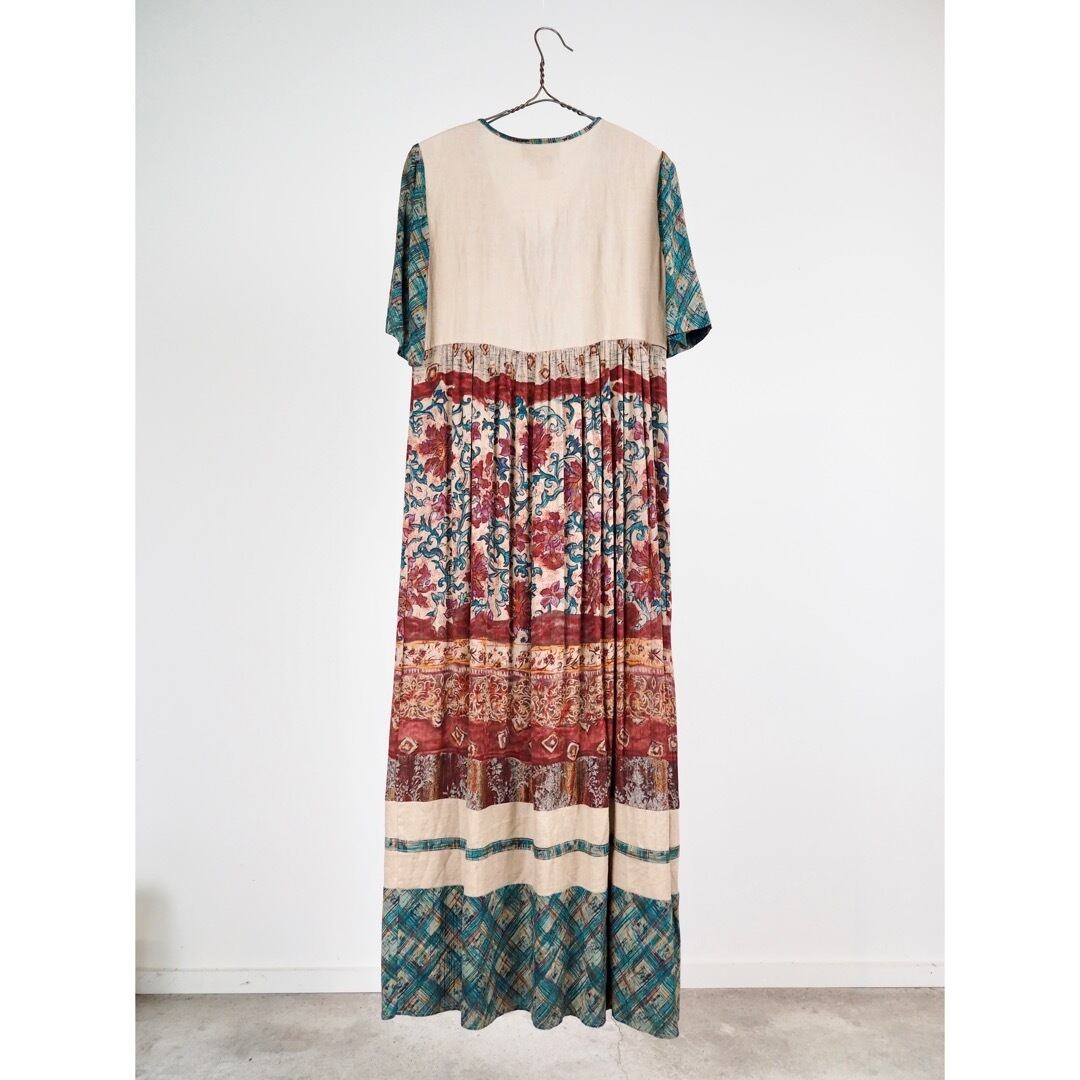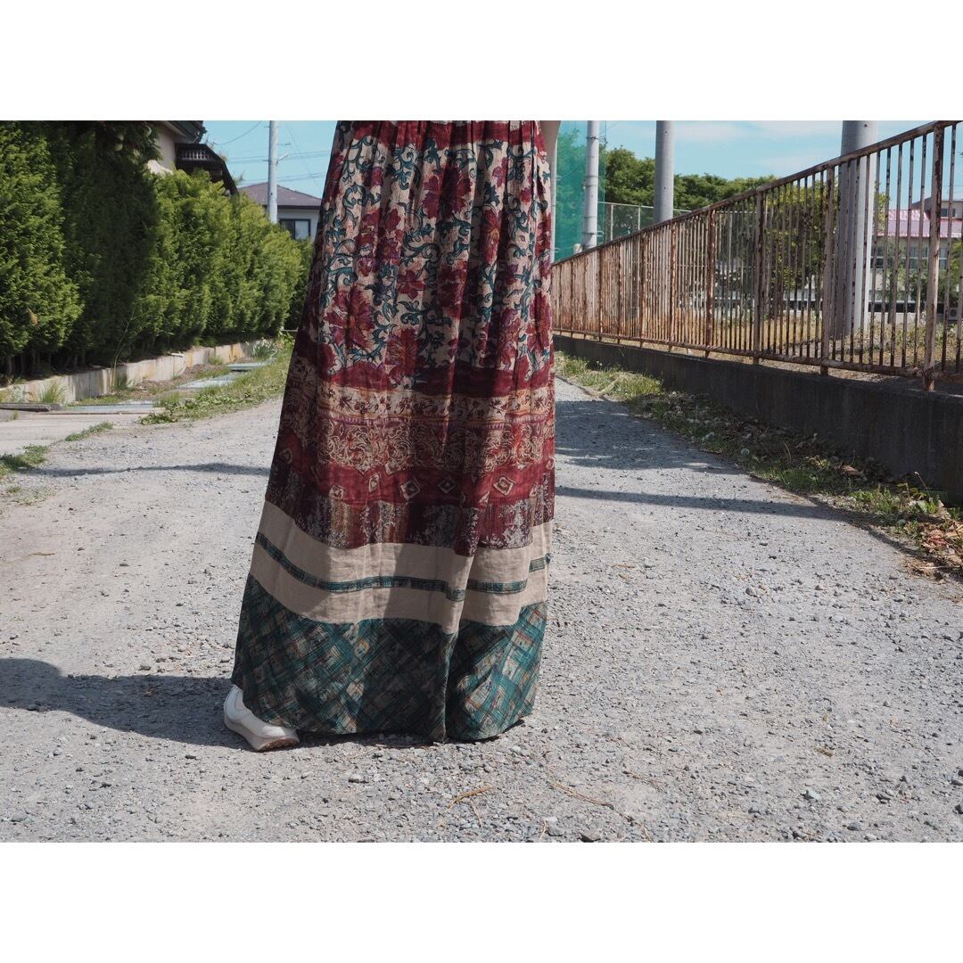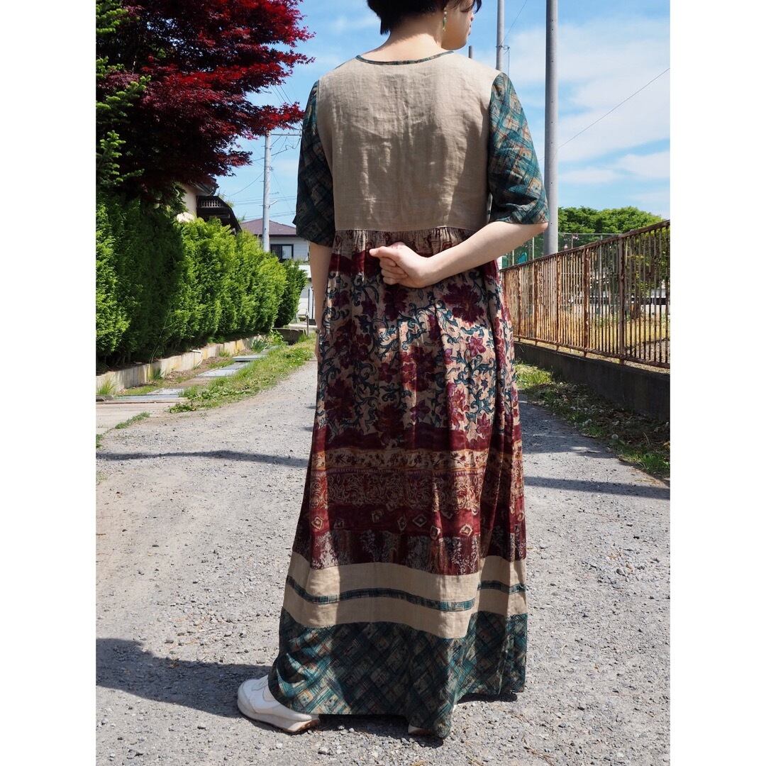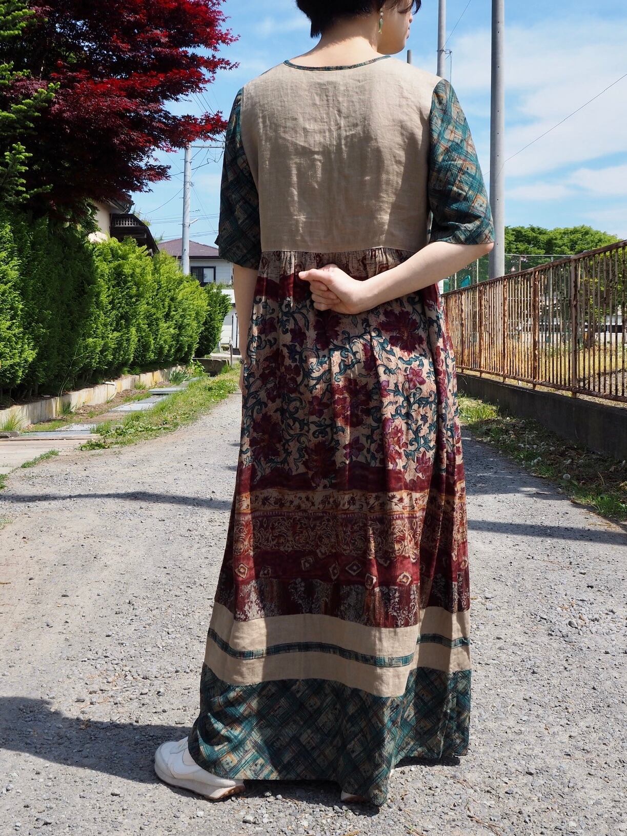 スリーブ部分はレーヨン100%、ボディー(トップ部分)はリネン100%、スカート部分はインポートとしか記載がありませんがインド綿かな?(ヴィンテージのインド綿ワンピースなどよりは少し硬めのしっかりした質感です)と思います。