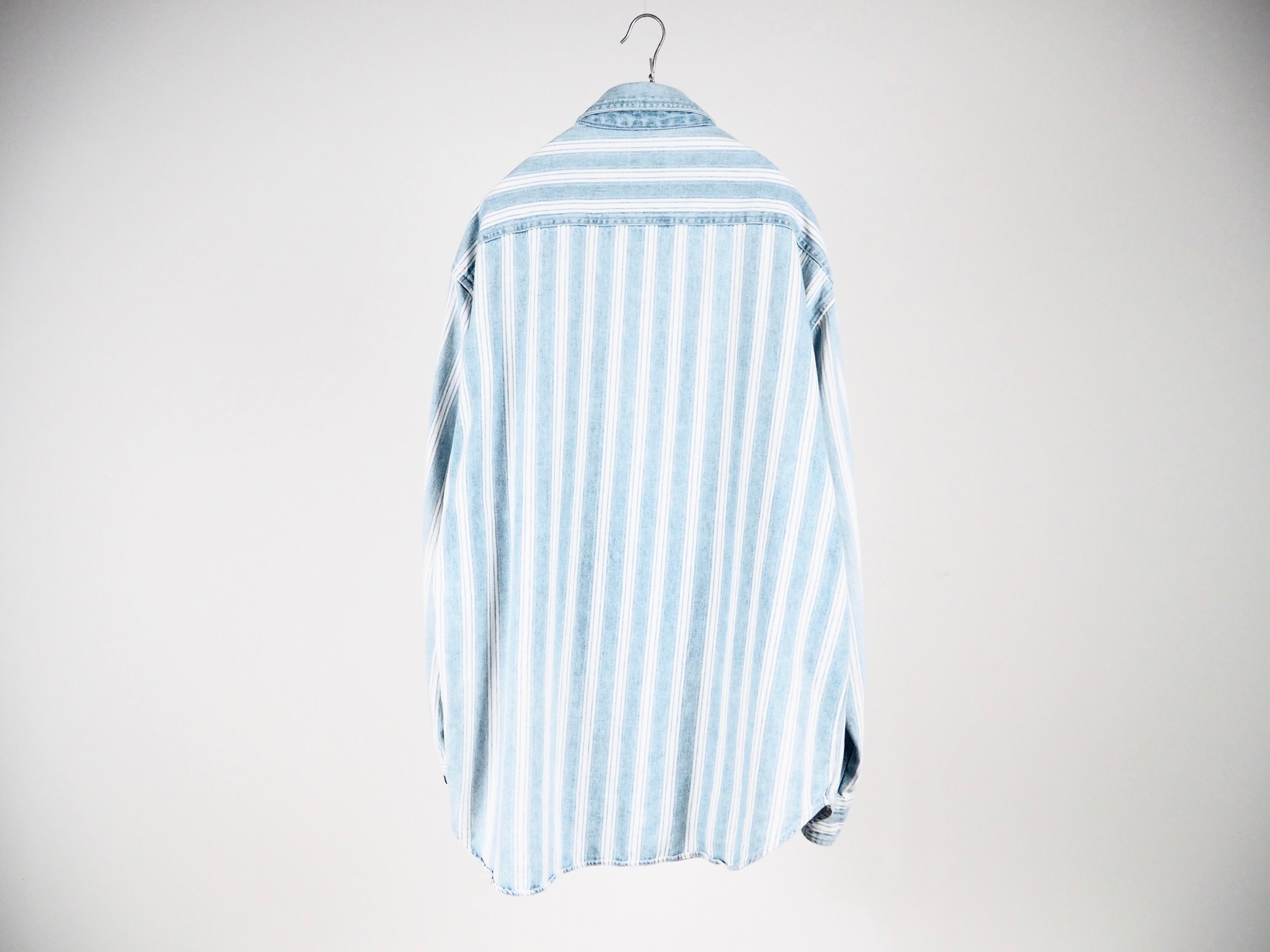 ブルーデニムのストライプ柄に刻印入りシルバーボタン、ちょっとジャケットの近いような厚手のデニム生地です。