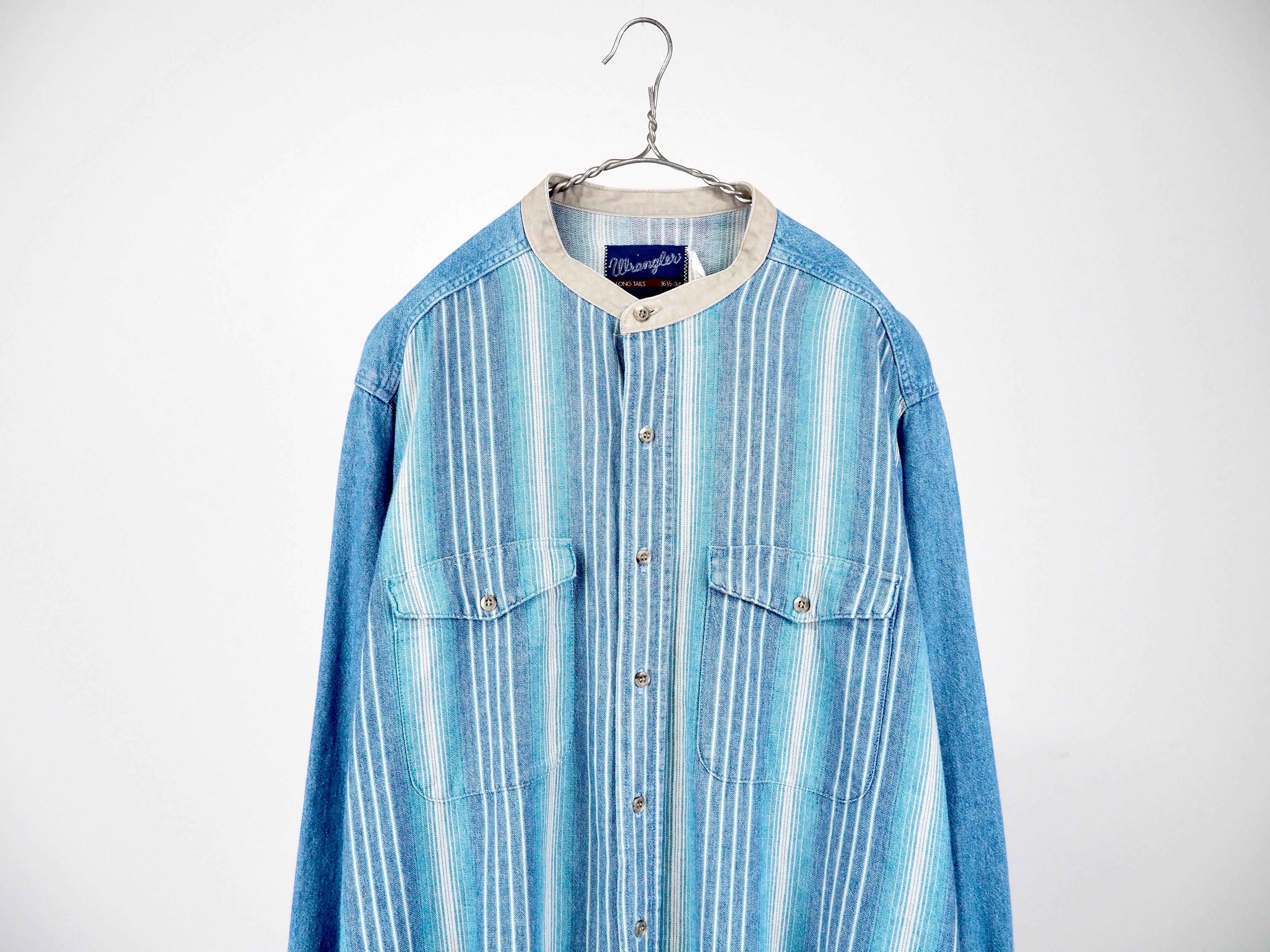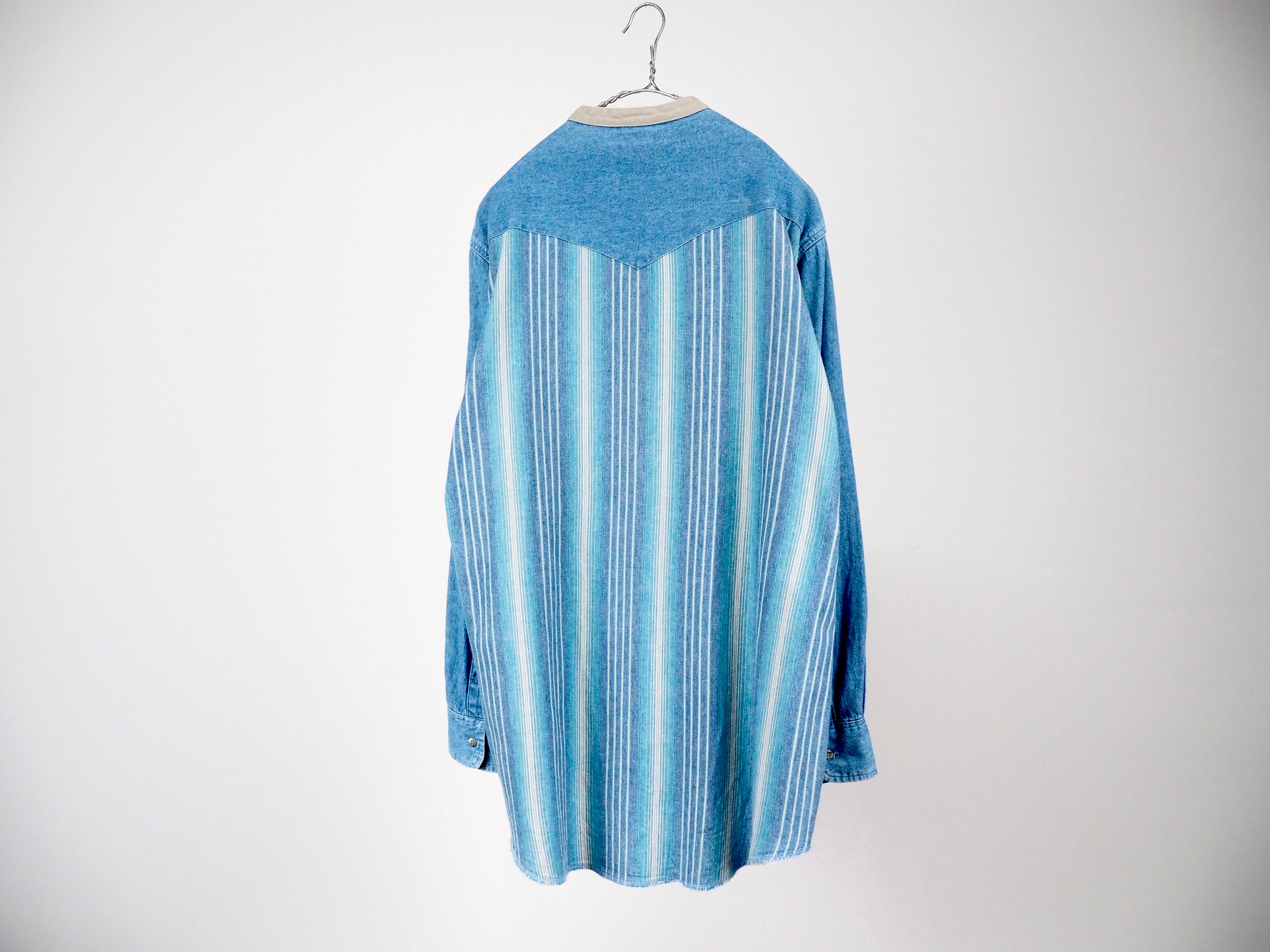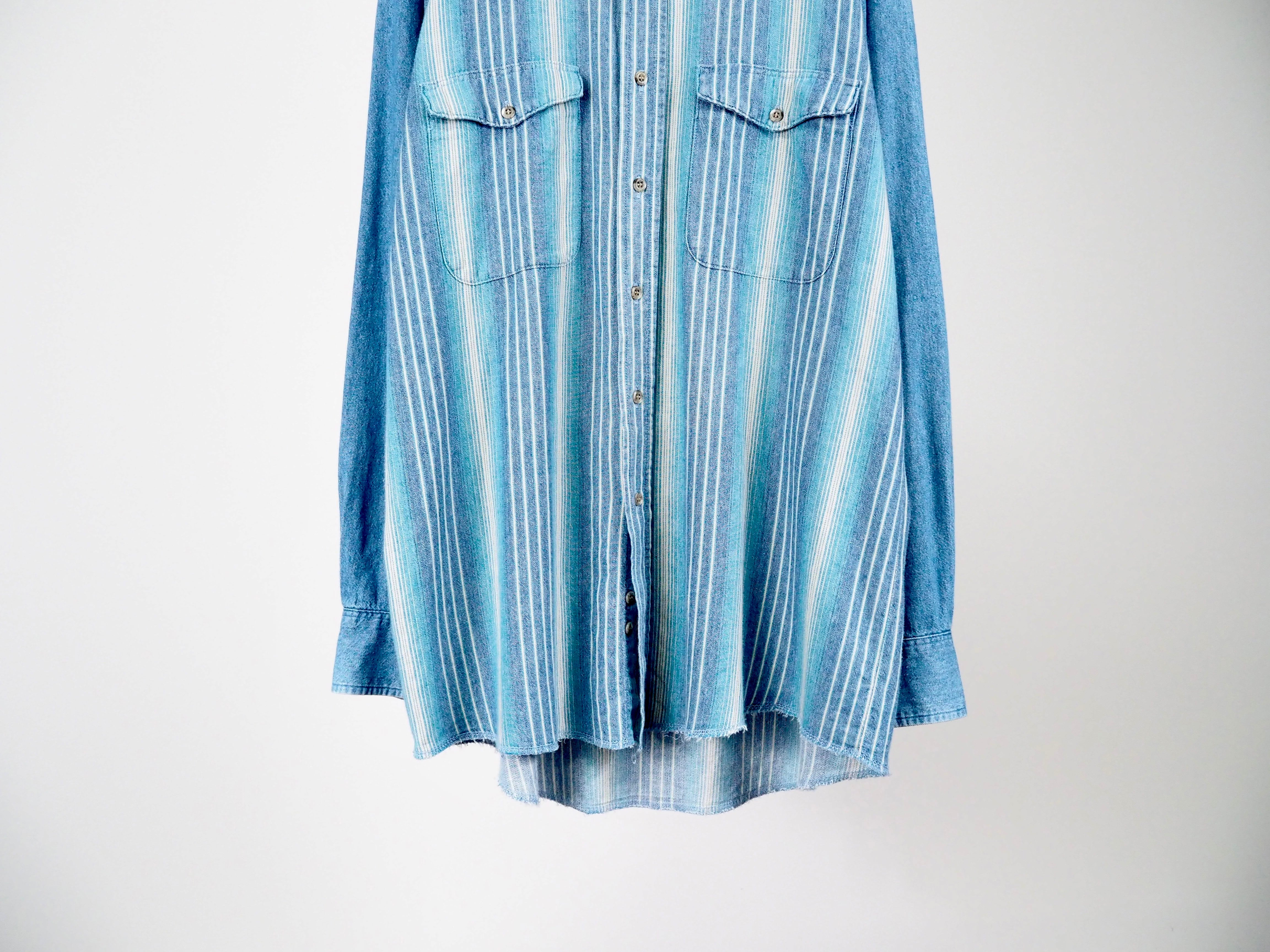 スリーブとバックヨーク上がデニム生地、ボディーがコットンストライプ生地の切替デザイン。