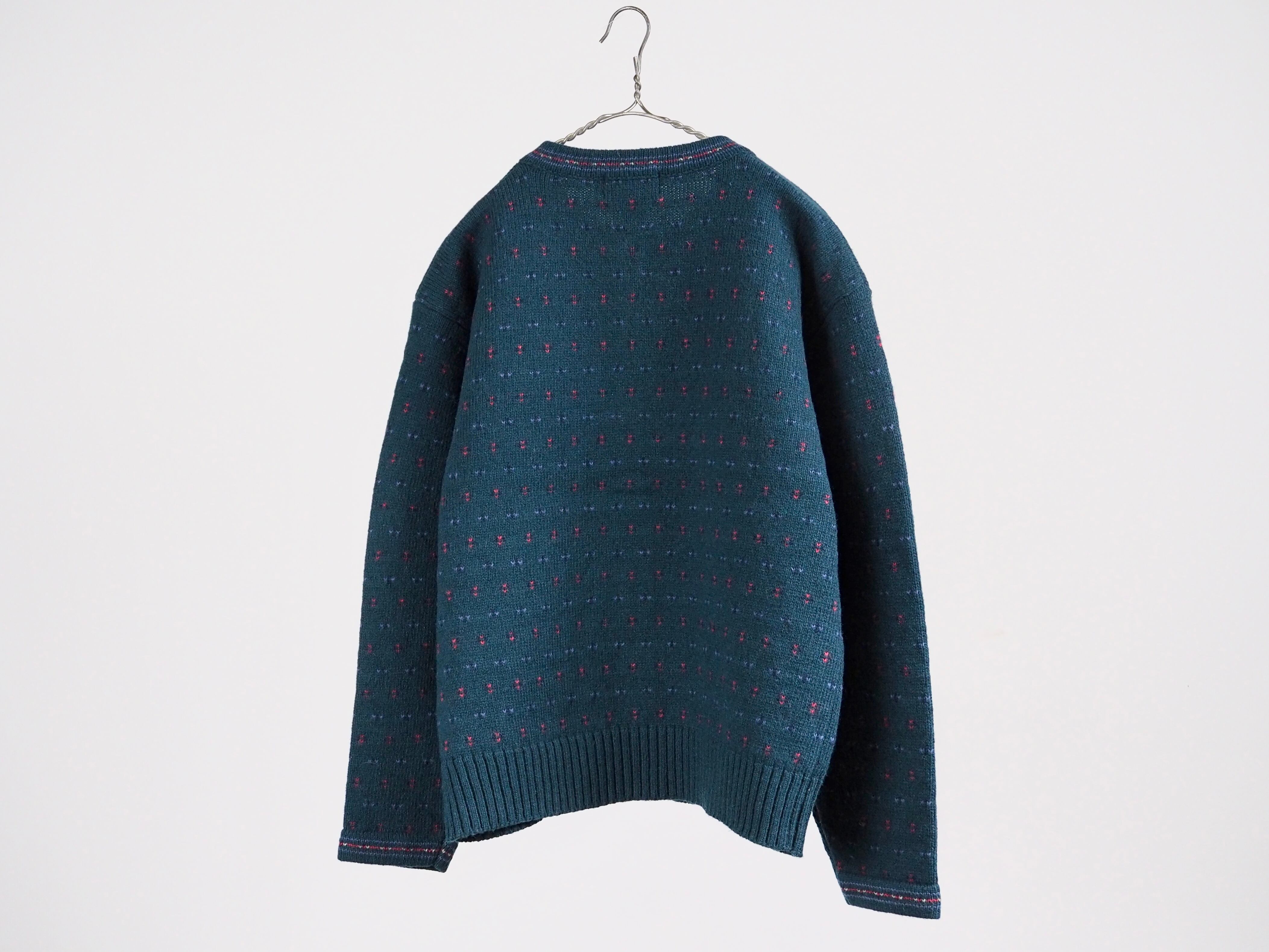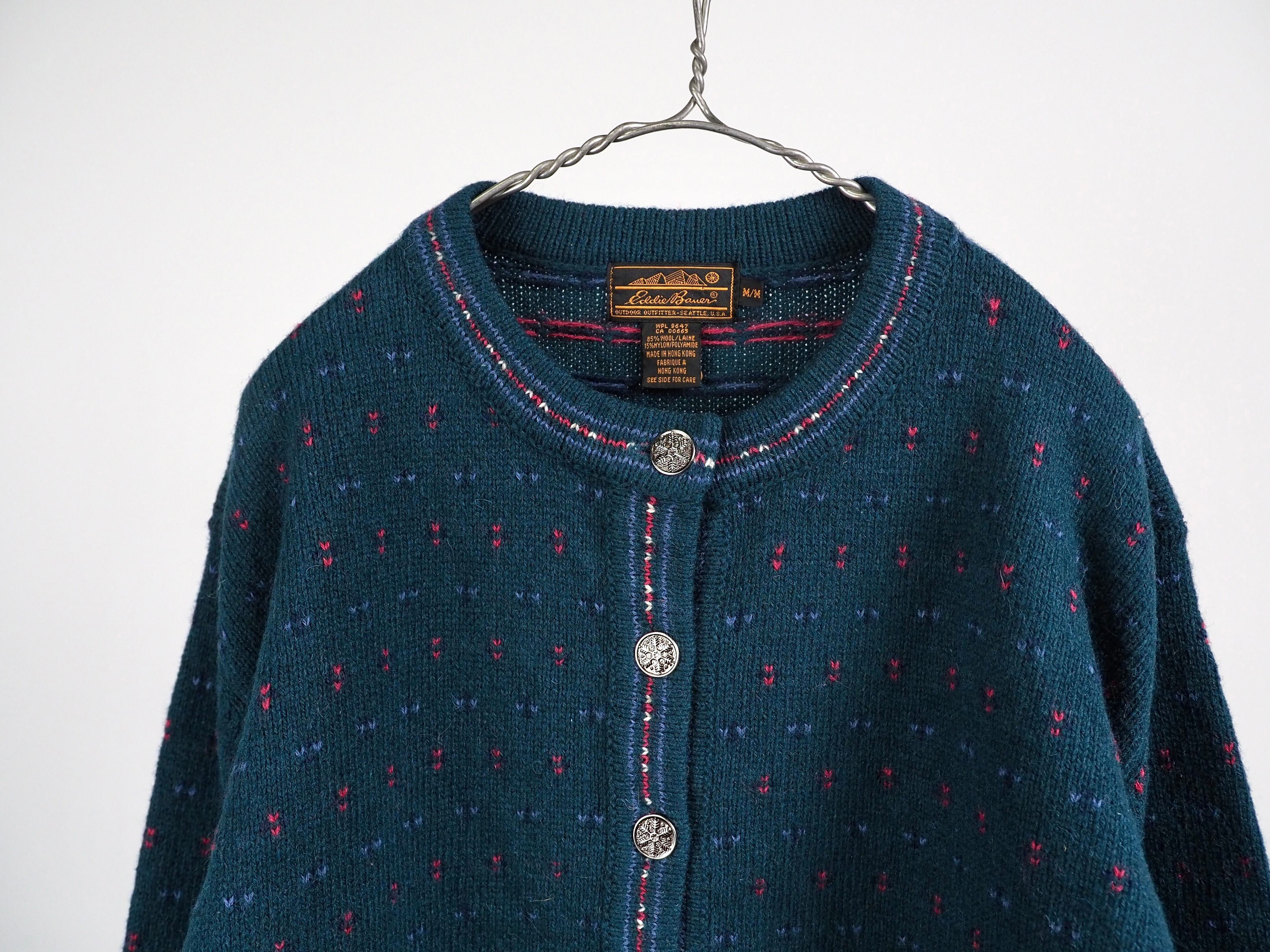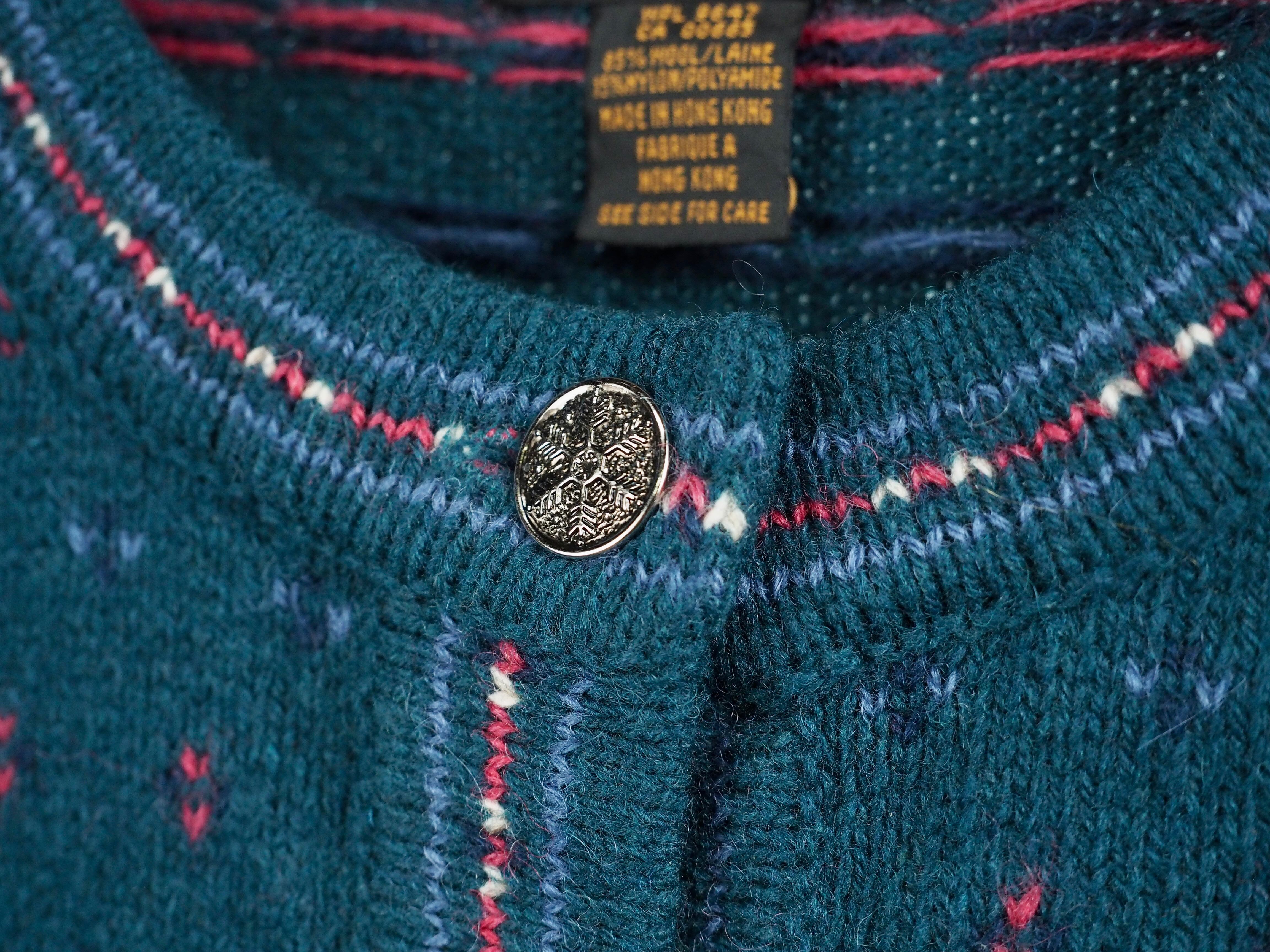 ダークグリーン系のボディーにスノーフレイク柄のメタルボタンをした上品な印象のアイテム。