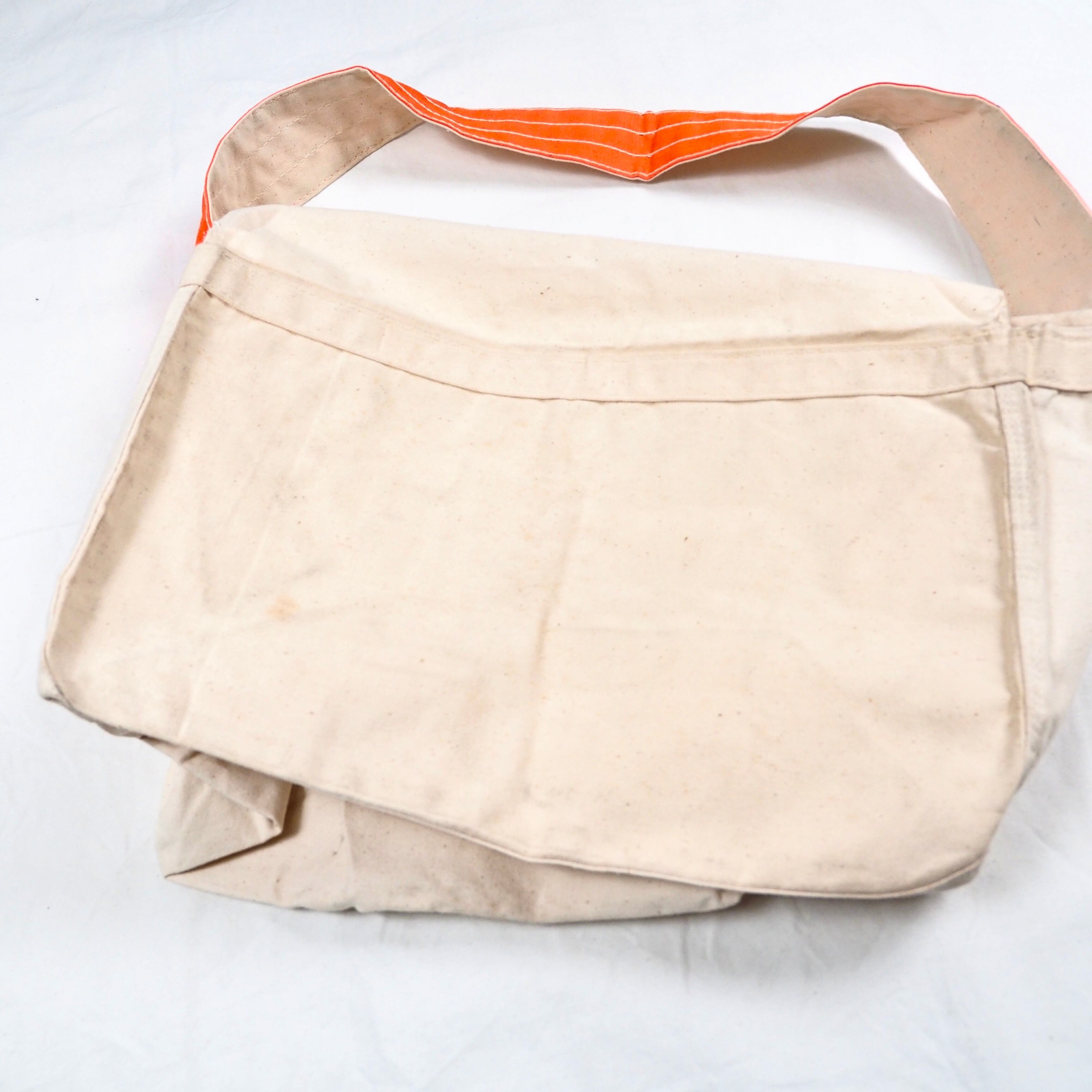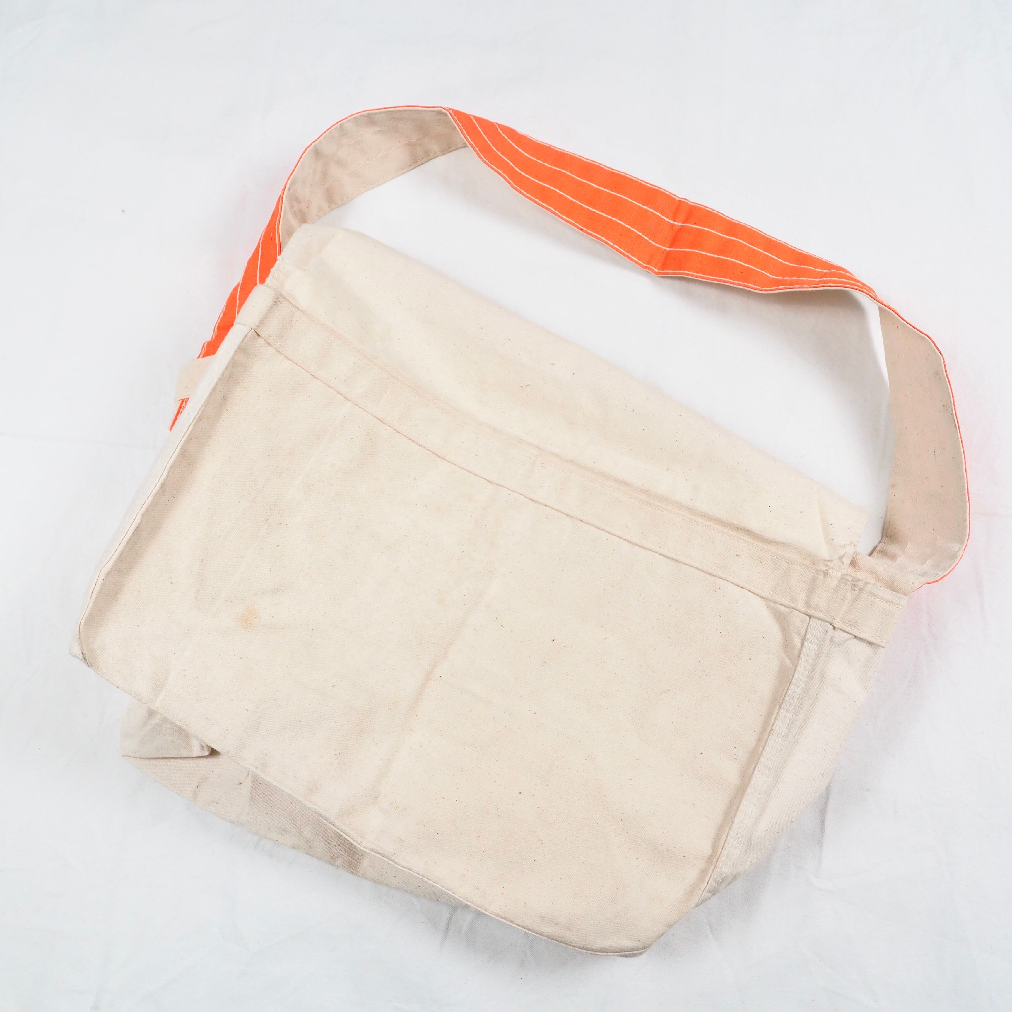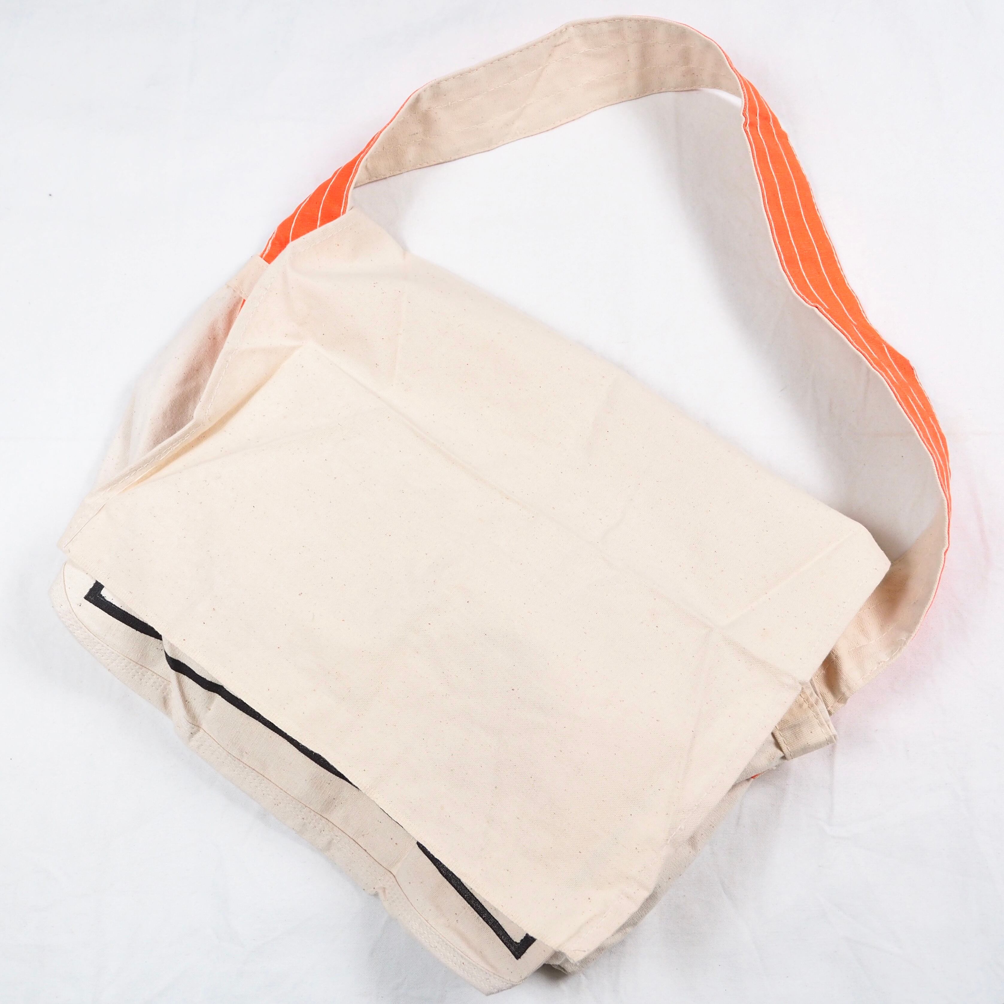 生成りのキャンバスボディー、オレンジのリフレクター付きのストラップ。