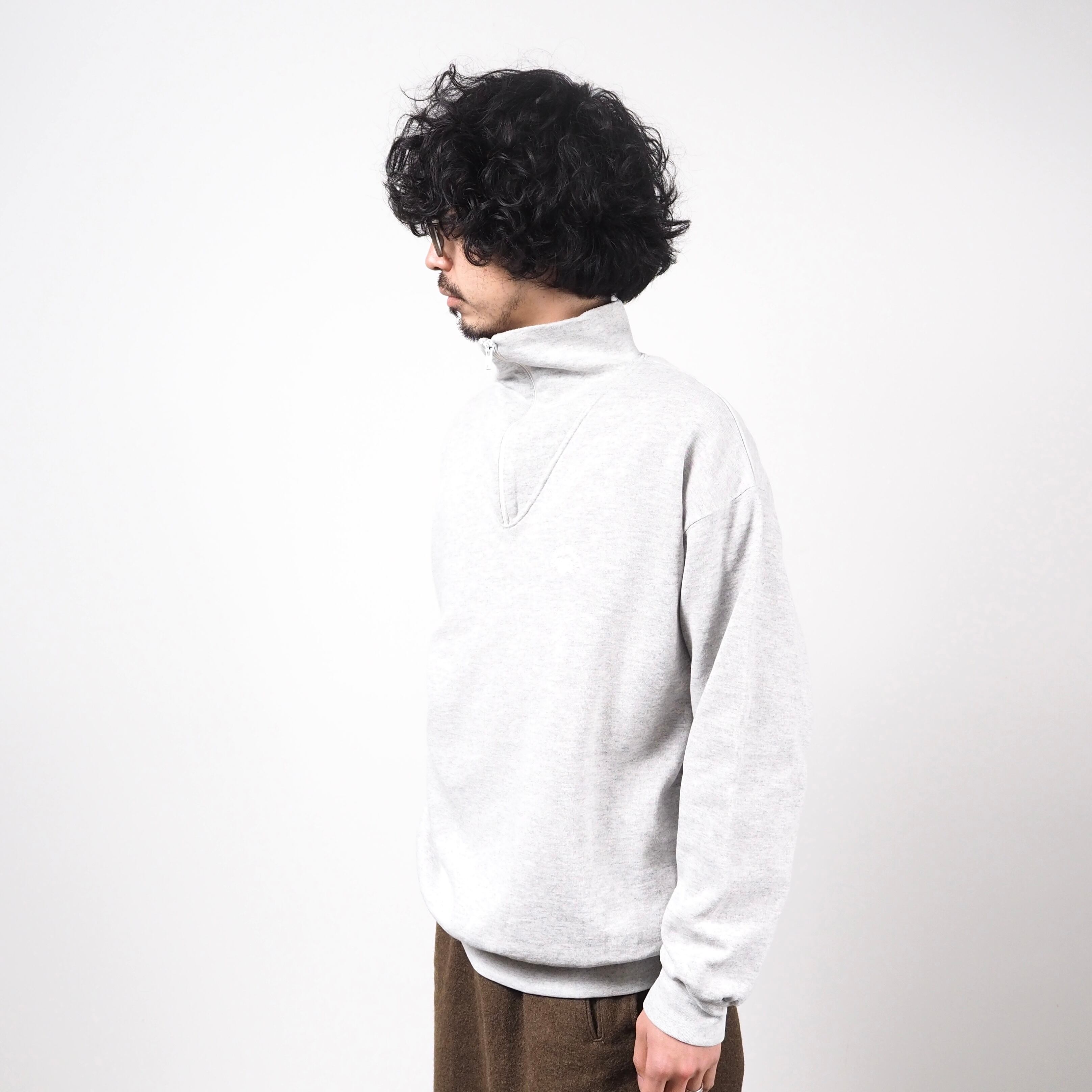 明るめのグレーカラー、首周りが広くとられたハイネックデザインのプルオーバー。