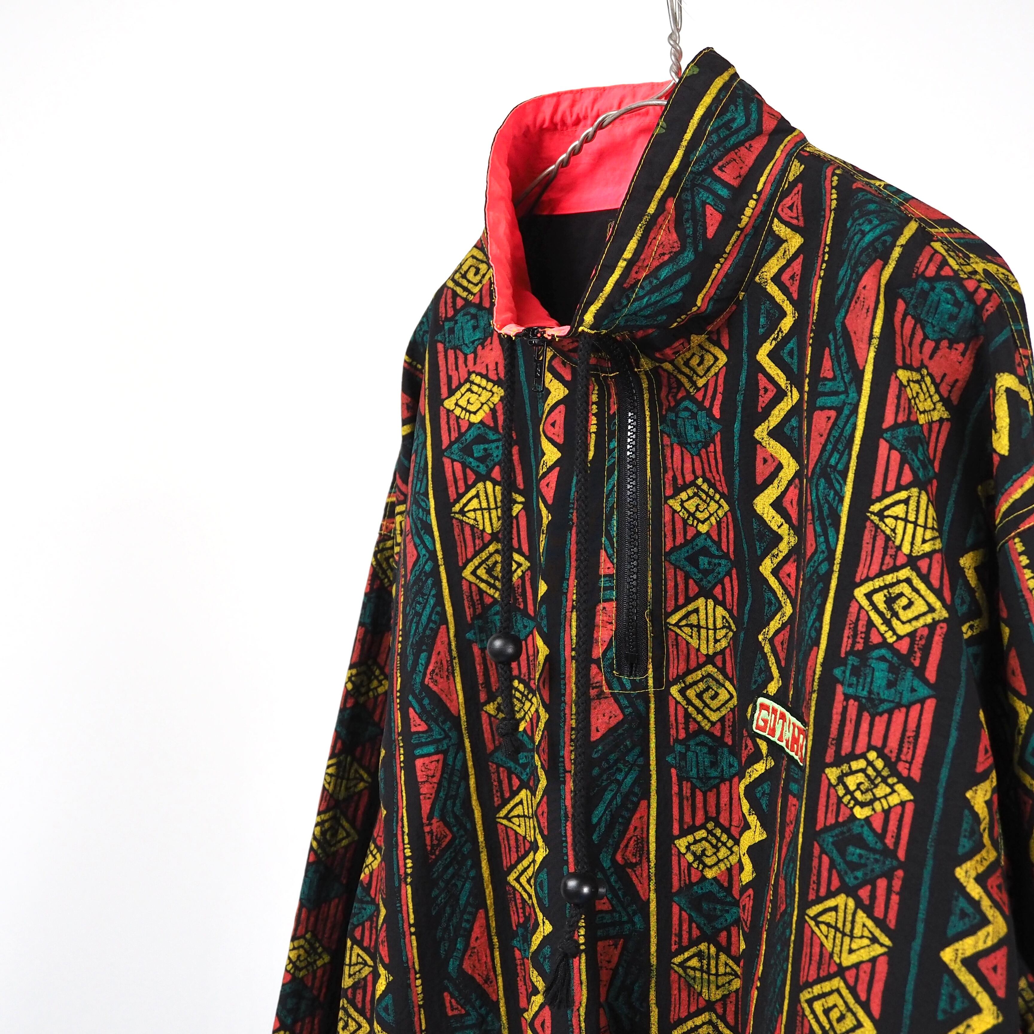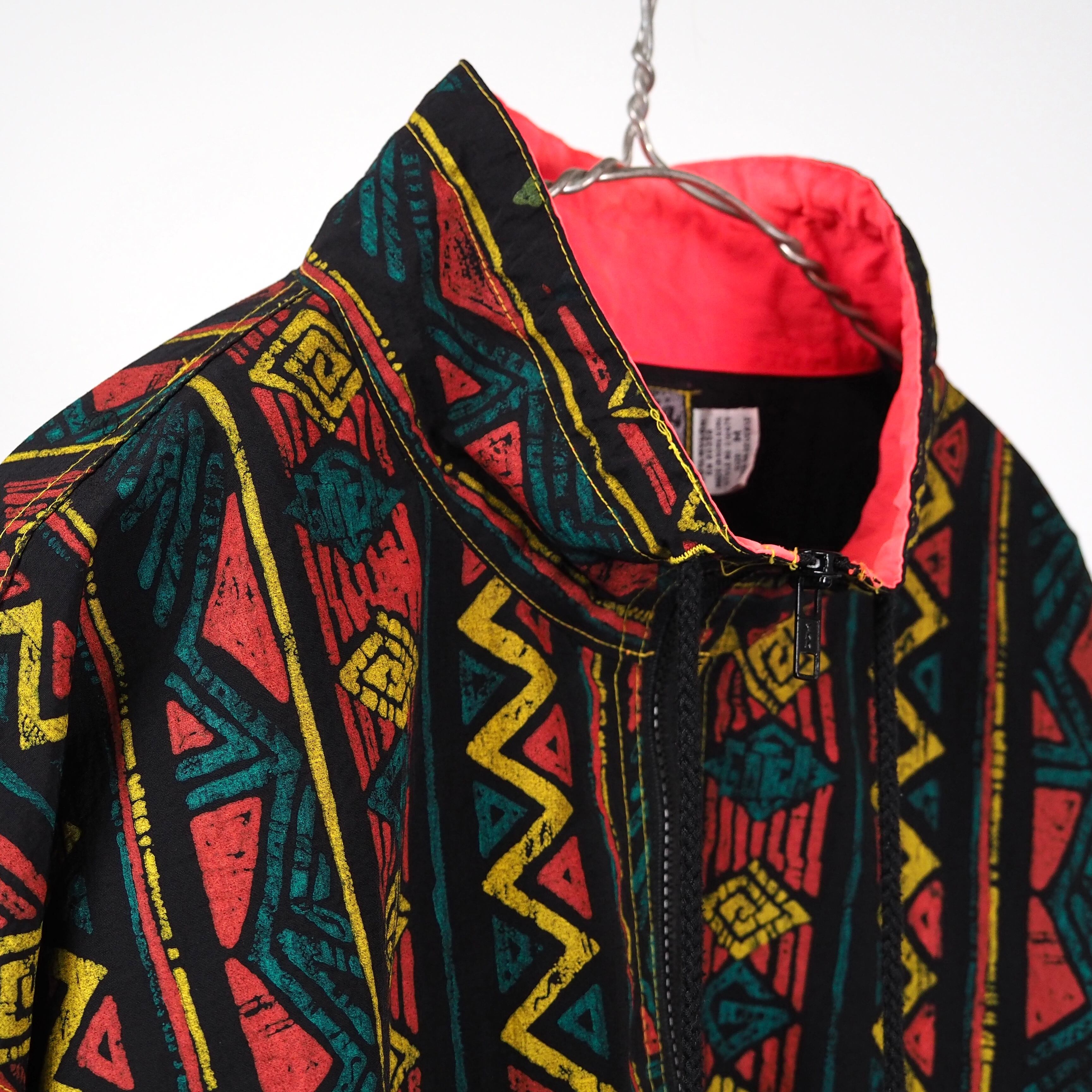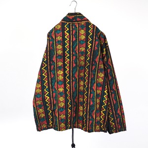 襟元のネオンカラーが目を惹く総柄ジャケット。