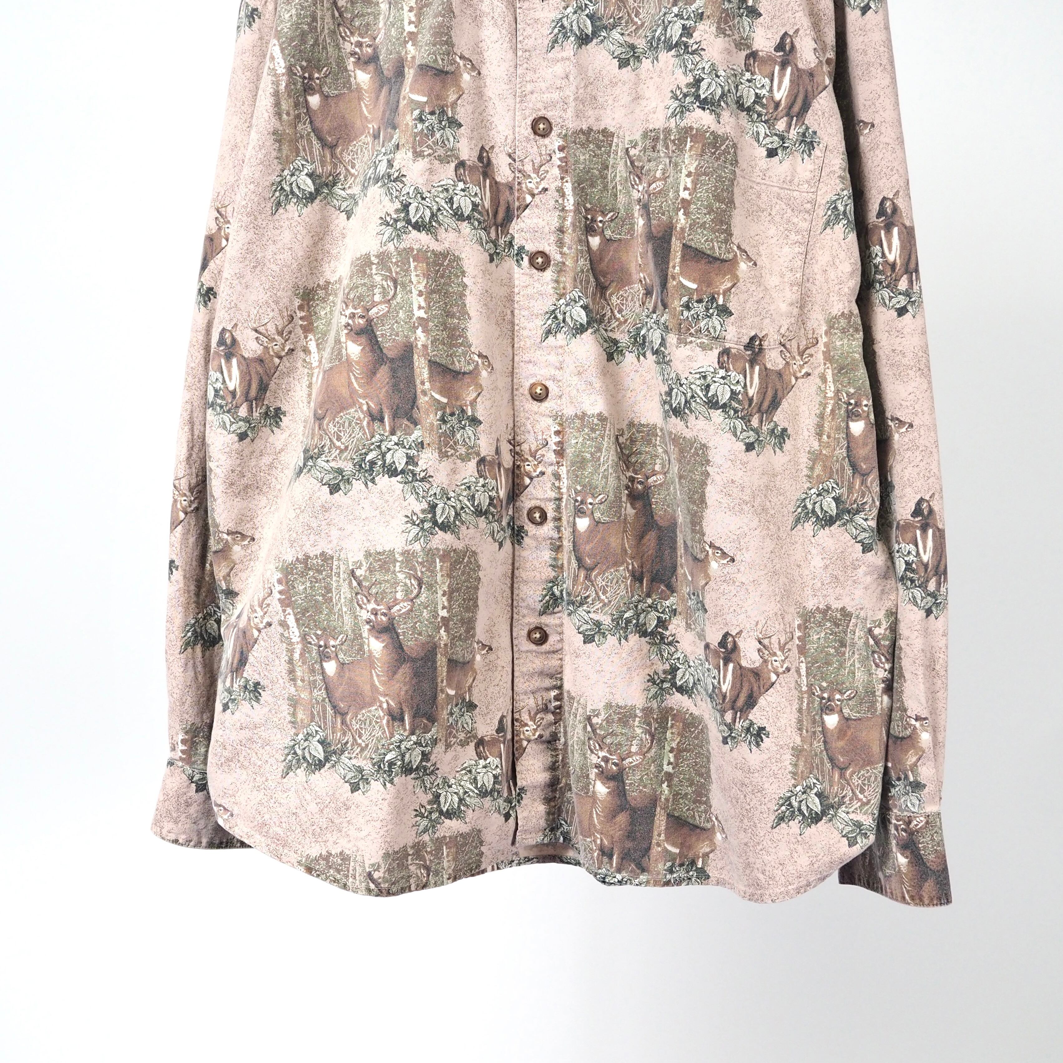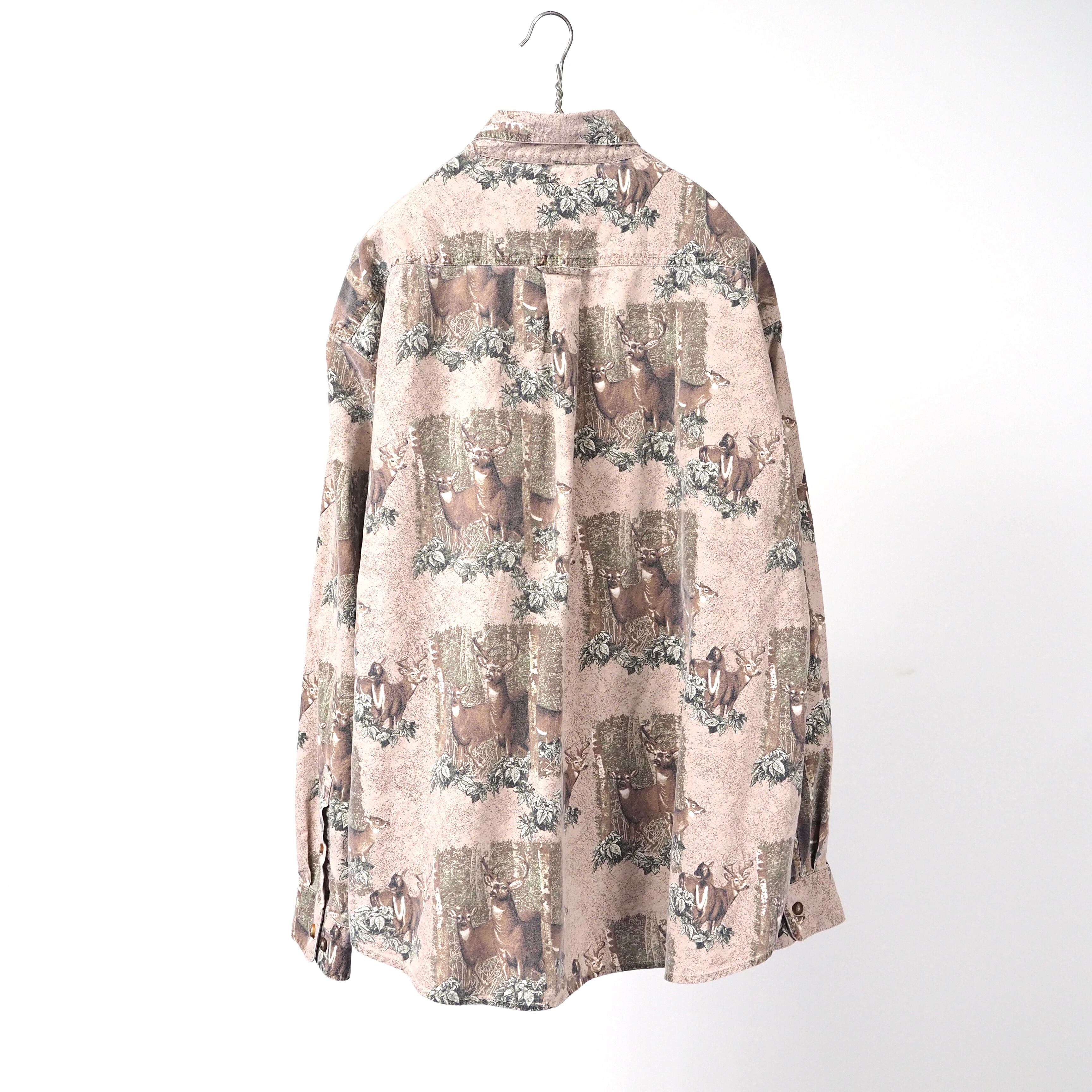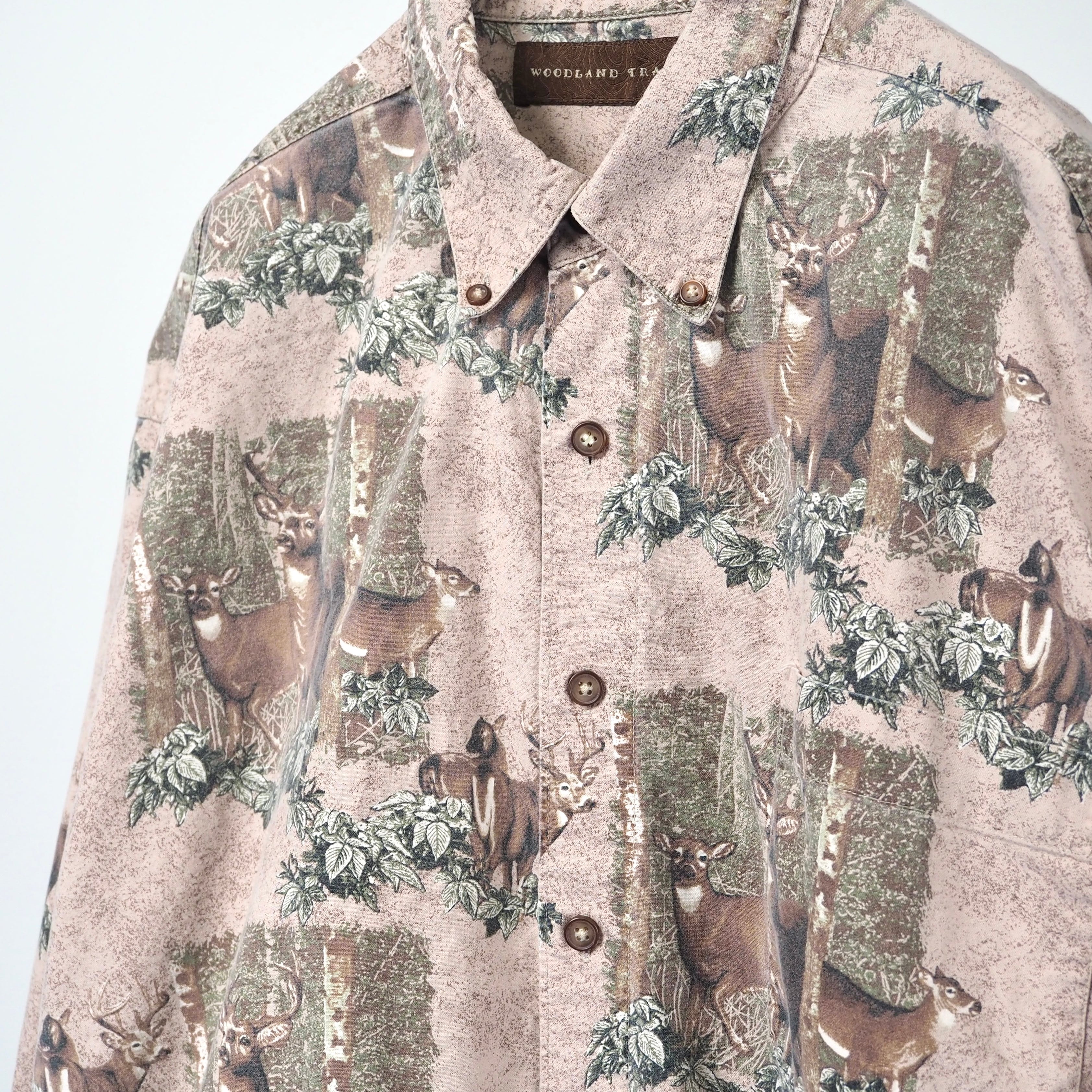 森と鹿がデザインされた総柄のボタンダウンシャツ。