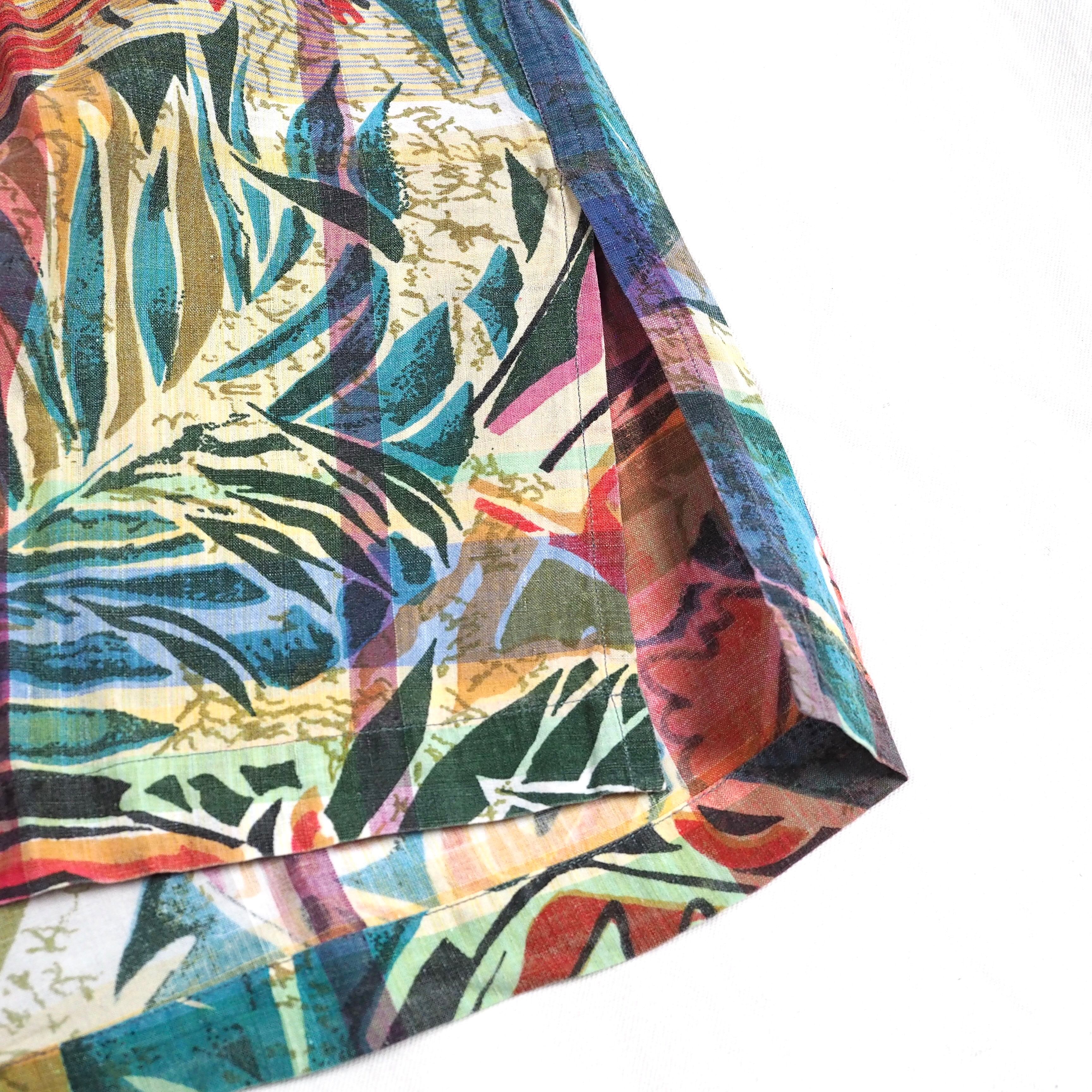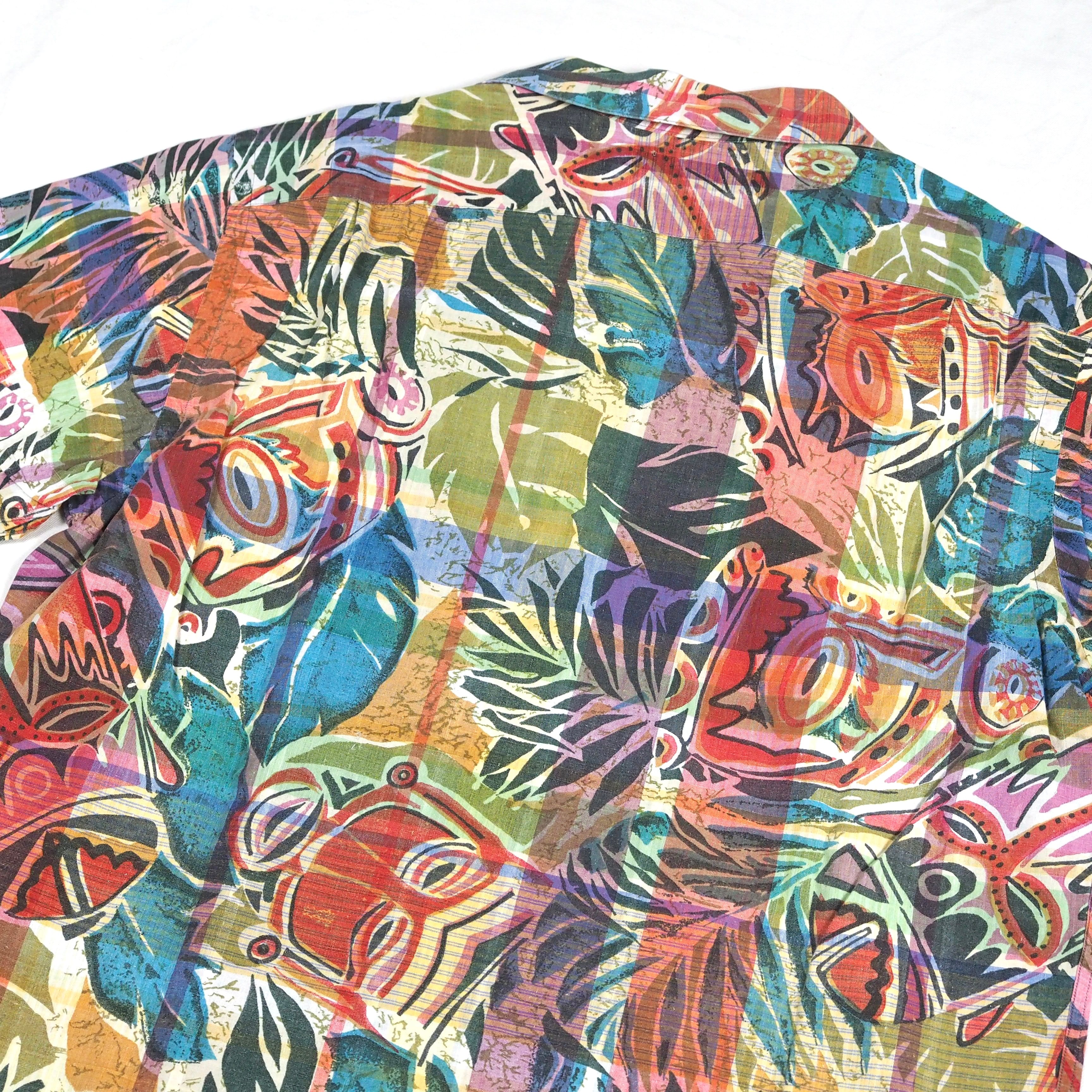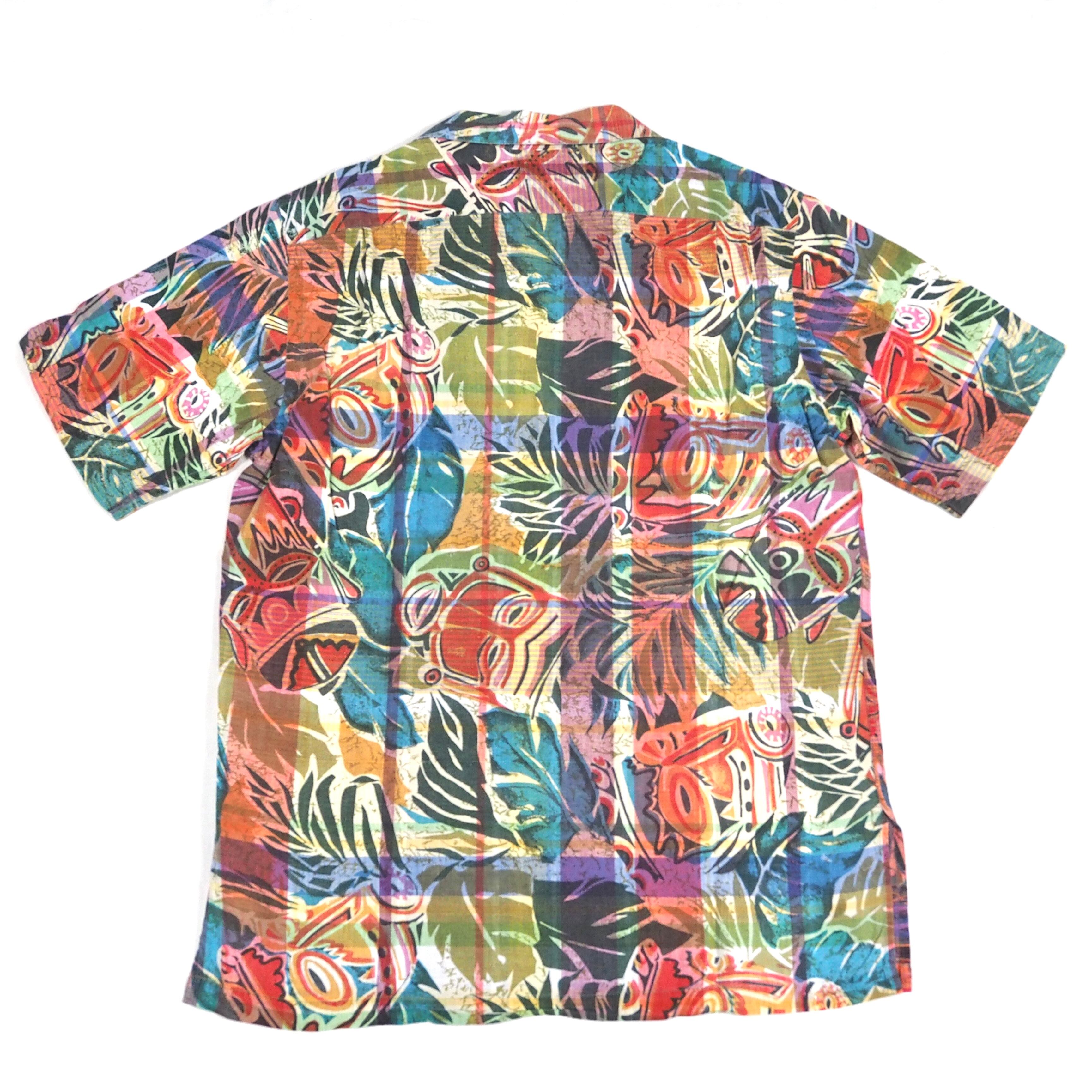 インディアマドラスの上にティキ柄がプリントされたスペシャルファブリックを使用した半袖オープンカラーシャツ。