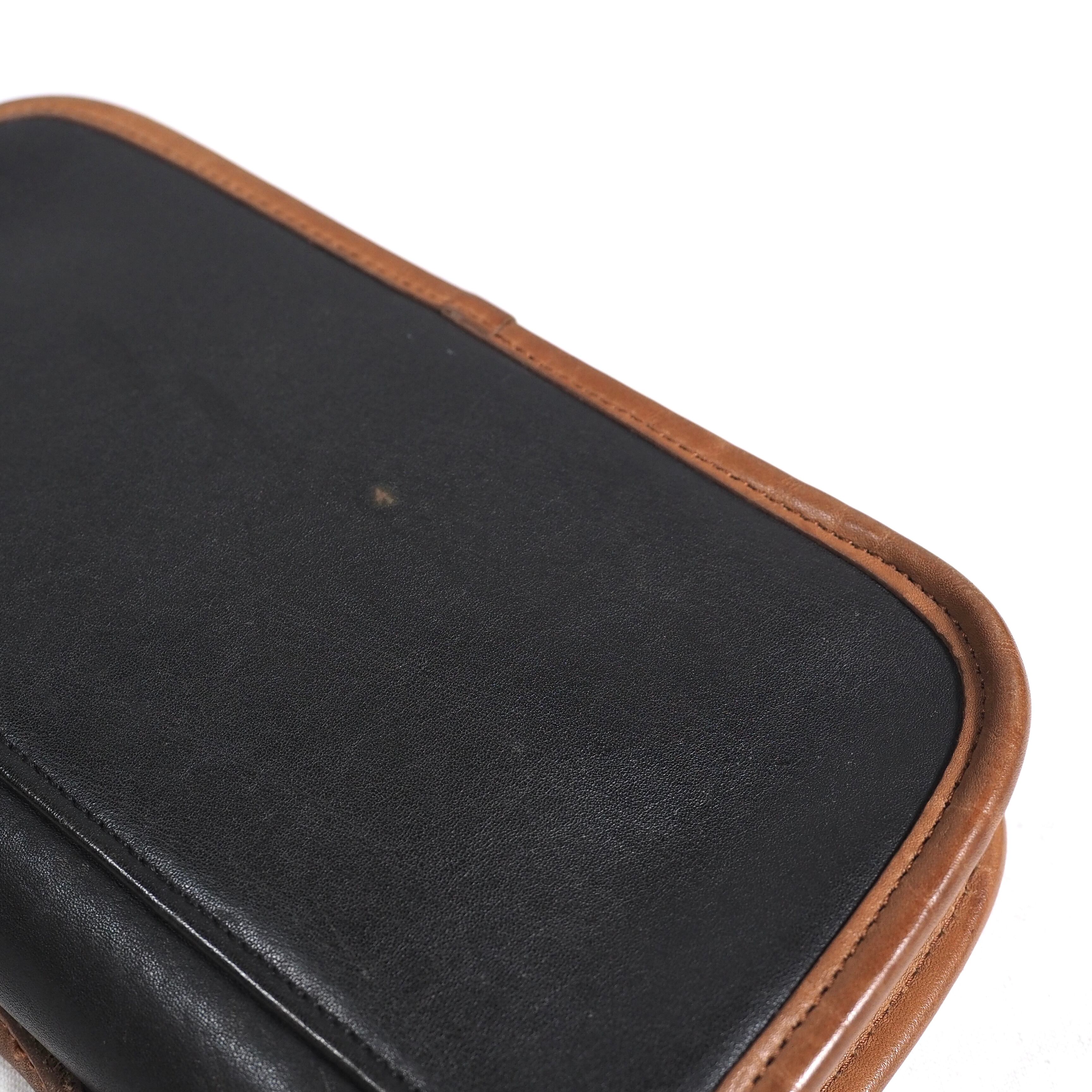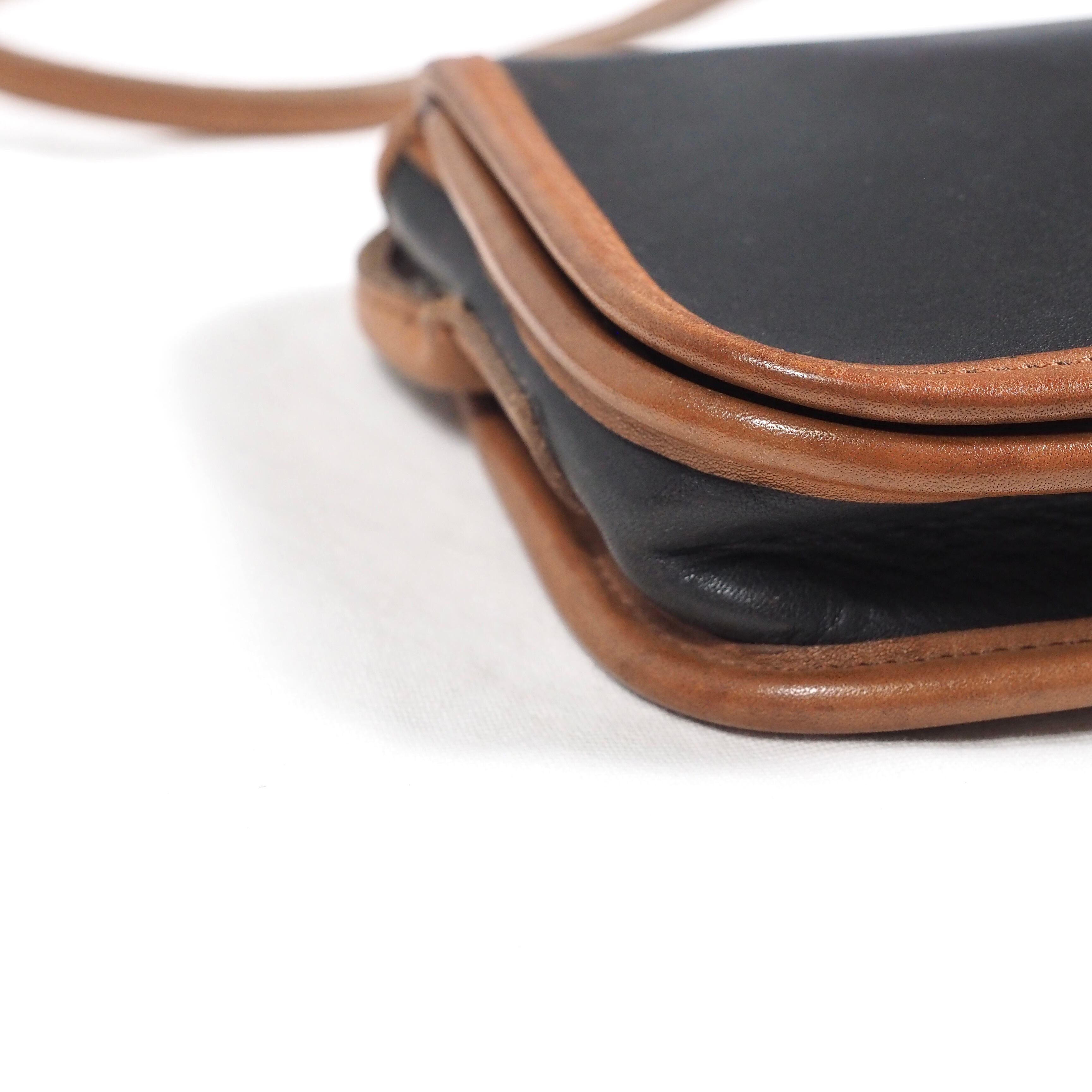 画像のようにブラウンのパイピング部分に僅かなシミがございます。使用感はございますがもっちりした質感でレザーのクラックや硬化はなく問題なくご使用頂けます。